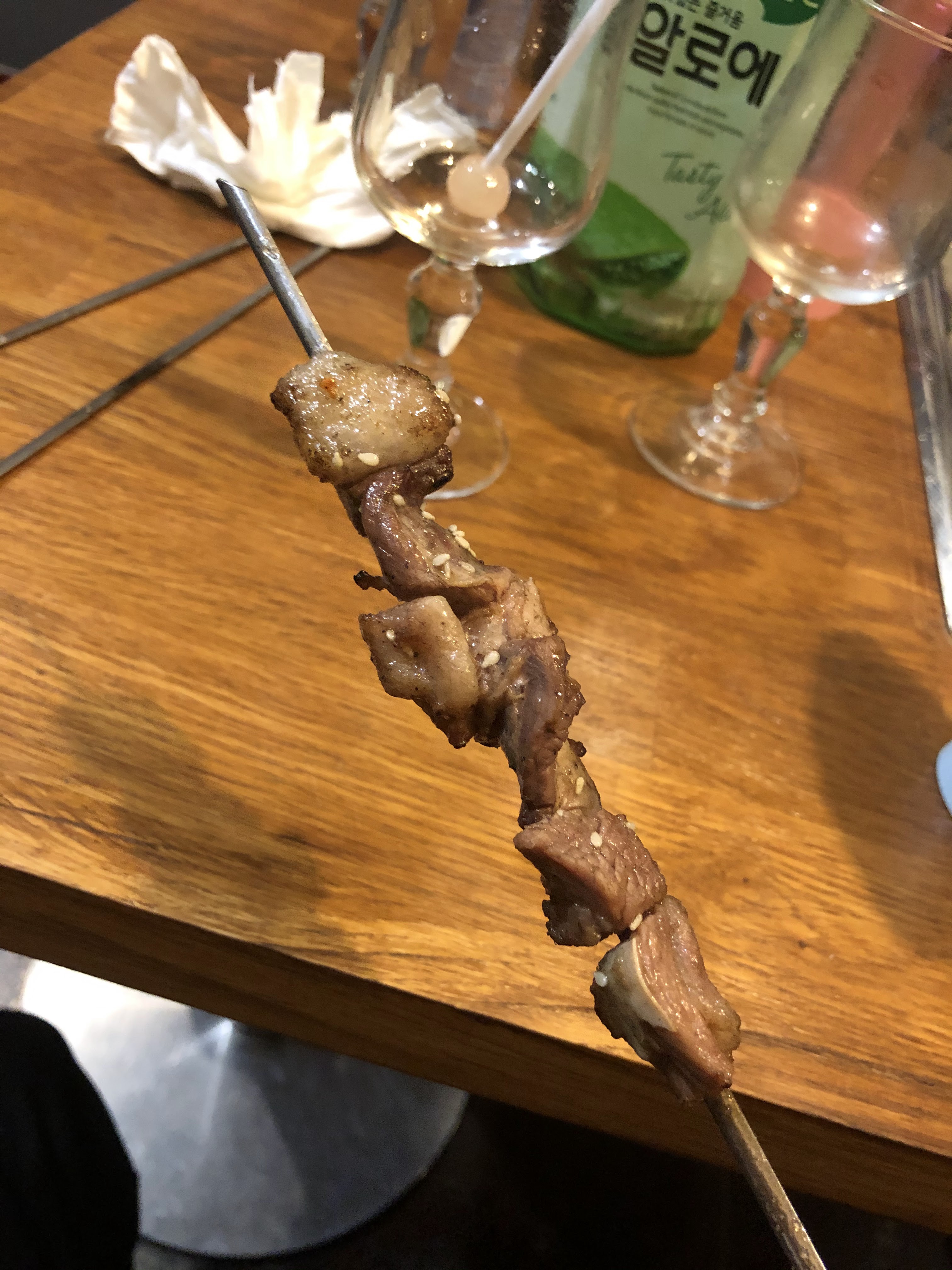 Franchement super! BBQ coréen à volonté des le 1er tour on était KO! Le concept de se faire servir et de commander un certain nombres de brochettes c’est cool ça évite de gaspillage et ça permet de se contrôler. On a droit à une entrée j’ai pris des raviolis (un plat de 12) et mon ami un bibimbap. On a aussi pris 8 brochettes par personnes et le bbq de bœuf, poulet et porc. C’était juste incroyable! Les quantités étaient très généreuses. La nourriture bonne et chaude. Le seul hic c’est qu’ils ne parlent pas français c’est donc assez difficile de communiquer mais mis à part ça je recommande sans hésiter.