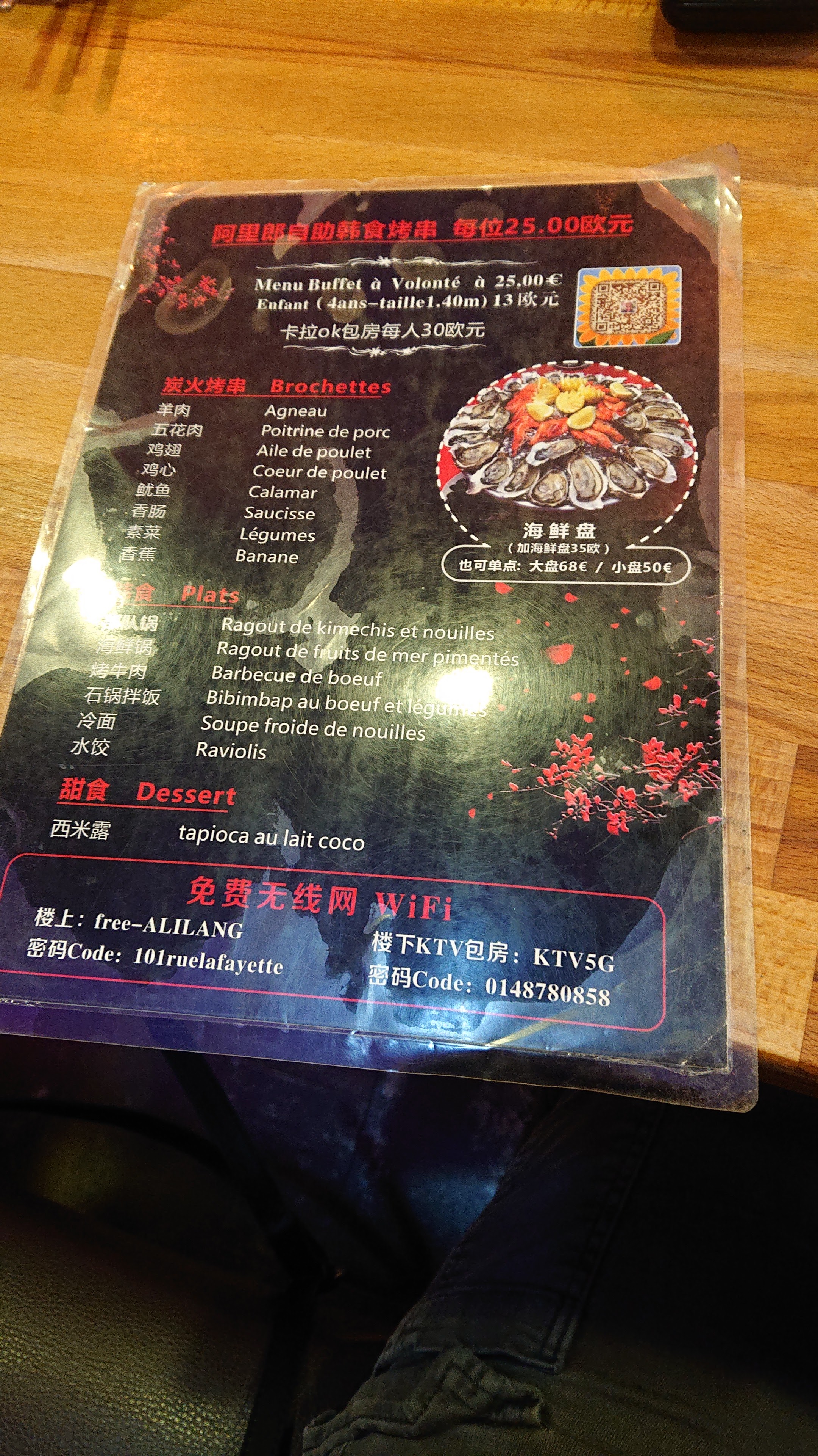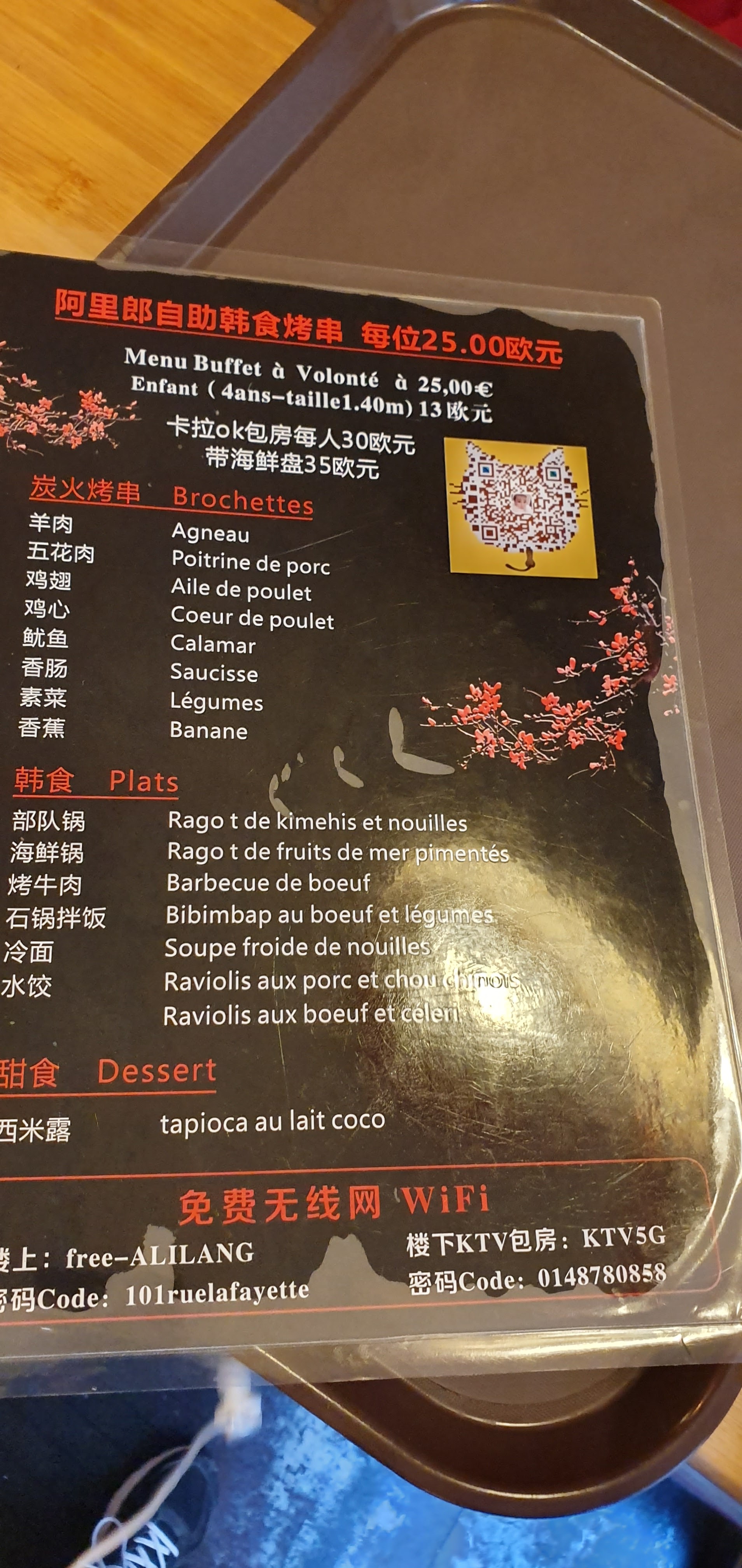 Restaurant coréen. Formule grill à volonté à 28 euros ! Attention réduction seulement pour enfant de moins 140 cm !!