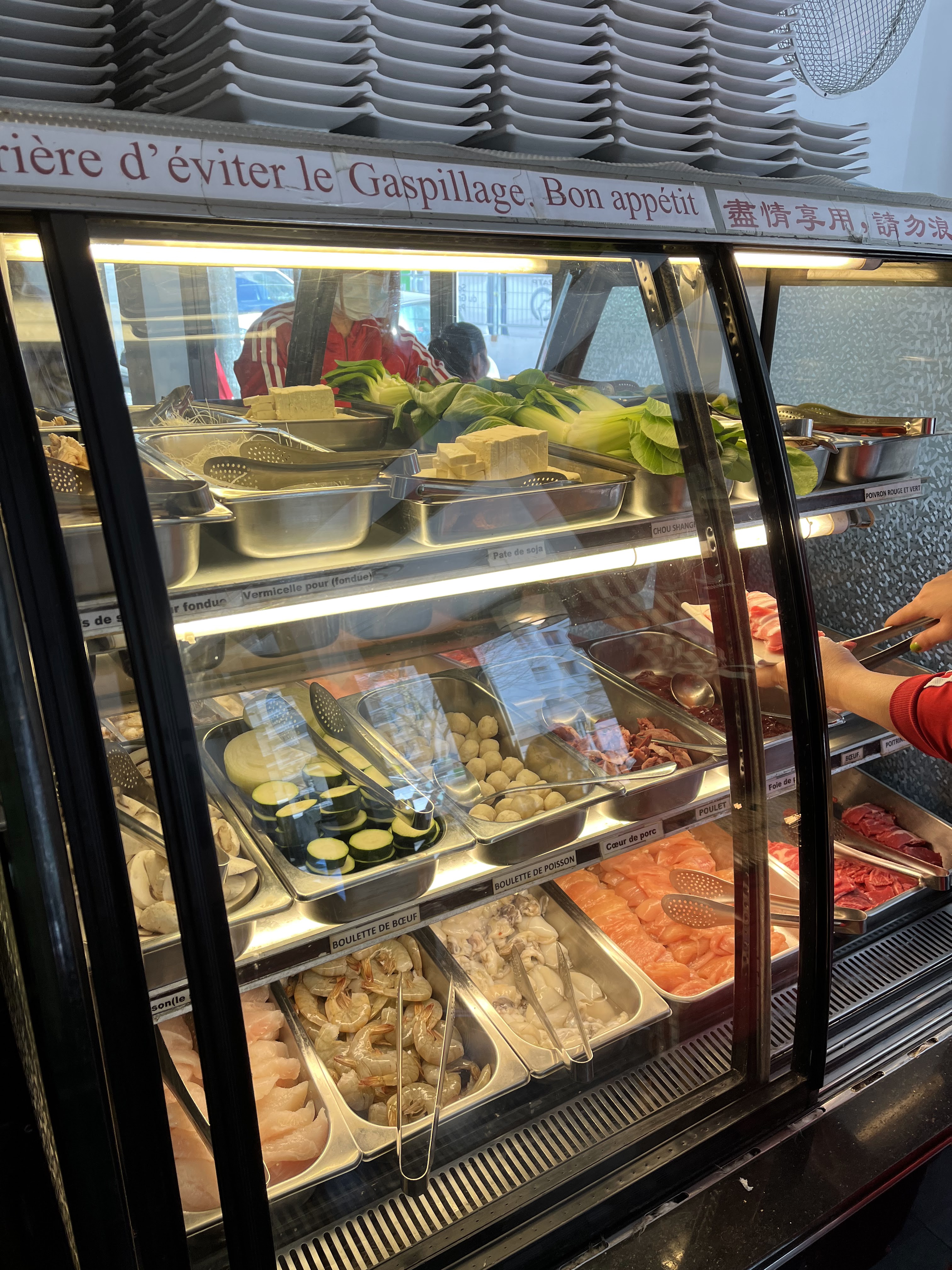 Je m'y suis rendue avec deux autres amis et je vous avoue en avoir gardé un sentiment plutôt mitigé Ce qui nous est proposé est bon (correct on peut dire) mais le manque de certains aliments phares m'a quand même manqué comme les fameux enokis ou les rouleaux de boeuf/agneau sinon la proposition niveau viandes m'a plu Peut-être aussi un peu plus de propositions niveau frit ? Parce qu'à part quelques nems et des raviolis rien de plus L'endroit est plutôt exigu avec très peu de place pour passer de la vitrine légumes à celle viande, je pense que celà aurait pû être mieux aménagé pour faciliter le passage Le personnel fait son travail comme il faut pour aider sur les machines donc pas de panique si vous ne vous y connaissez pas Je ne pense pas revenir parce qu'il ne m'a tant marqué et 23€ (si vous êtes au moins deux) me semble peut-être beaucoup pour les choix proposés MAIS vous pouvez avoir grillades et bouillon ensemble pour ce prix