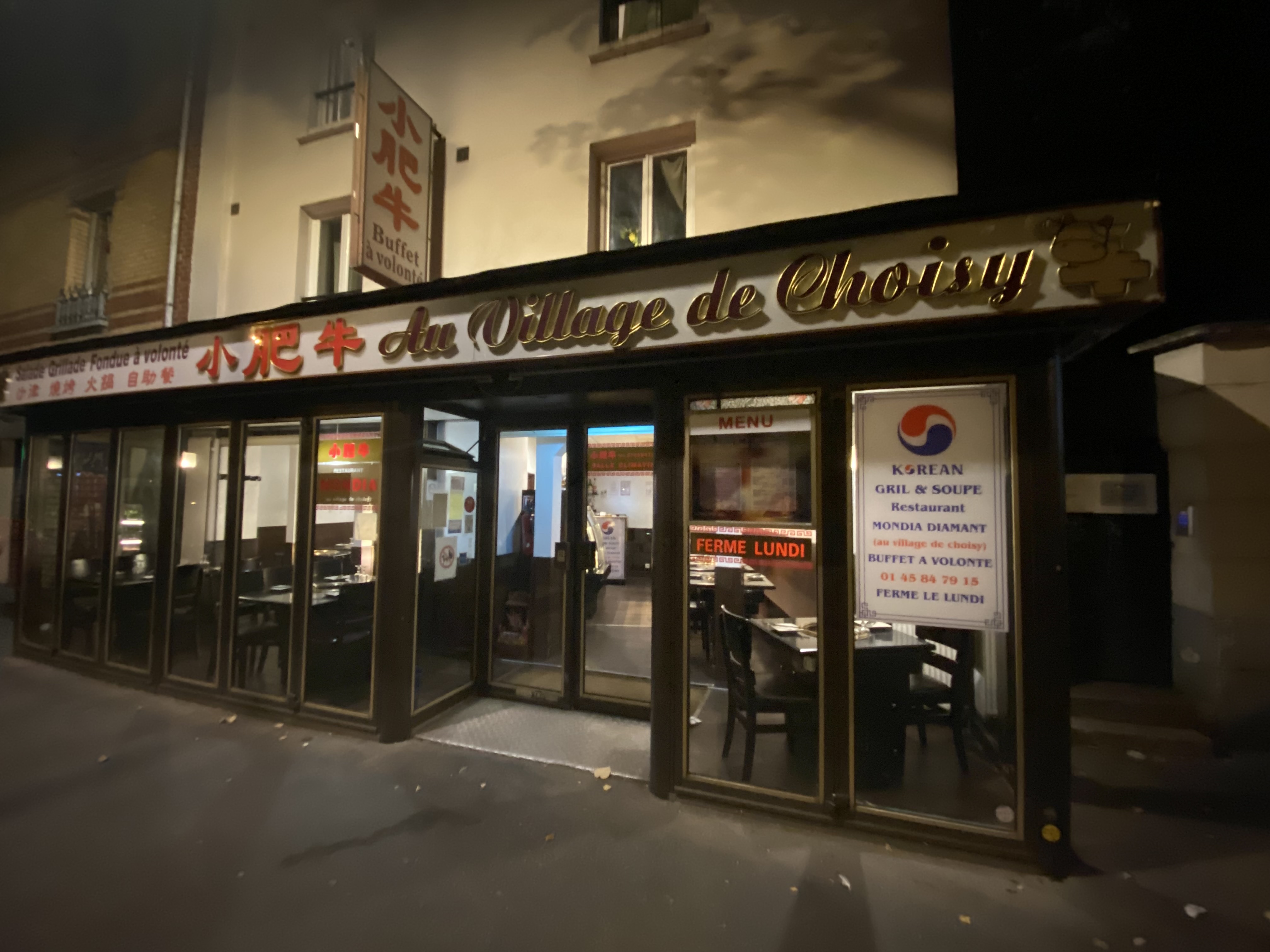 Vous voulez vous régaler d'une véritable fondue Coréenne ou d'un barbecue Coréen ? Le village de Choisy est la bonne adresse. Le personnel est aux petits soins et très attentionné. Si il s'agit de votre première visite, pas de stress, on vous explique tout. Vous pouvez panacher fondue et barbecue sur la table. Et tout est à volonté et sans cesse réapprovisionné. C'est délicieux et l'on sort plus que rassasié. Prévoyez un tee-shirt car lorsque tous les barbecues fonctionnent, il fait très chaud.
