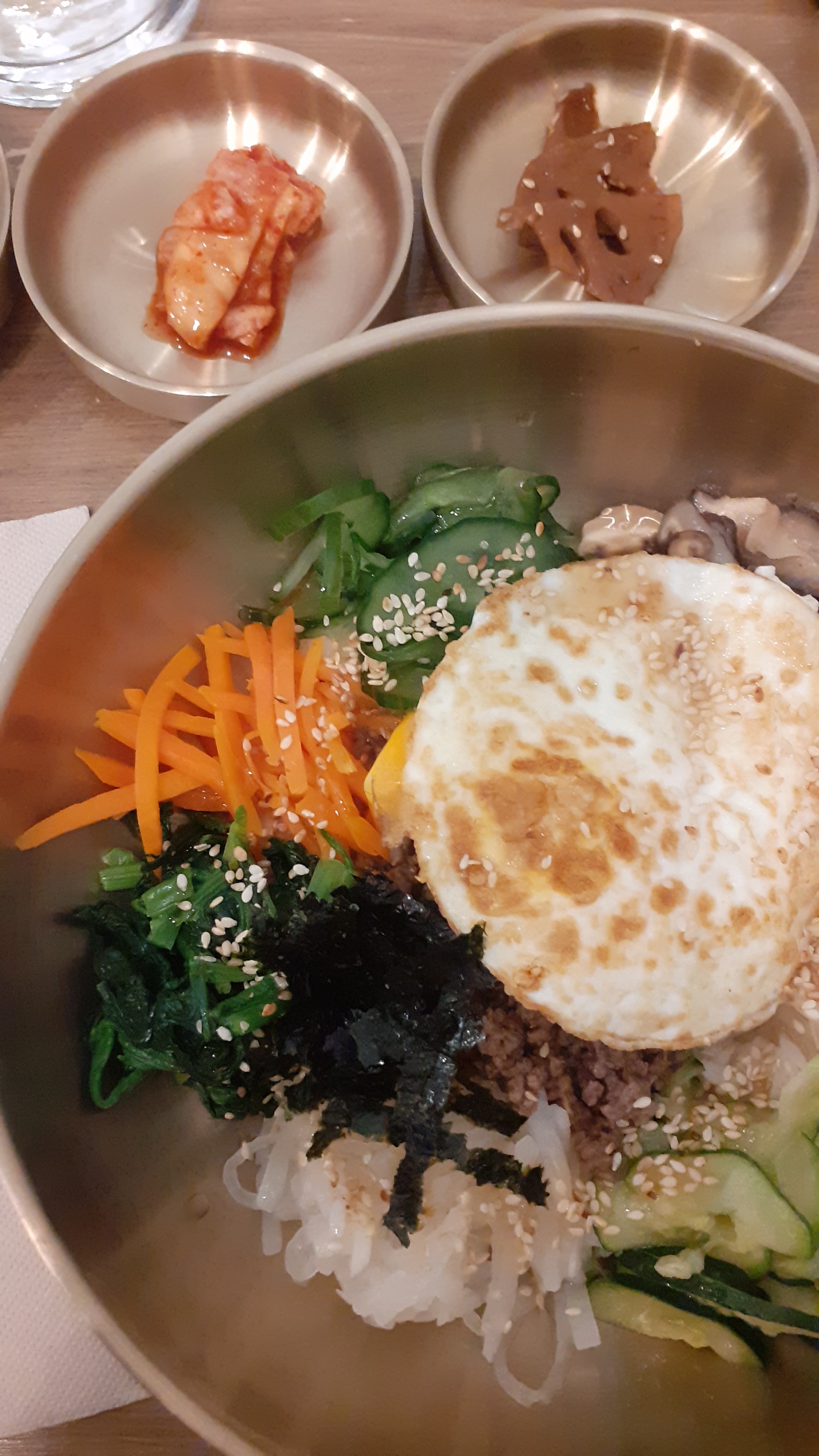Superbe nourriture coréenne requinquante, j’ai pris les nouilles a base de bouillon de bœuf épicé que j’ai particulièrement aimé. La propriétaire adorable du restaurant, qui s’occupait à la fois du service et de la cuisine, m’a offert un bol de riz pour terminer le bouillon en fin de repas à la manière coréenne. De plus, nous recevons avec chaque plat trois condiments coréens histoire de se mettre l’eau à la bouche. Mention spéciale pour la sauce à base de Gochujang qui accompagnait le Bimbimbap de mon ami, particulièrement excellente, je demanderais la recette la prochaine fois !