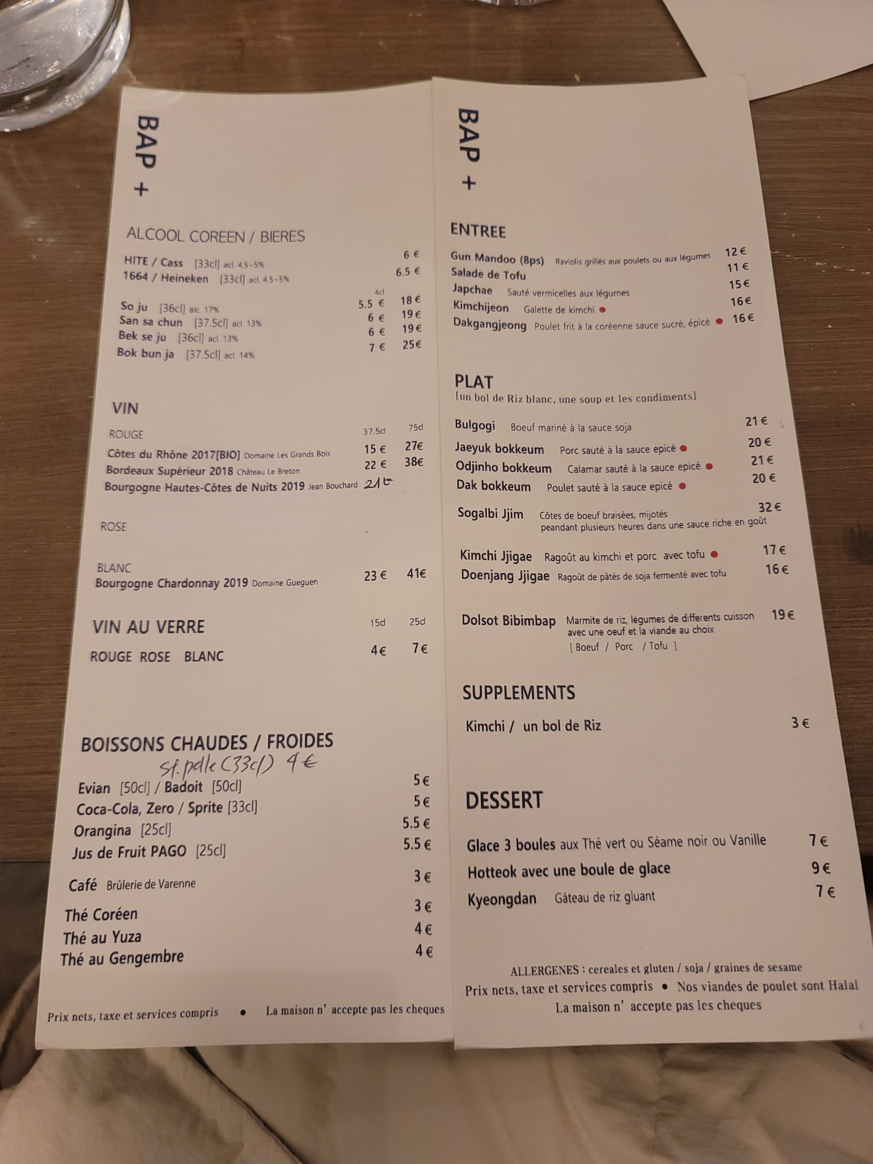 Je visitais Paris pendant trois jours et j'avais envie de cuisine coréenne, en particulier de la saveur du gochujang. Ainsi, en cherchant des restaurants coréens à proximité de mon hôtel, j’en ai trouvé deux et j’ai choisi Bap+. Et je ne l'ai pas regretté. Je cherchais du poulet assaisonné et ils avaient le plat le plus authentique en dehors de la Corée. Le personnel était très sympathique et tout était parfait, ce petit endroit confortable livrait des délices culinaires assiette après assiette. Je voulais rester un peu plus longtemps et prendre quelques collations, mais je devais assister à une réunion. Quoi qu'il en soit, je recommande vivement cet endroit à Paris, et si vous êtes particulièrement intéressés par les snacks, alors le poulet et la bière Cass et le soju, Bap+ se fera un plaisir de vous les proposer. Merci beaucoup Bap+. De plus, ajoutant à l'ambiance coréenne déjà authentique, la musique K-pop jouée en arrière-plan était une touche vraiment agréable !🫰🫰