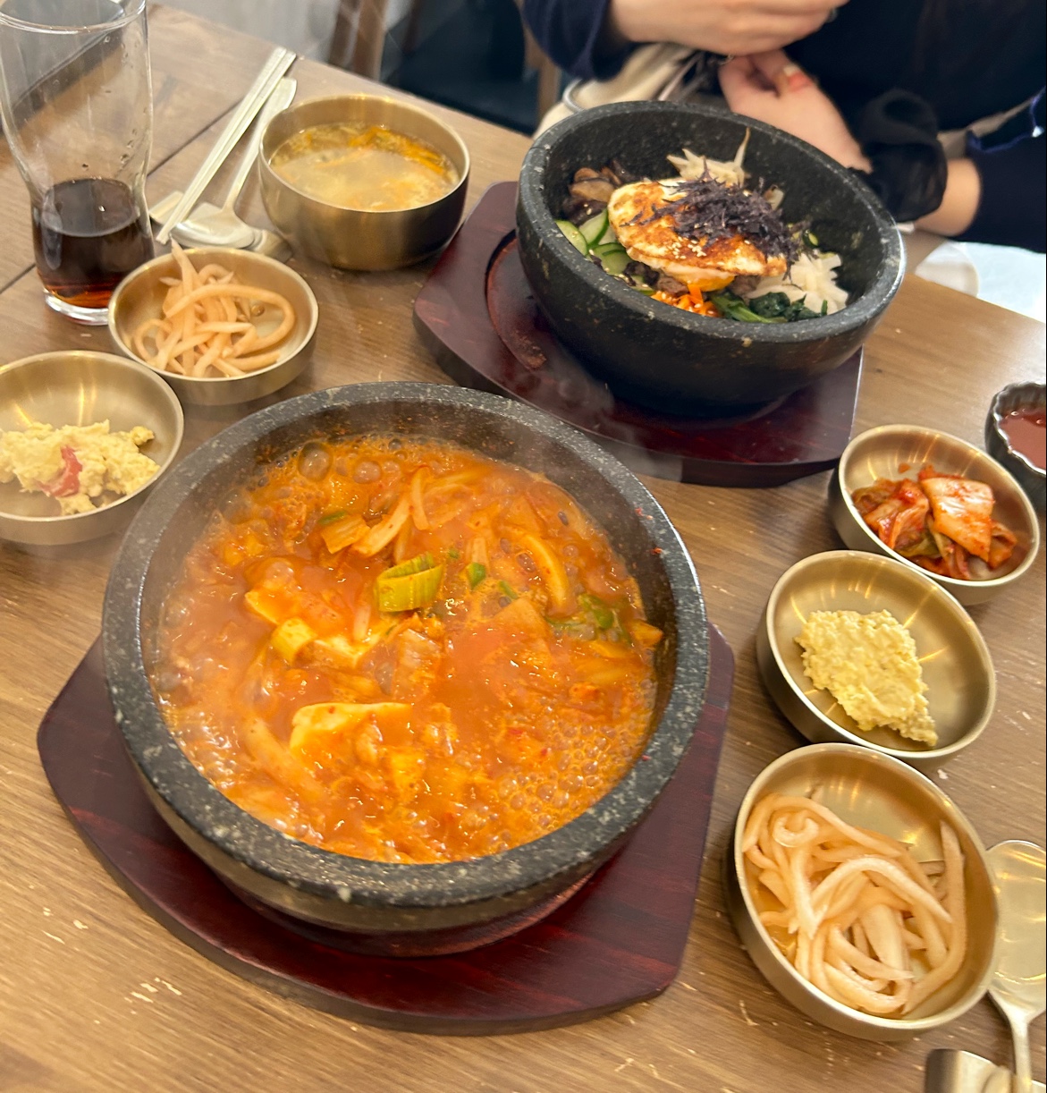 Je ne pensais pas que la cuisine coréenne serait aussi importante pendant mon voyage de deux semaines. Bibimbap en pot de pierre, ragoût de kimchi, porc, nouilles froides Tout était délicieux. Nous prenons notre dernier dîner de cuisine coréenne et partons. J'étais reconnaissant de voir les habitants apprécier également la cuisine coréenne. Restez en bonne santé et savourez longtemps la délicieuse cuisine coréenne ~