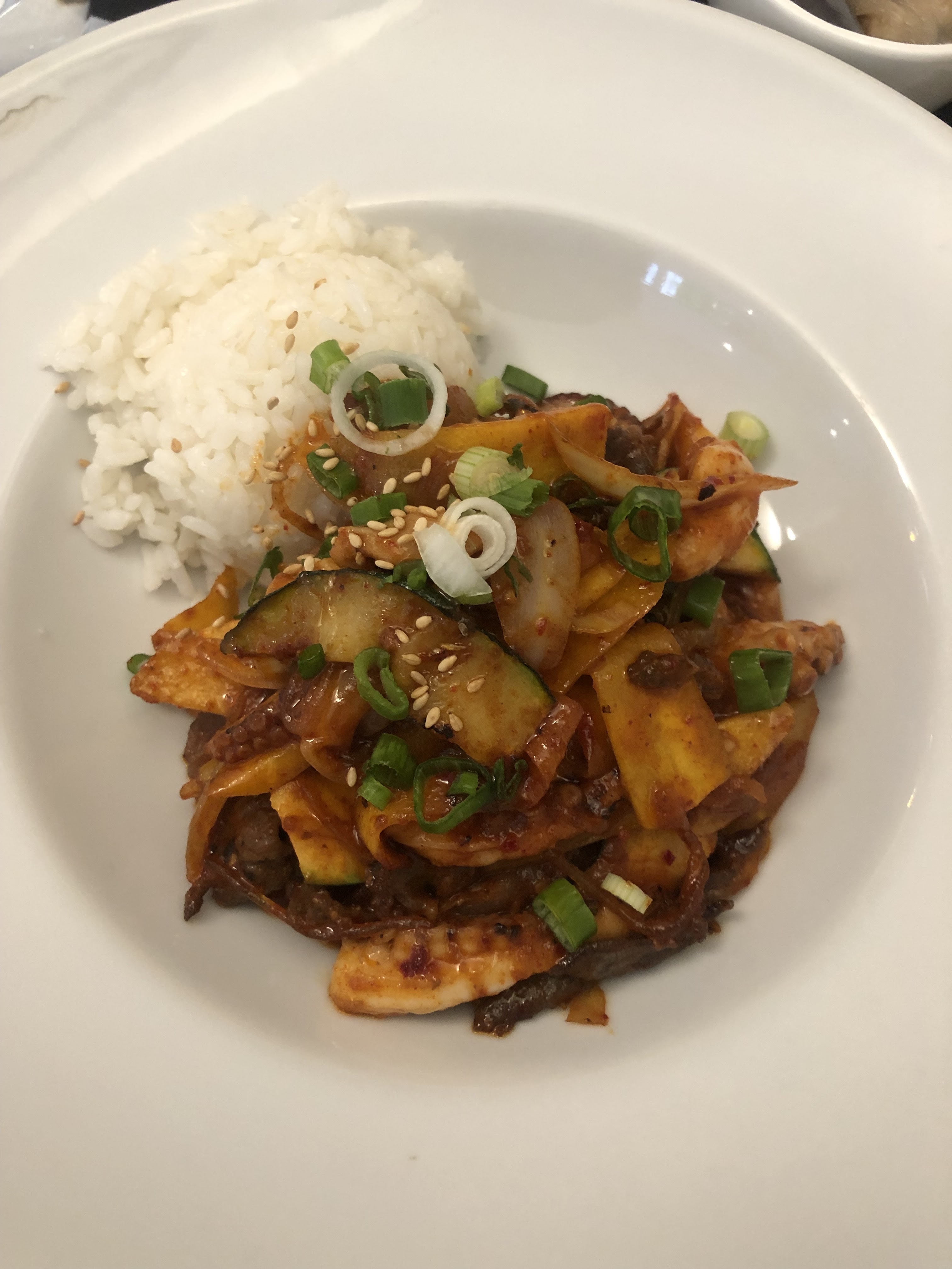 Le bibimpap comprend du champignons secs crus, du bœuf avec un fort goût de viande non marinée, et une boule d'épinards presque crus et du riz. C'est tout. Loin des bibimpap mangés ailleurs. Pas d'accompagnement comme le Kimchi et compagnie. Quand j'ai demandé s'il n'y avait pas d'œuf dans la bibimpap, la serveuse ou gérante me dit qu'il n'y en pas dans le menu.