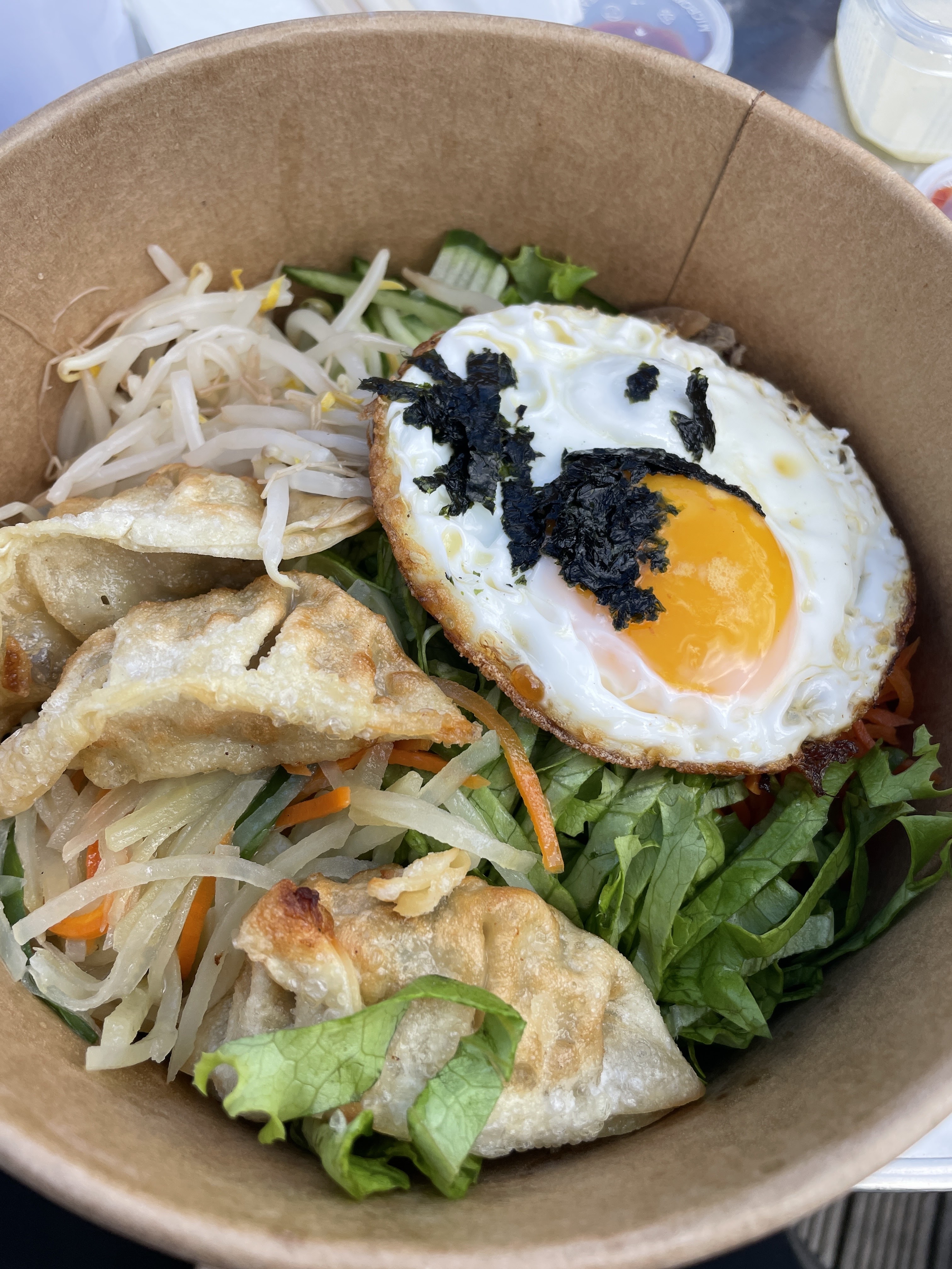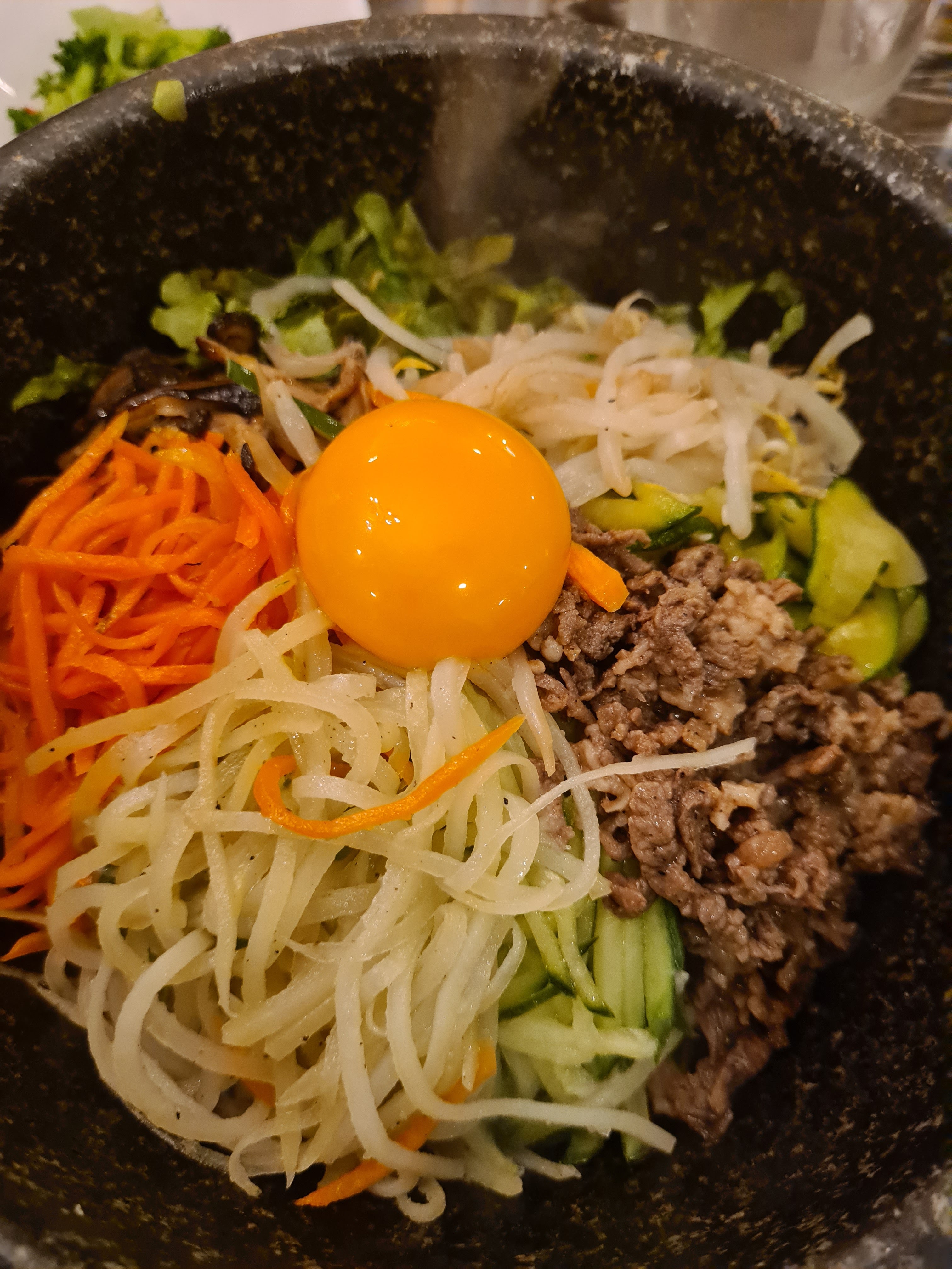 Il y avait foule ce jour là, des asiatiques principalement, ce qui pour moi est bon signe pour un resto. J'ai mangé un très bon bibimbap chaud, dans le bol en pierre. Excellent parce que servi avec tous les accompagnements tels que kimchi, brocolis, sauces piquantes, soupe miso et même 4 gyoza. Service impeccable. Quand l'addition tombe à 13€, j'étais contente. Imbattable. Je recommande. Je reviendrai. Déco un peu imitation resto de campagne pas désagréable bien qu'un peu incongrue dans ce quartier.