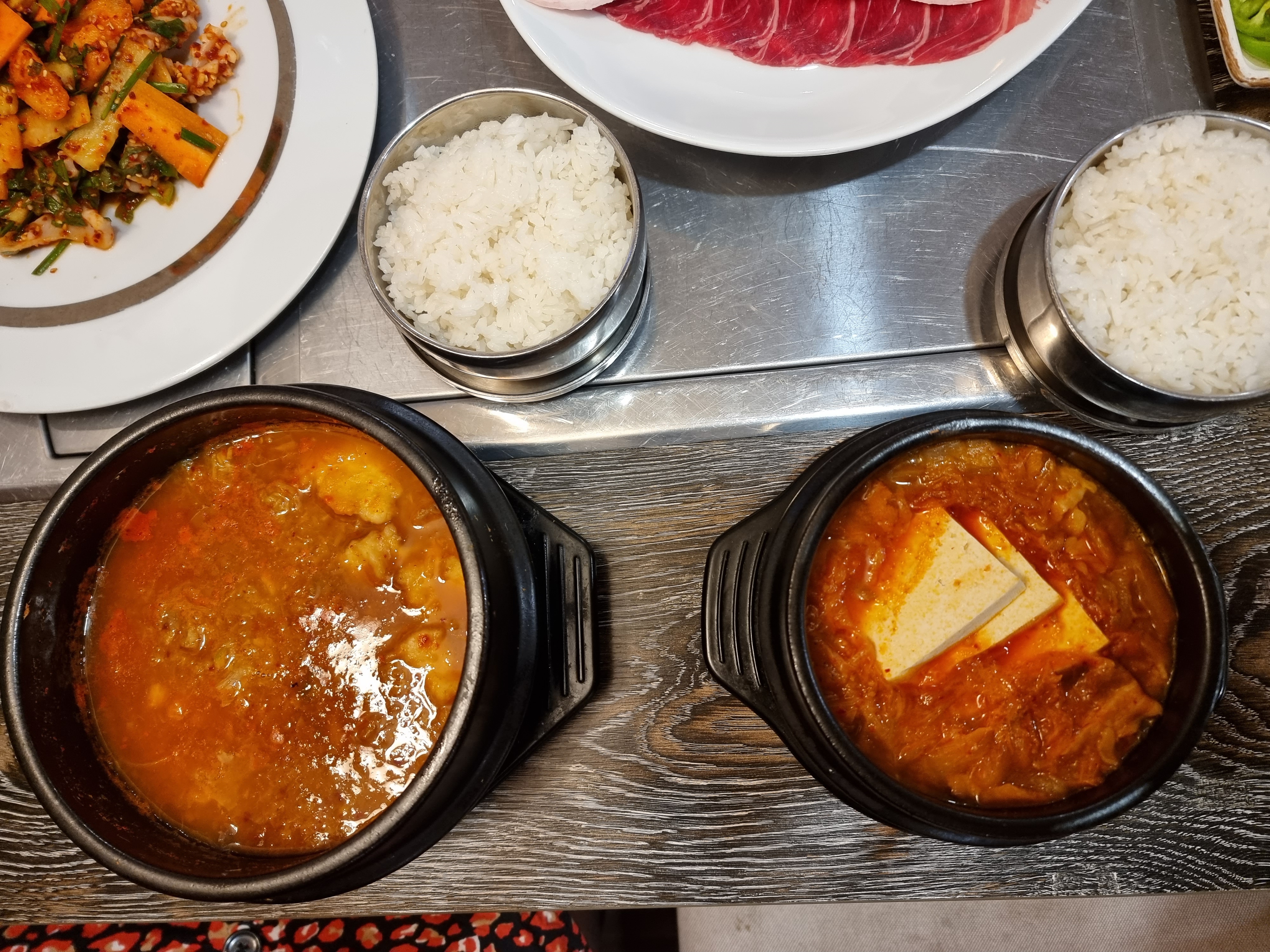 C'est compliqué et beaucoup de Coréens l'aiment, et le ragoût de kimchi a un goût artificiellement sucré, probablement parce qu'ils ont ajouté du sucre. Mais je le mange quand même parce qu'il me rappelle la cuisine coréenne. Le riz supplémentaire coûte 3 euros chacun. Cher