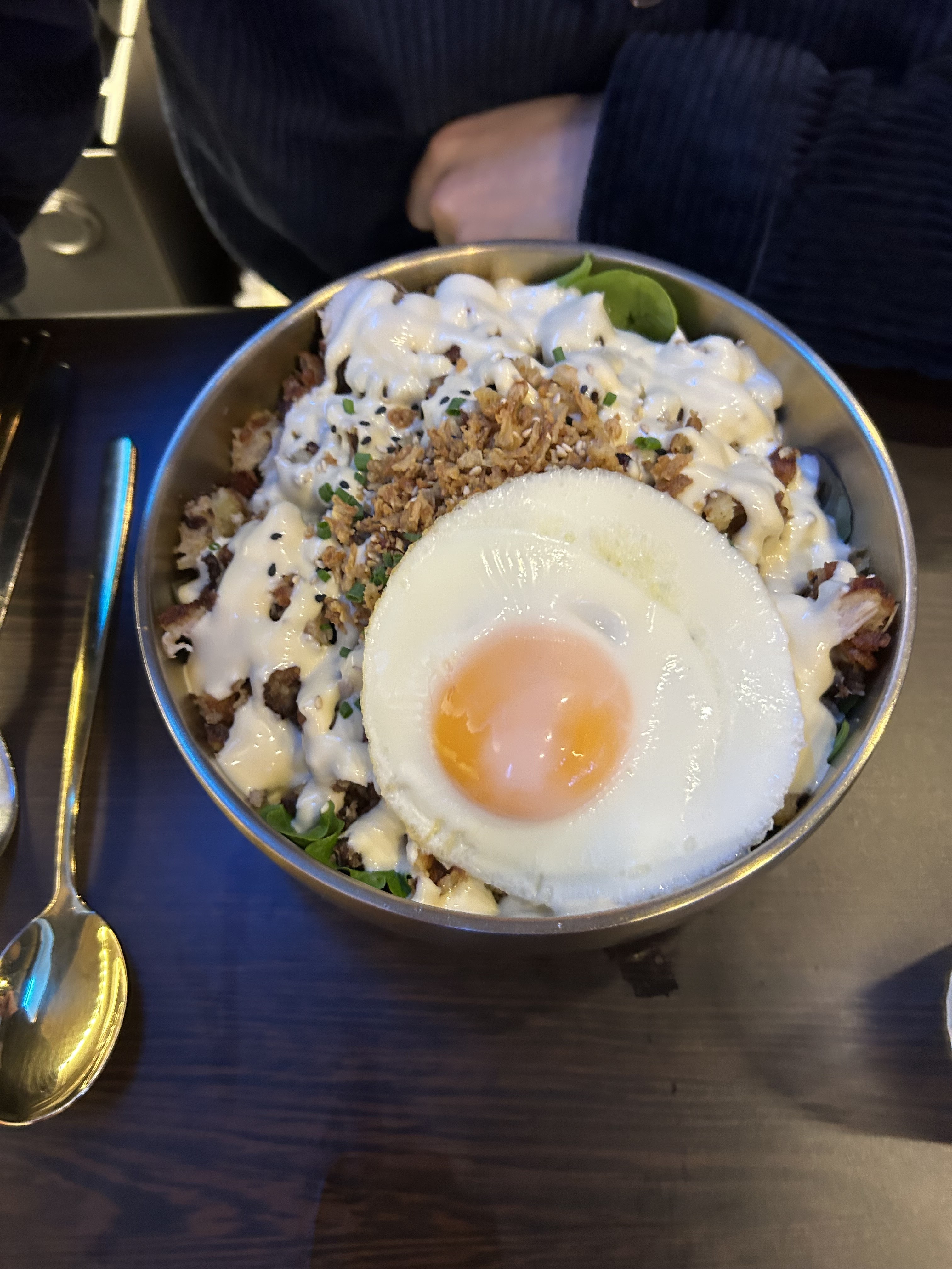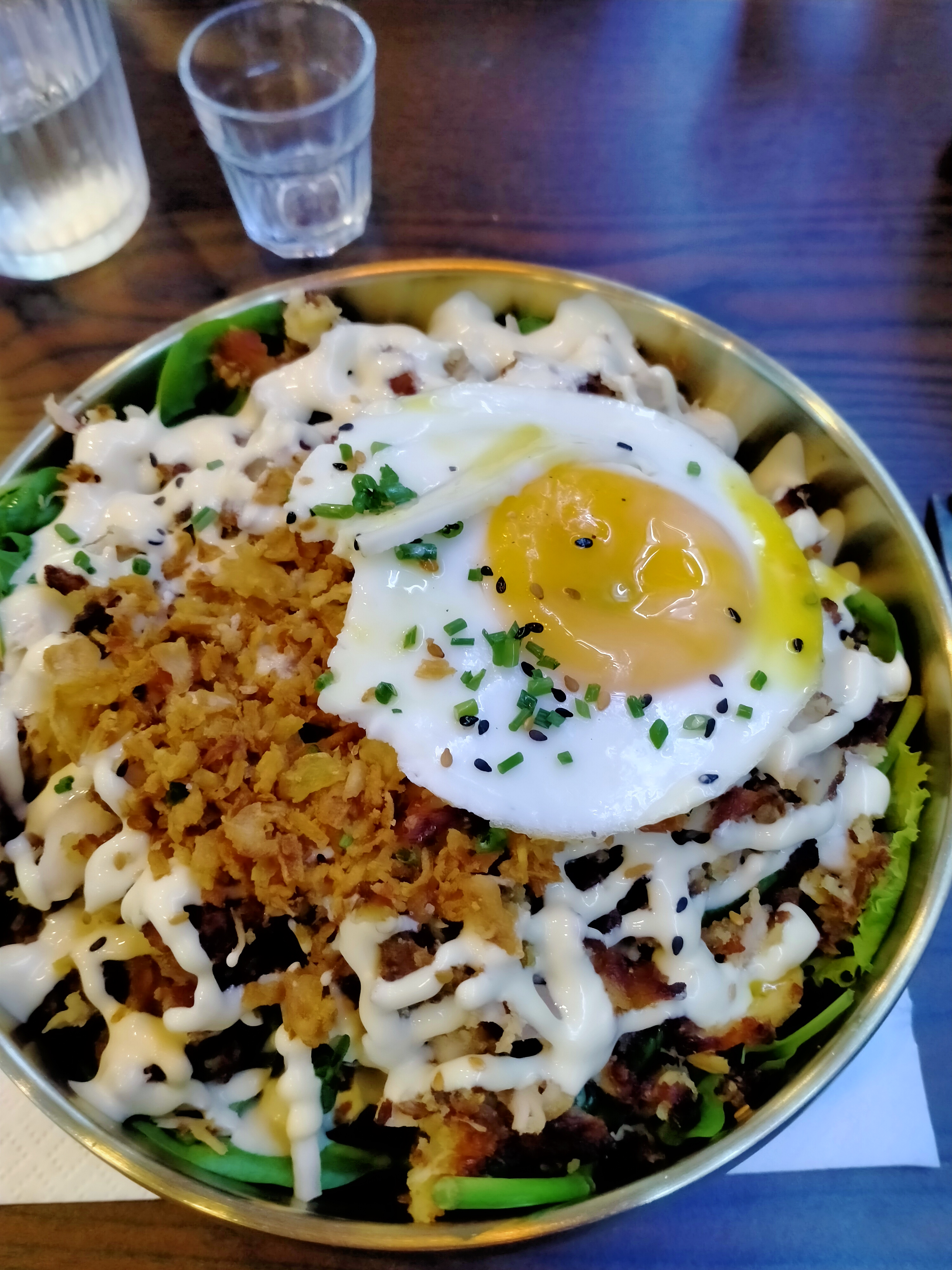 J'ai pris un bibimbap à emporter espérant retrouver de ma Corée natale dans mon bol. Les saveurs sont décevantes, pas de banchan (juste un peu de kimchi mais dans le bibimbap...). Donc 13€ pour ça, ça fait cher...