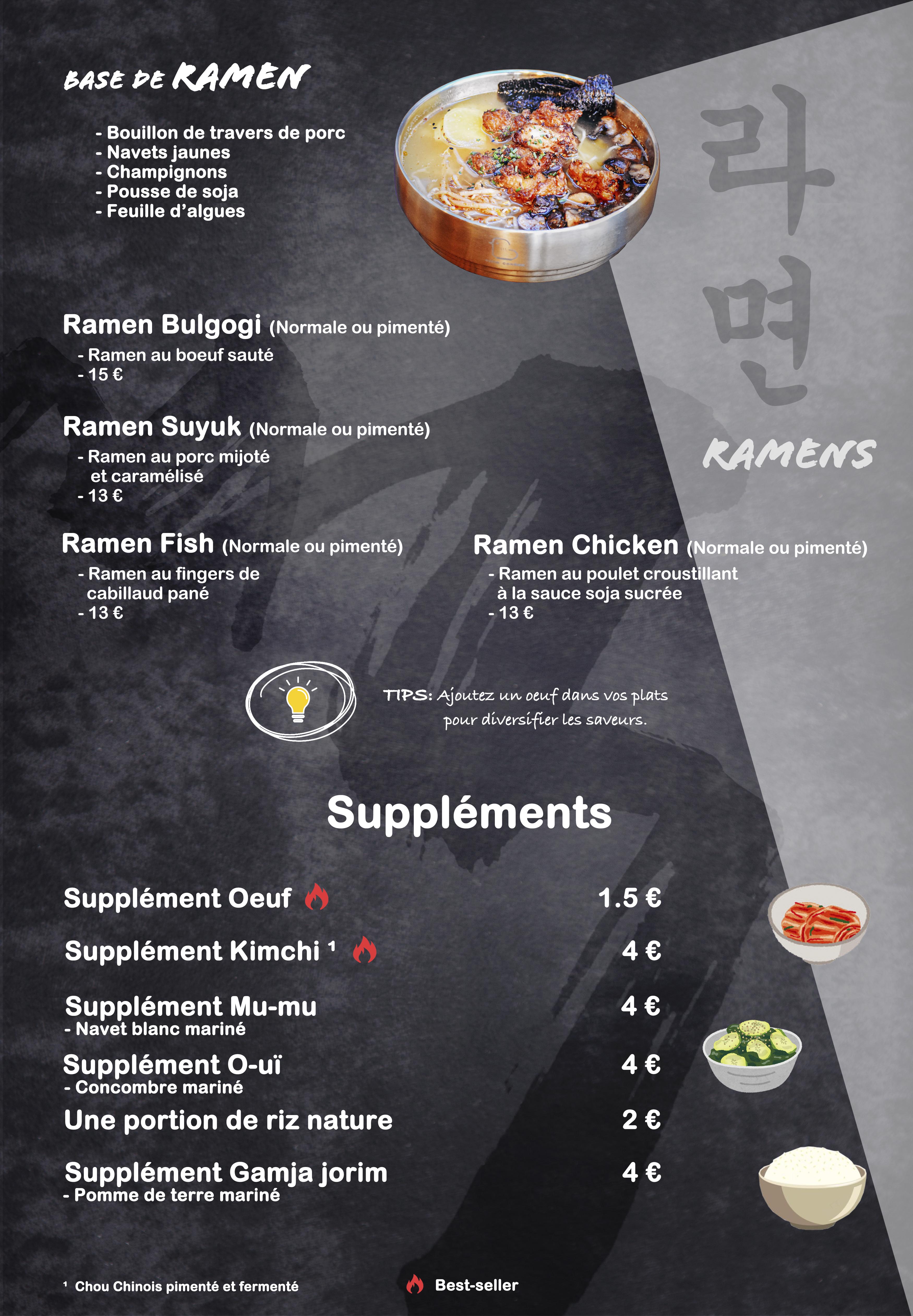 Decu car je me faisais une joie d'y aller au vu de tous les commentaires precedents mais mon experience n'a pas ete concluante. Note: on ete plusieurs a table donc a pu commander les 3/4 de la carte, ramen exclus. 1er: les entrees j'ai teste les soit disant takoyaki: Ce ne sont PAS des takoyaki mais des pseudo croquettes de poulpe. C'est frit a l'exterieur (cuit en mode friteuse) et ce n'est meme pas cuit a l'interieur. J'ai aussi teste le poulet croustillant (Dakgangjeong): C'est juste pas croustillant en fait et pas pimente (bon pour le piment c'est subjectif j'en conviens). De plus, les saveurs pas vraiment prononcees. Par exemple, l'ail je le sentais presque pas alors qu'il y en avait beaucoup dans le plat. 2: Les plats: le bibimbap: teste mais pas approuve. Il me semble que bap c'est pour riz mais la portion de riz etait pour moi trop petite par rapport au reste des accompagnements. le deopbap: On va dire que je suis mauvais donc je vais m'arreter la mais la c'est vraiment du foutage de gueule. Bref, C'est beau visuellement (on ete unanime sur ce point) mais une fois dans la bouche, ca fait un flop. Enfin, pour avoir plus que 'poncer' les restaurants coreens dans tous Paris, je pense que ce restaurant n'est pas a la hauteur de mon exigence.