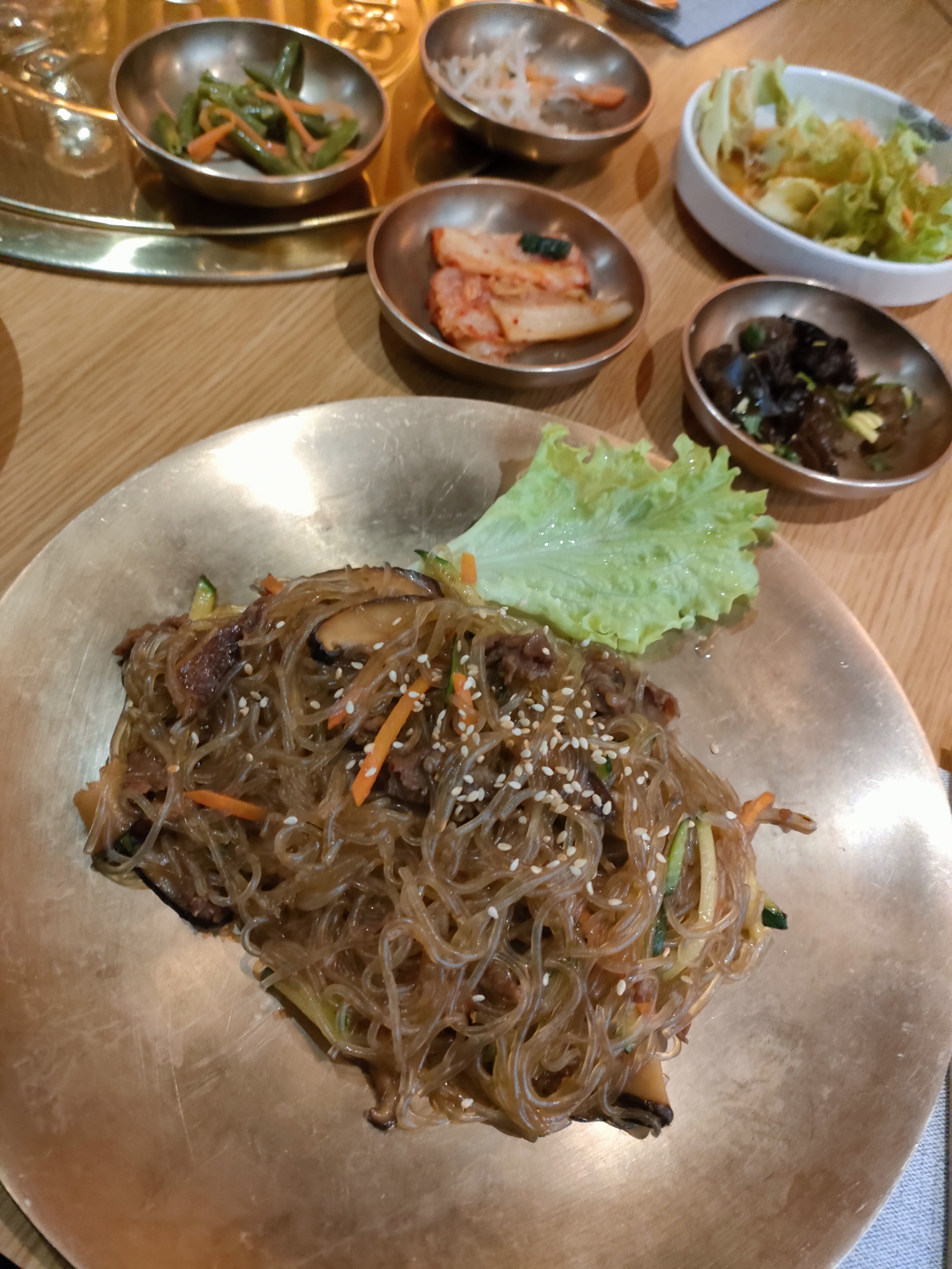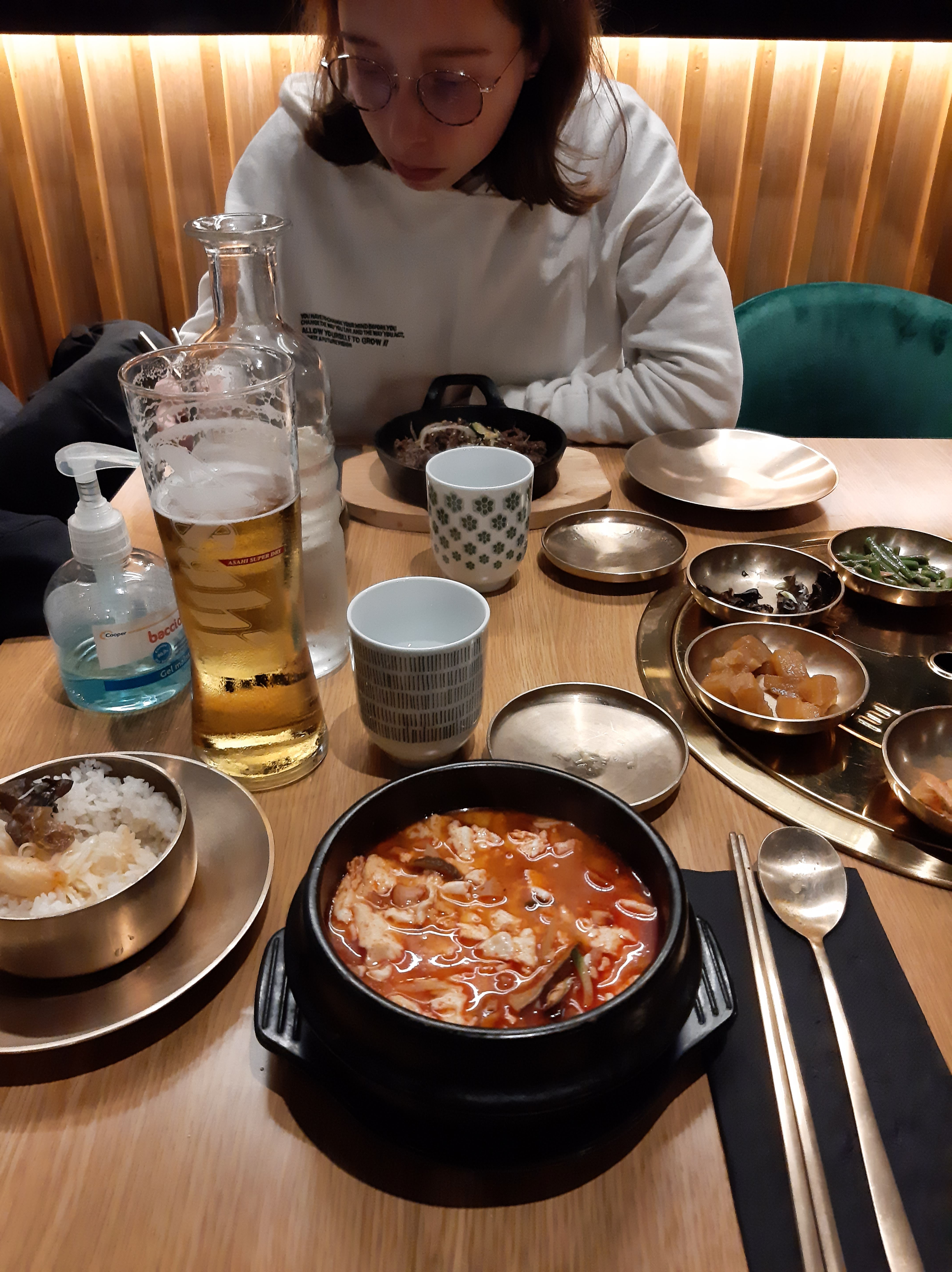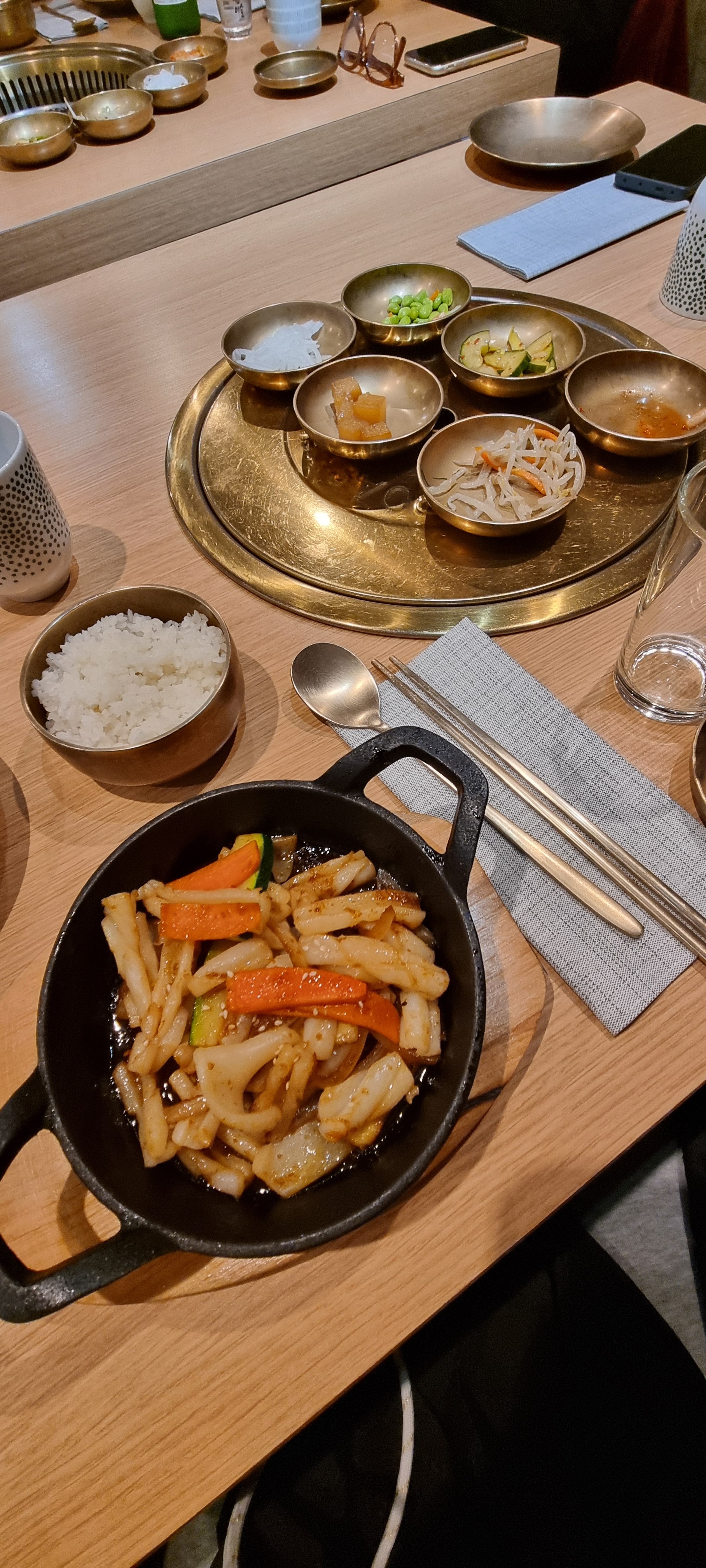 De très bons plats (la sauce du bulgogi est vraiment délicieuse), que l'on déguste dans une ambiance particulièrement agréable : nous n'avons pas pris de grillades, mais ceux en ayant pris avaient le droit aux grillades au milieu de la table, ça avait l'air tout aussi convivial que délicieux ! Seuls tous petits bémols : les plats qui ne sont pas écrits en coréen (moi qui me repérais avec le nom coréen des plats, j'ai eu un peu de mal à retrouver mes kimchijeon...), et le service un peu trop présent (certains serveurs restent dans le coin de la pièce et viennent vous voir sans raisons). Mais ce ne sont vraiment que des détails et j'ai passé un très bon dîner. J'y retournerai pour les grillades, et en boisson non alcoolisée je conseille particulièrement le sikhye : légère, très bonne, elle accompagne parfaitement les plats !