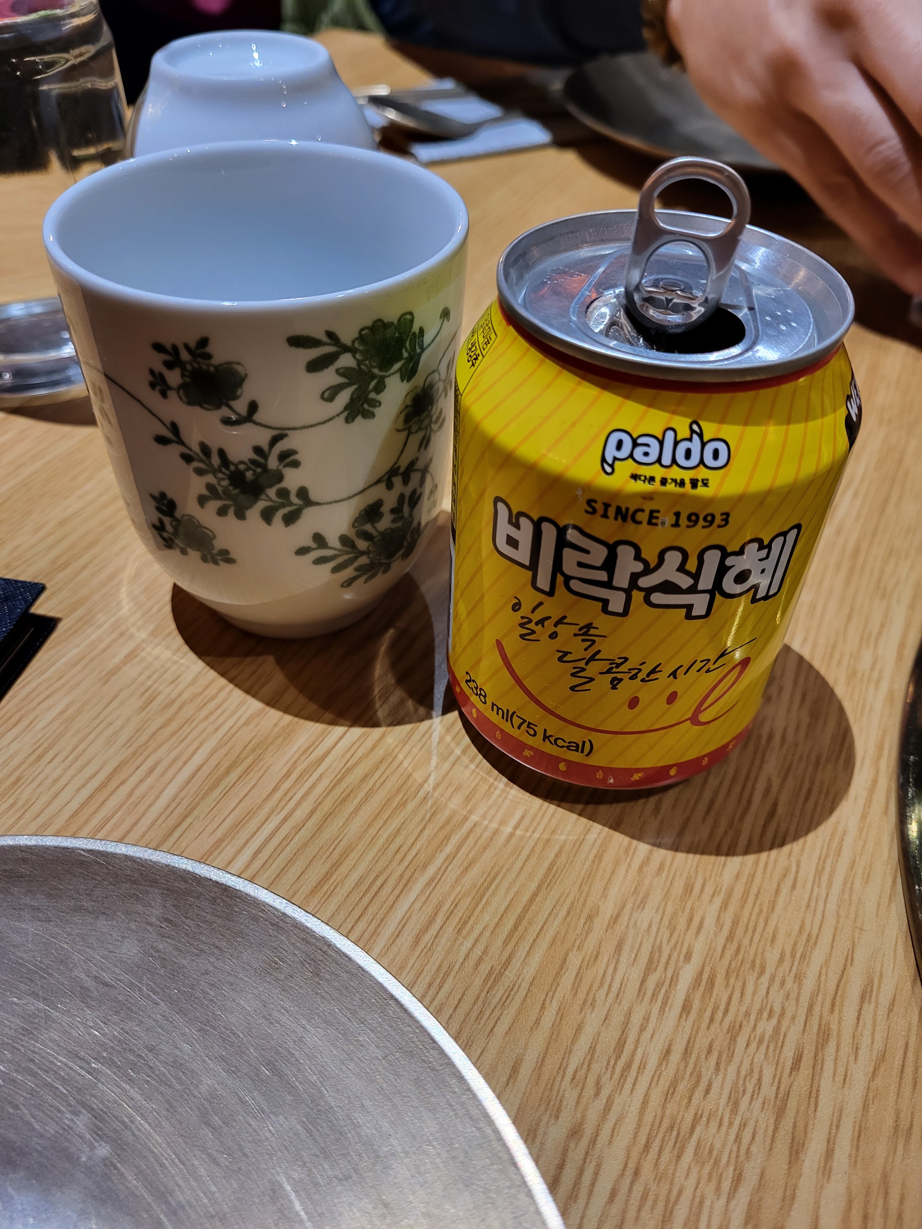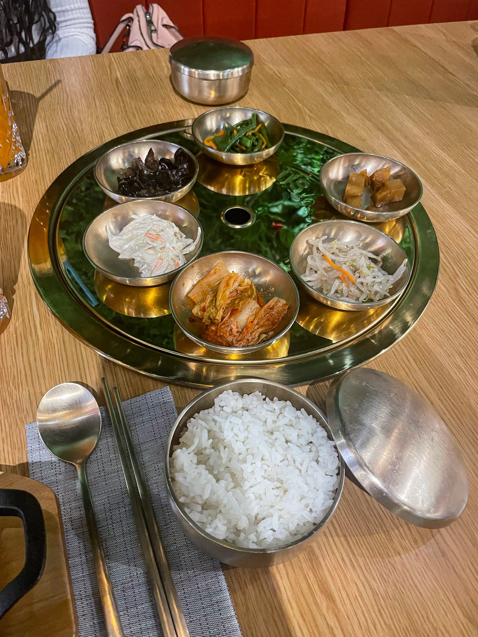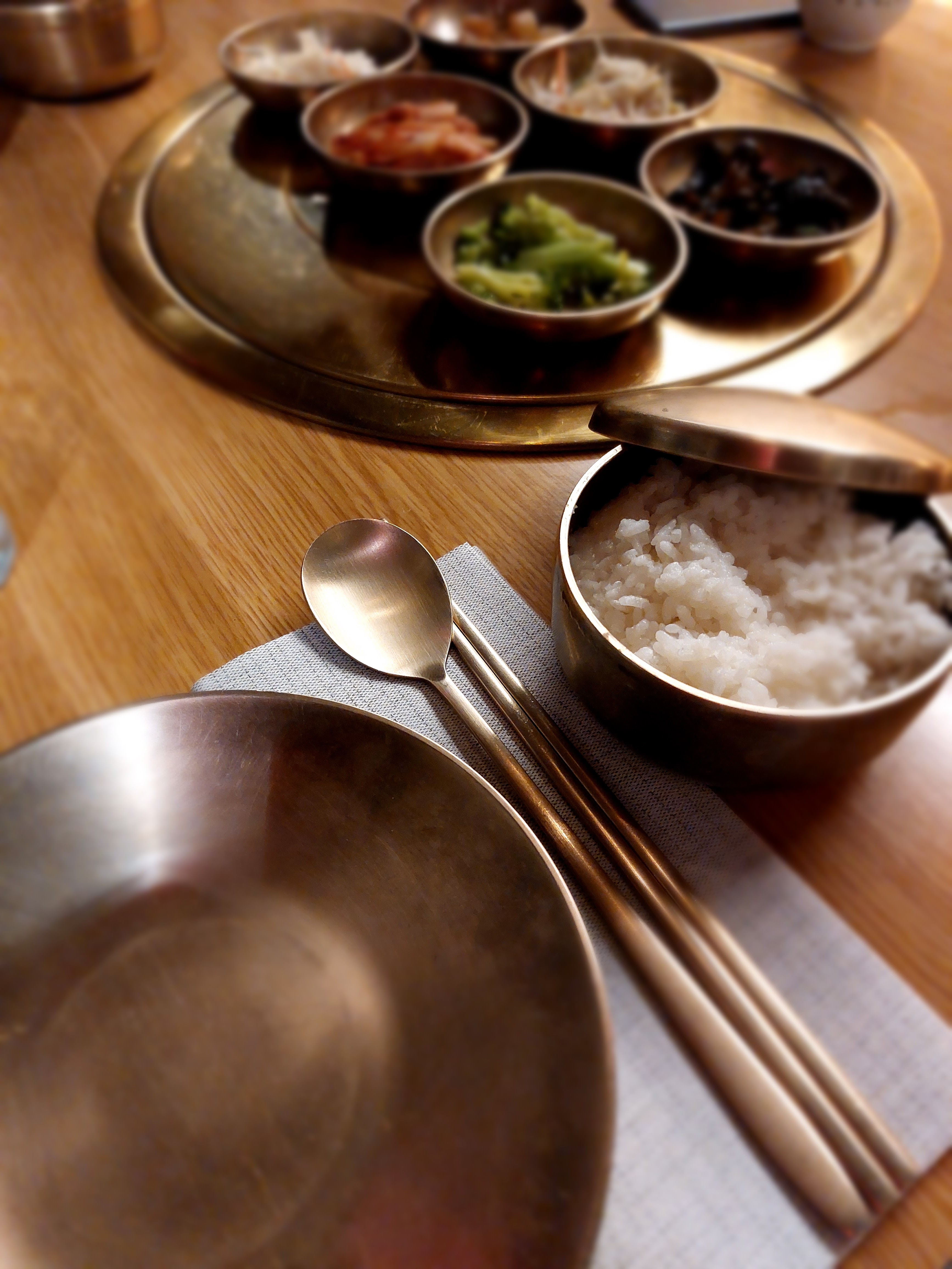 De très bons plats (la sauce du bulgogi est vraiment délicieuse), que l'on déguste dans une ambiance particulièrement agréable : nous n'avons pas pris de grillades, mais ceux en ayant pris avaient le droit aux grillades au milieu de la table, ça avait l'air tout aussi convivial que délicieux ! Seuls tous petits bémols : les plats qui ne sont pas écrits en coréen (moi qui me repérais avec le nom coréen des plats, j'ai eu un peu de mal à retrouver mes kimchijeon...), et le service un peu trop présent (certains serveurs restent dans le coin de la pièce et viennent vous voir sans raisons). Mais ce ne sont vraiment que des détails et j'ai passé un très bon dîner. J'y retournerai pour les grillades, et en boisson non alcoolisée je conseille particulièrement le sikhye : légère, très bonne, elle accompagne parfaitement les plats !