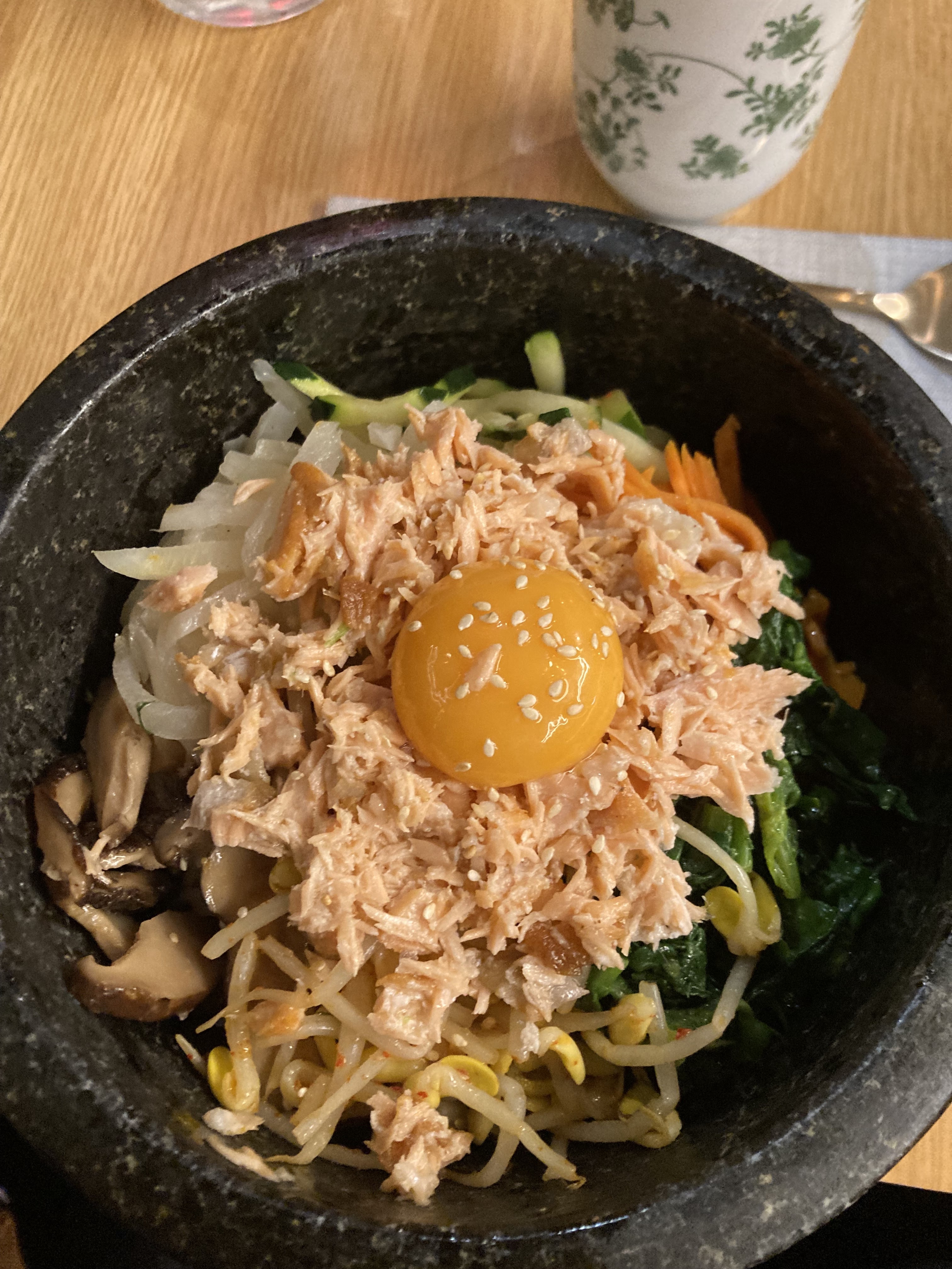 J’ai choisi un bibimbap au saumon. C’était bon, mais manquait un peu de caractère.