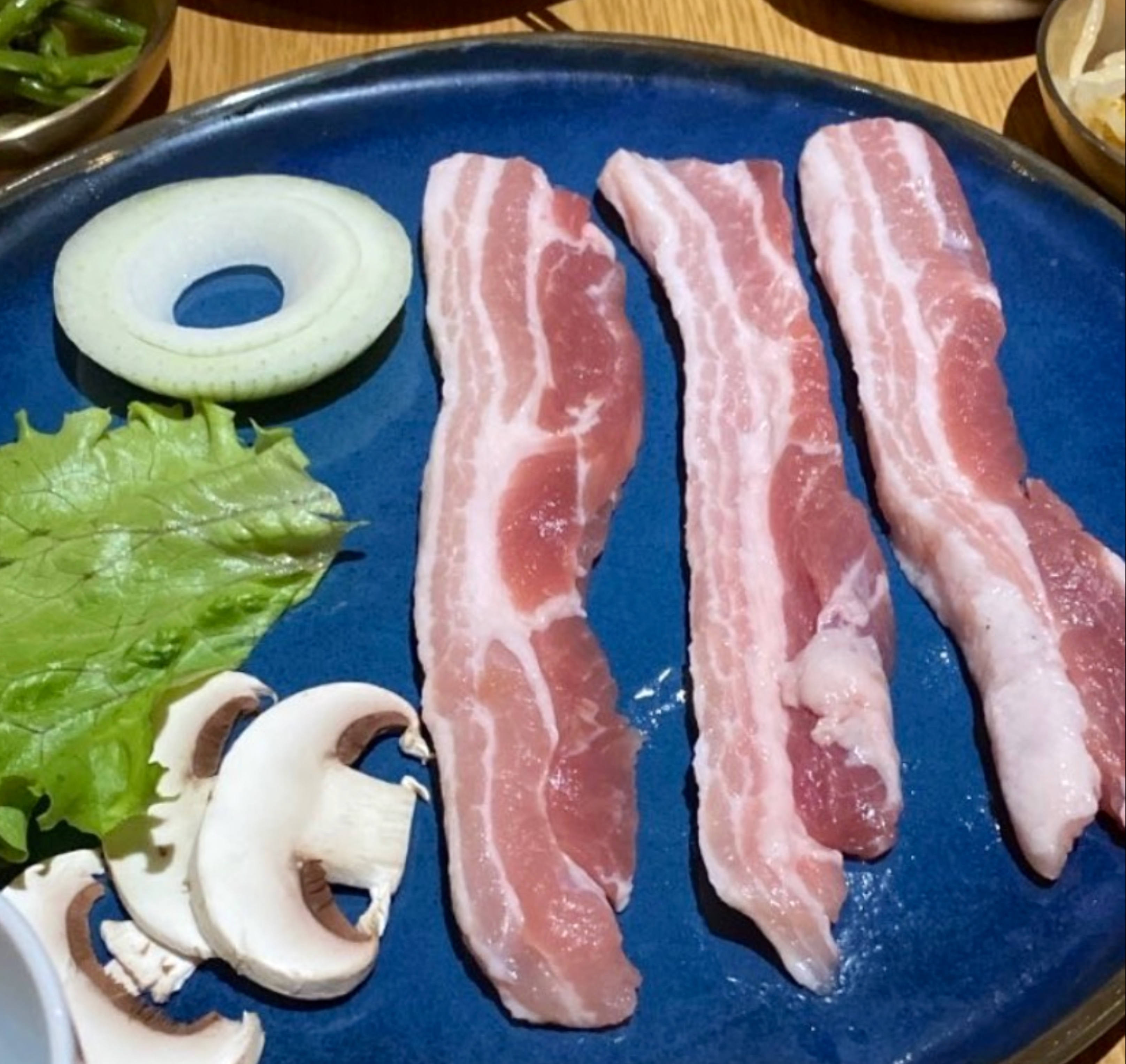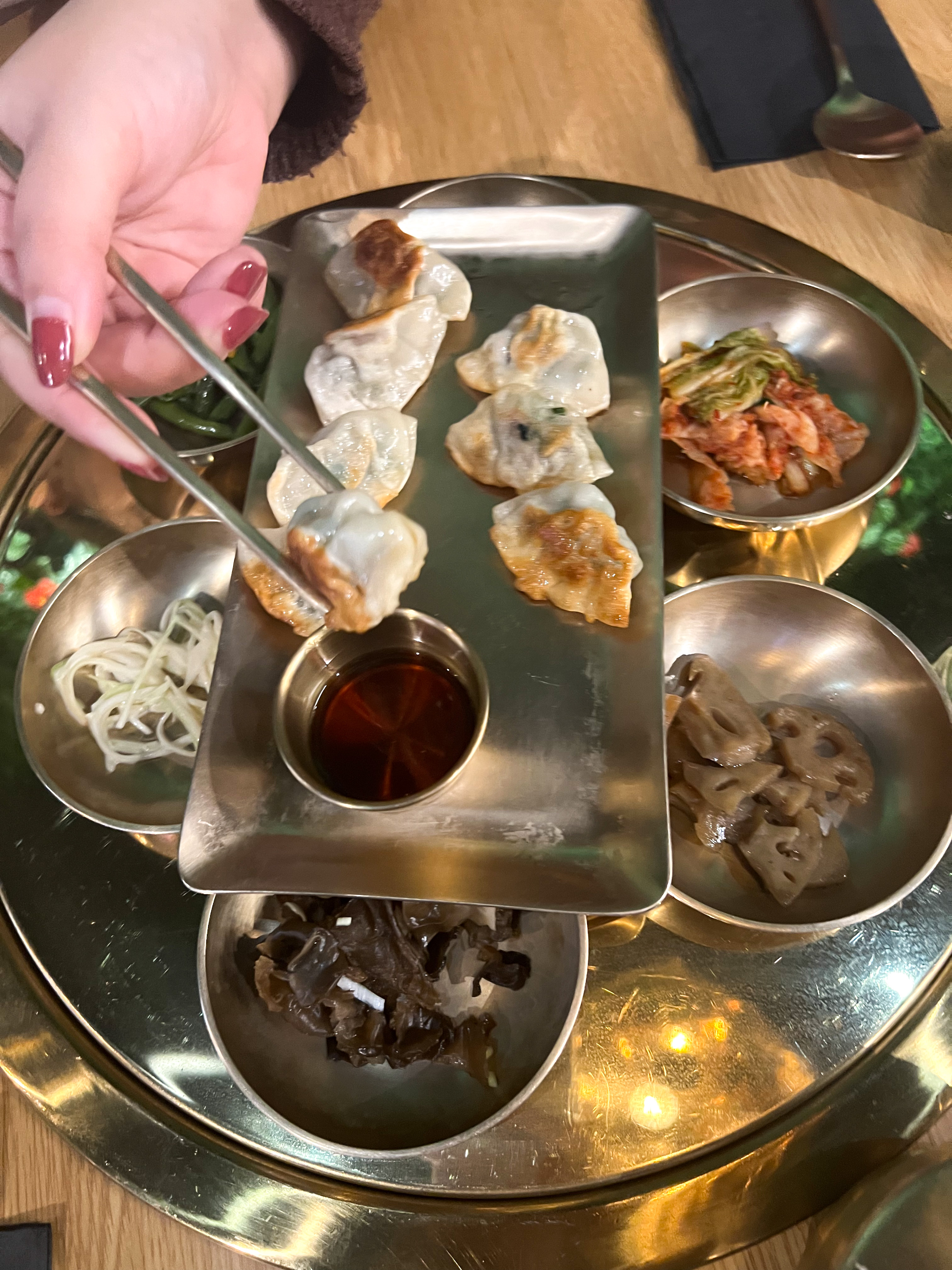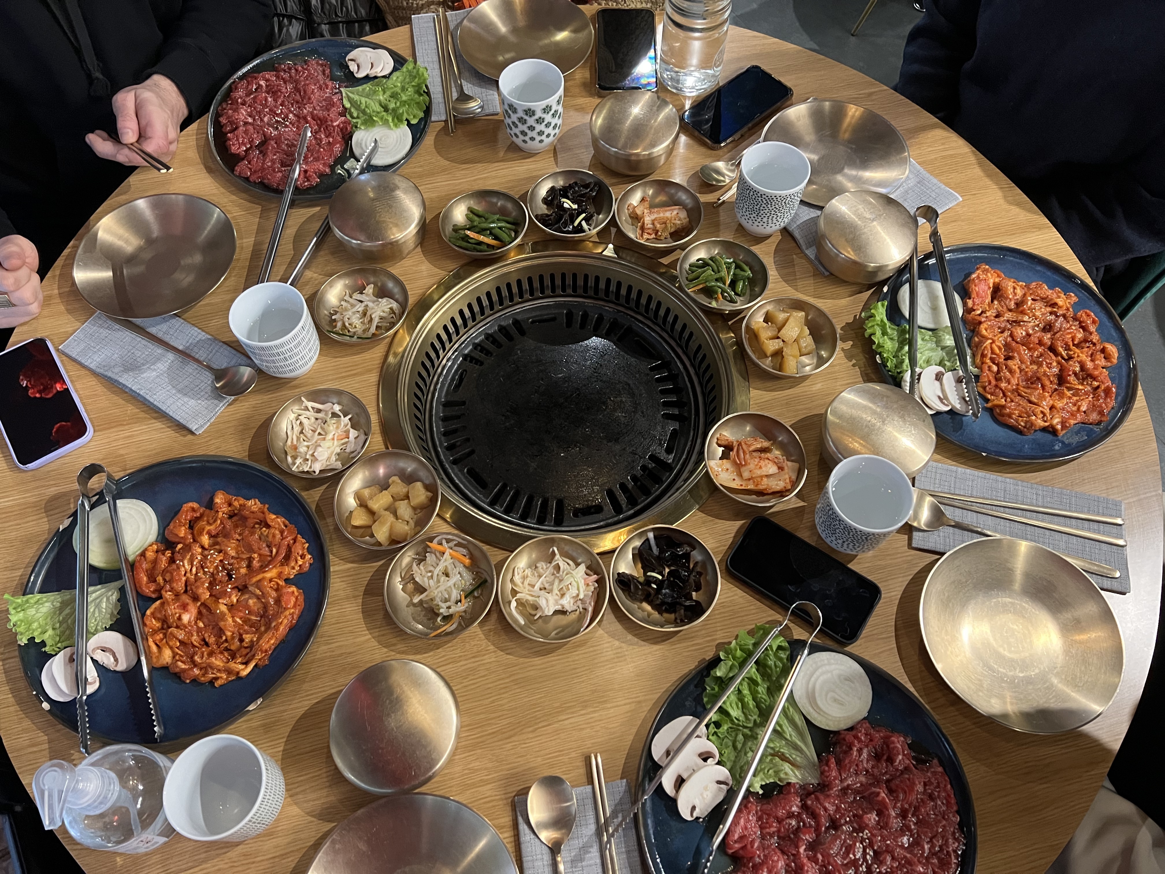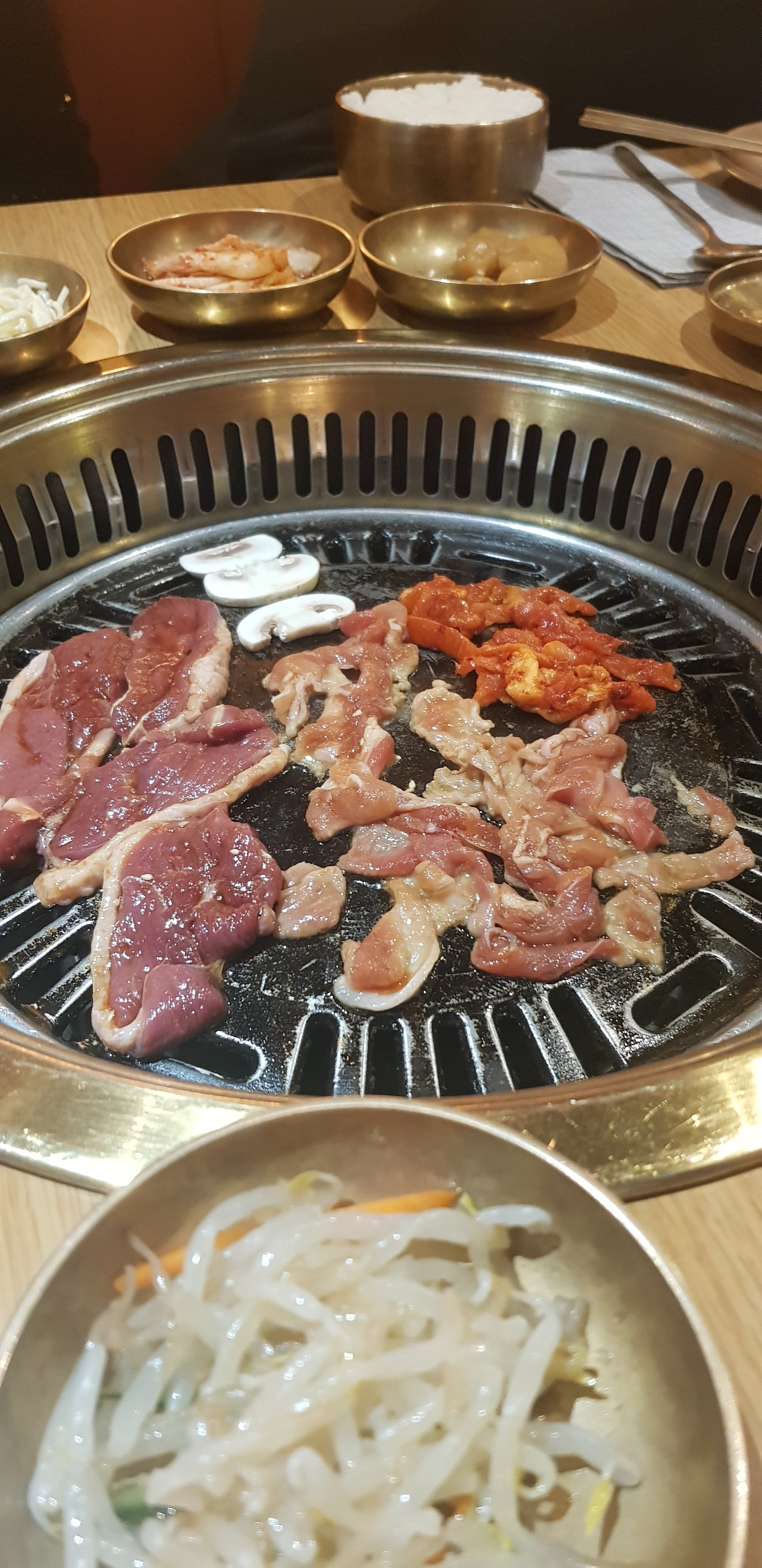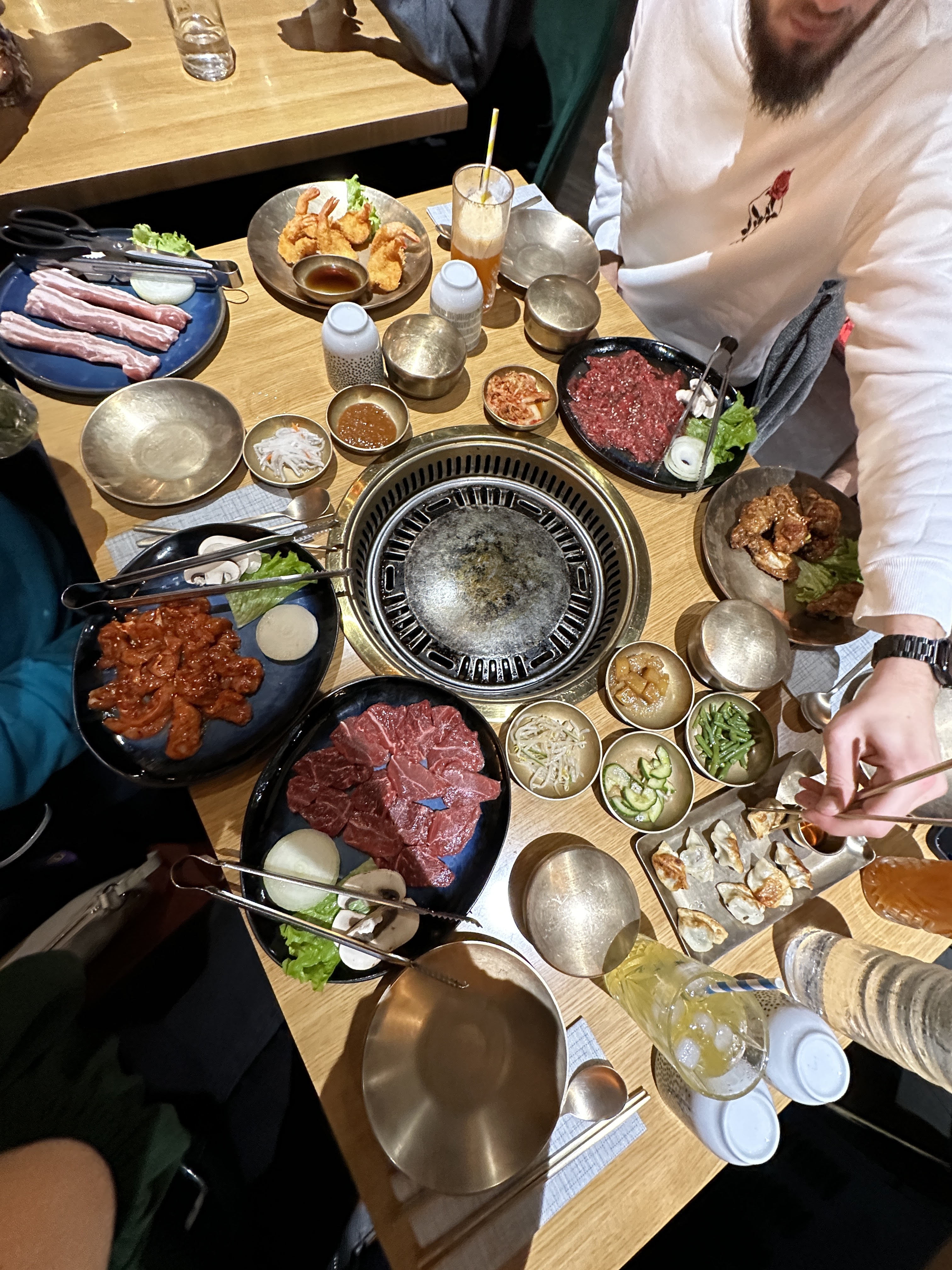 J'ai déjà fait plusieurs barbecue coréen mais pour le coup j'ai été vraiment déçu. Nous avons commandé pour trois portions de viande avec chacune 6 accompagnements compris dans chaque portion mais seulement 6 sont arrivés avec les deux sauce et le piment. Pour le coup cela n'est pas grave mais quand nous avons demandé plus de salade, on nous a demandé de payer un supplément. En plus des portions de viande, j'ai commandé 8 raviolis grillés qui n'étaient ni grillés ni croustillants et extrêmement petits. Je trouve que nous avons payé cher pour les quantités que nous avons reçues. Pour une entrée, un plat partagé et une boisson, j'ai payé environ 35€. En passant outre de tous cela la cuisine etait bonne avec un bon service.