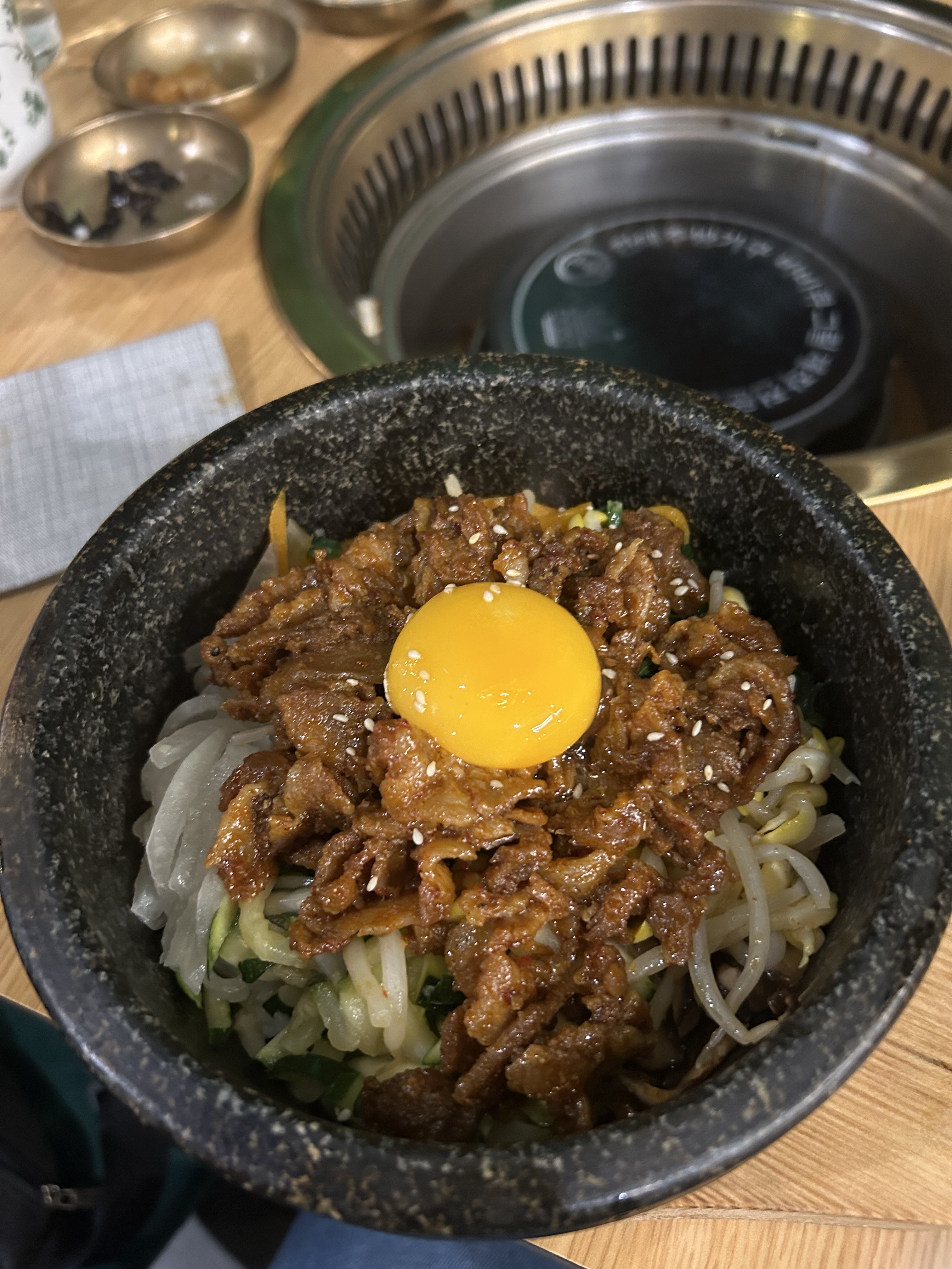 Cuisine simple: bibimbap n’avait pas vraiment de goût mais apparemment la viande était bonne pour le barbecue Le personnel n’était pas très agréable