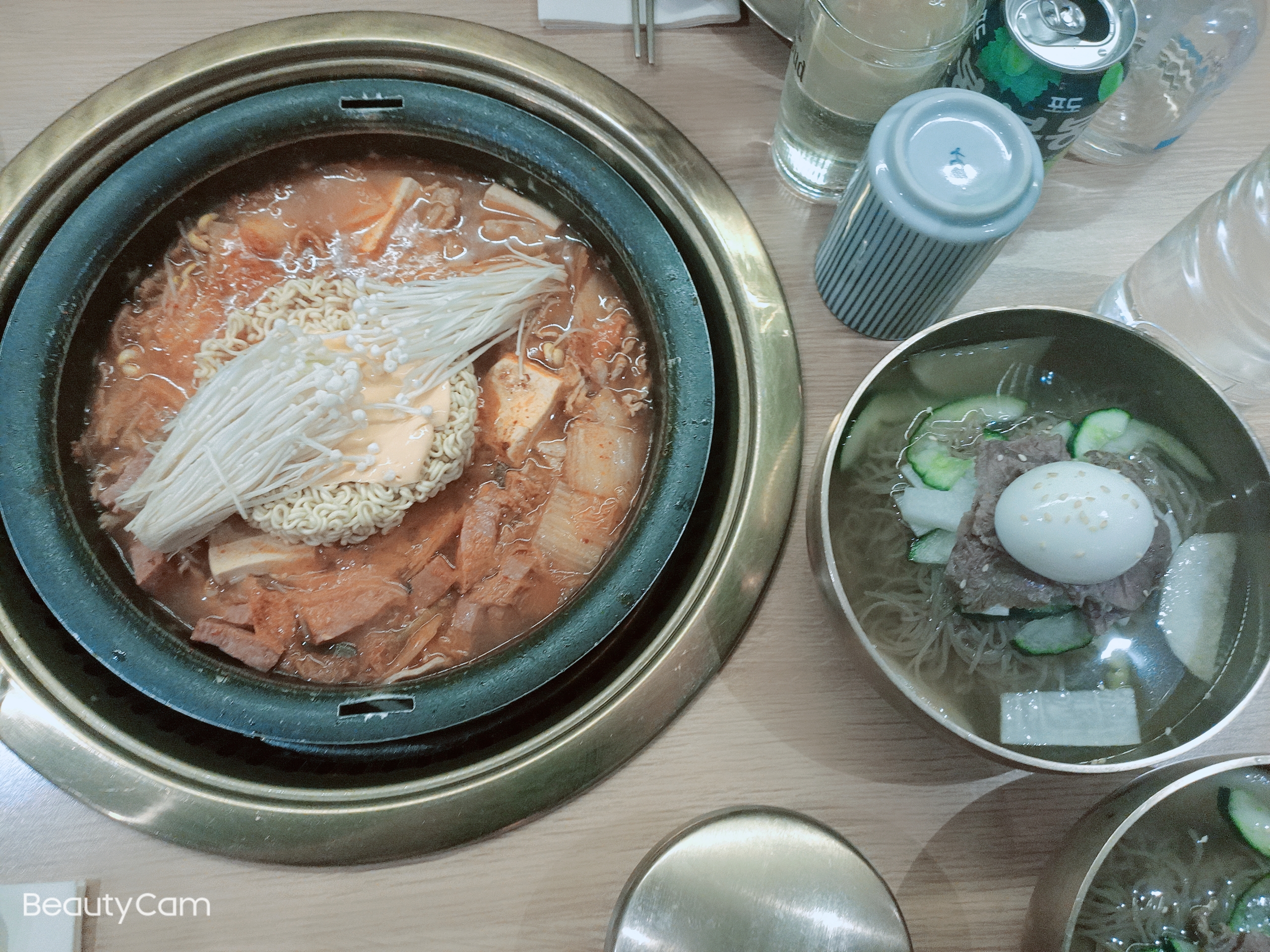 J'ai trouvé le kimchi beaucoup trop acide... C'est idéal pour faire du ragoût de kimchi. Les Naengmyeon étaient très bon, c'est une soupe de nouille aux sarrasin froid. On mange plutôt en été mais il faisait tellement chaud dans le restaurant que vraiment c'était un très bon choix 🤣 Après le restaurant est sympa, les toilettes sont propres et ça c'est pas dans tout les restaurants...