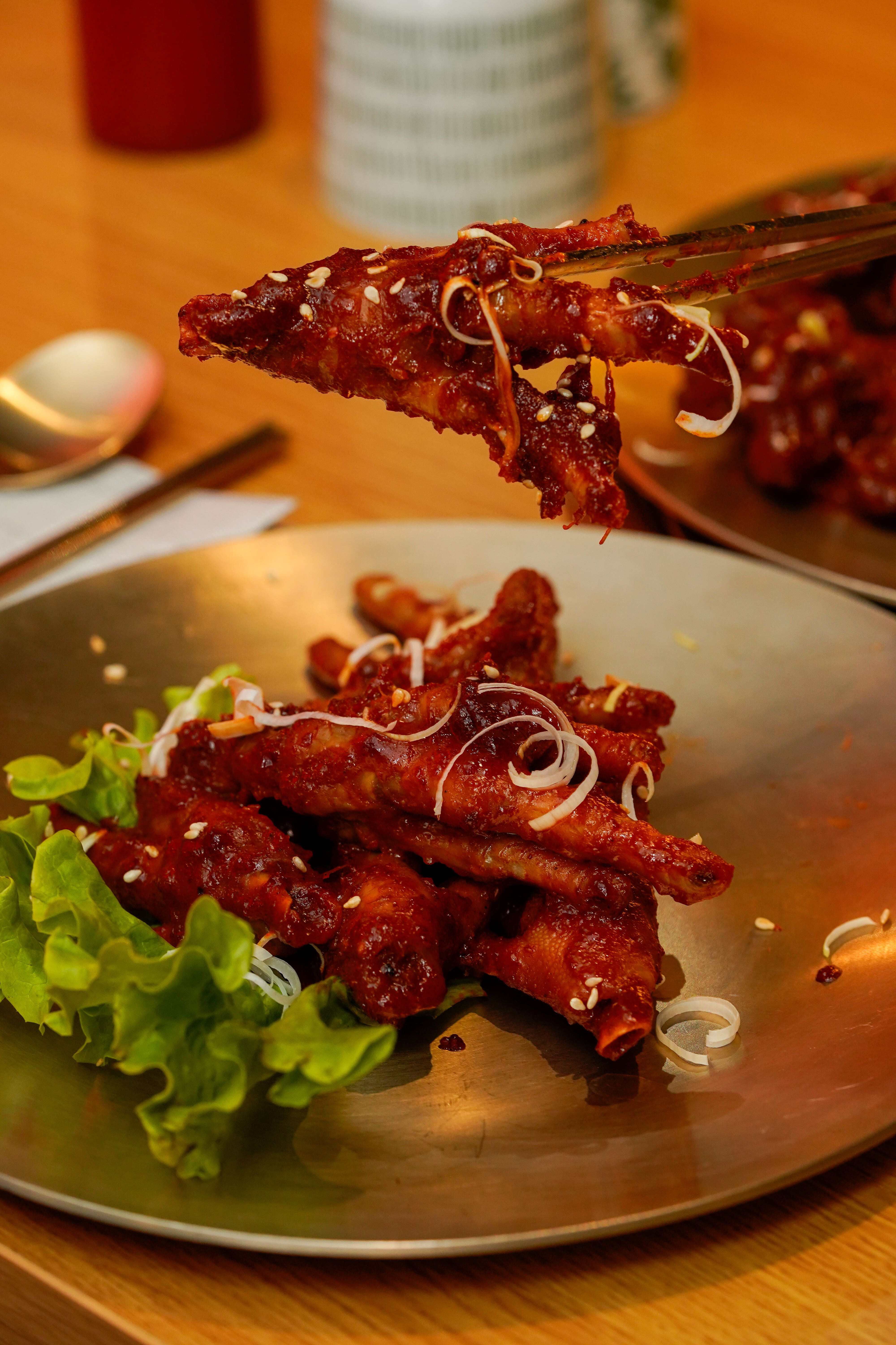 Assez peu d'attente pour une table de deux personnes un samedi soir sans réservation. Personnel très aimable et serviable. Nous avons pris une crêpe au kimchi en entrée que nous avons partagé puis au barbecue du poulet pimenté et du boeuf mariné, le tout servis avec une portion de riz par personne et 6 condiments à partager (coleslaw, pousse de soja, pomme de terre, Kimchi, algues...). C'était très bon et le poulet était très tendre.
