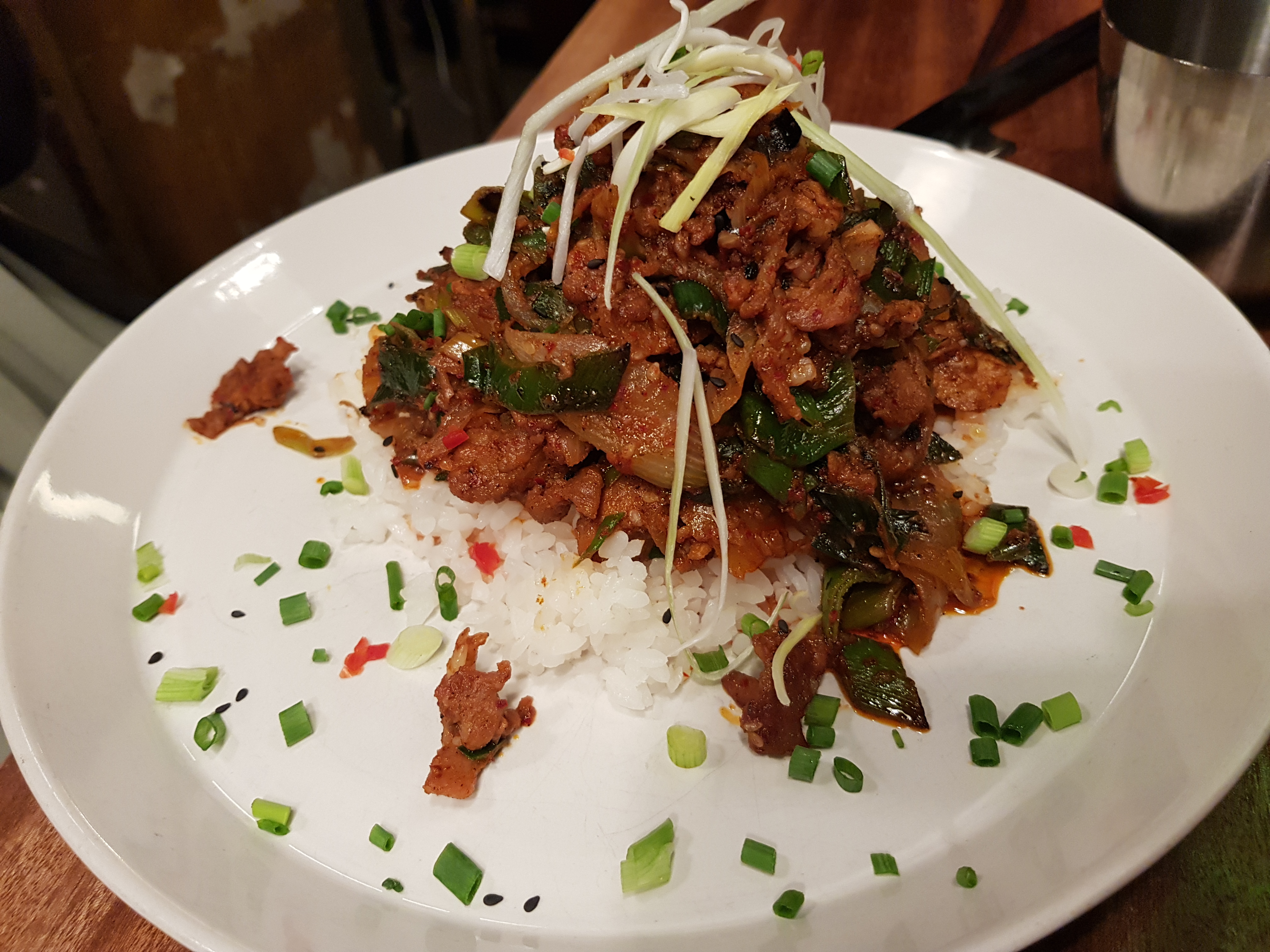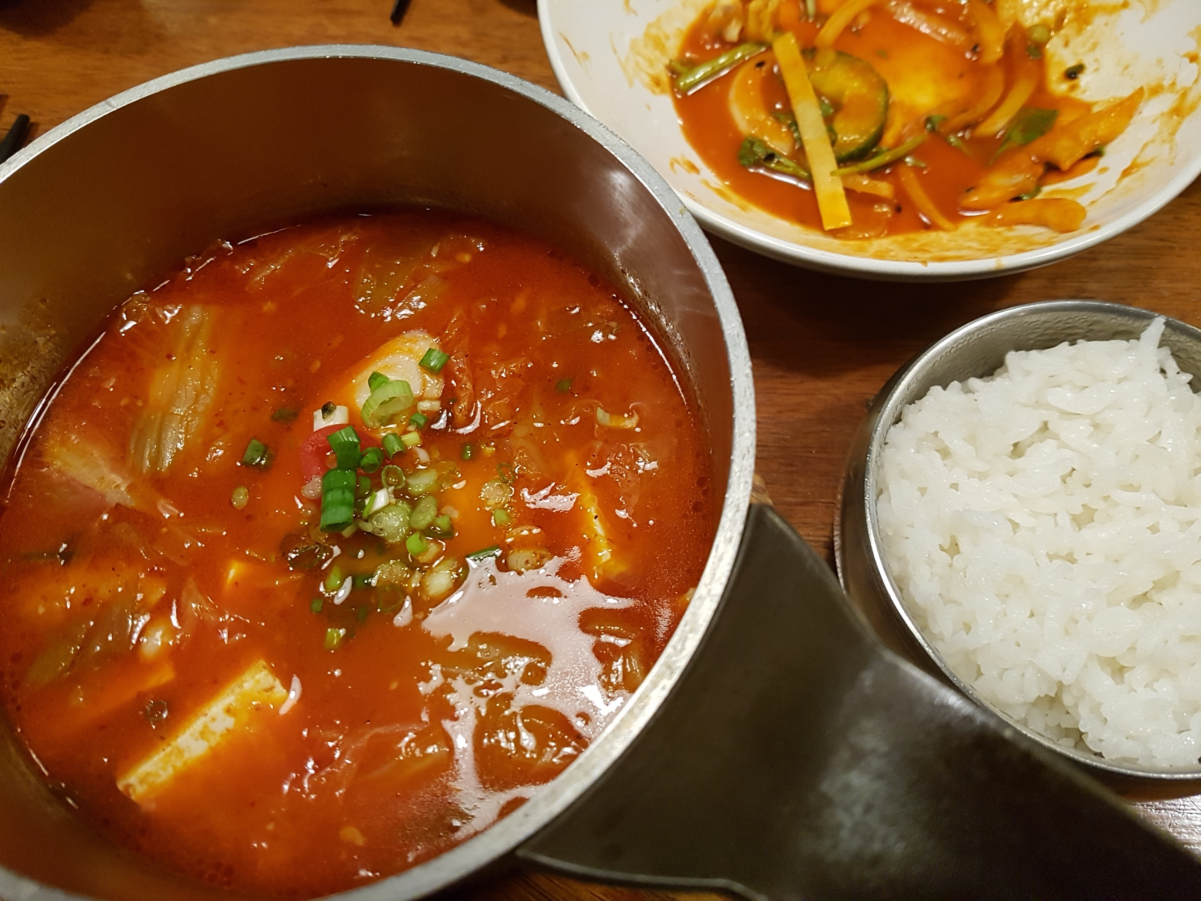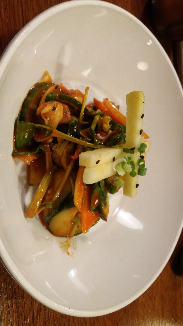 Le Kimchi est épicé et fade, j'ai demandé du sel et me suis demandé comment, sans sel, les légumes étaient lacto fermentés puis j'ai posé la question sur la nationalité des cuisiniers qui ne sont pas coréens et j'ai compris
