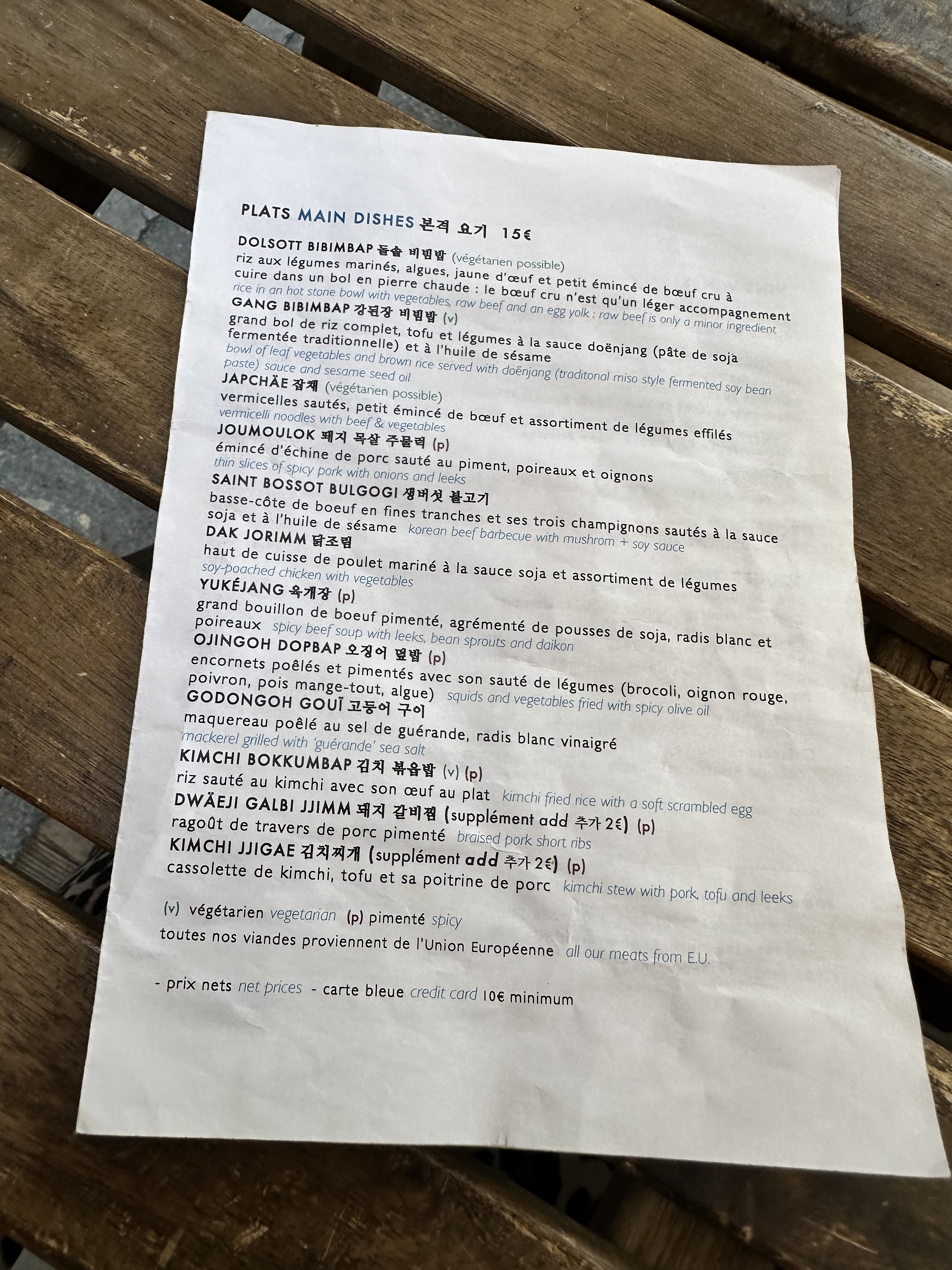 Impression que les clients sont abusés sur la cuisine coréenne servies en raison de la mode. Le goût de différents plats est du niveau d'une cantine ou un resto pas cher à Séoul donc un mauvais rapport qualité/prix. La présentation des plats est plutôt grossière, voire sans lien avec le nom en coréen. Service un peu folklorique et pressé, retrait d'un plat avant de l'avoir fini. Par ailleurs, aucun sens du service clientèle par une prétention affiché du responsable qui ne tient aucun compte des remarques des clients et les considère comme des idiots. Qualité des plats et du service en très large retrait par rapport aux années précédentes... Peut-être pour découvrir rapidement un peu la cuisine coréenne pour le déjeuner. A éviter pour le dîner. Il y a aujourd'hui beaucoup d'autres meilleurs restaurants coréen à Paris. Profite de son emplacement de façon indue. Ne mérite pas recommandation Michelin et autres. Plutôt à éviter. De plus les modes de paiement ne sont pas affichés comme l'exige la réglementation.