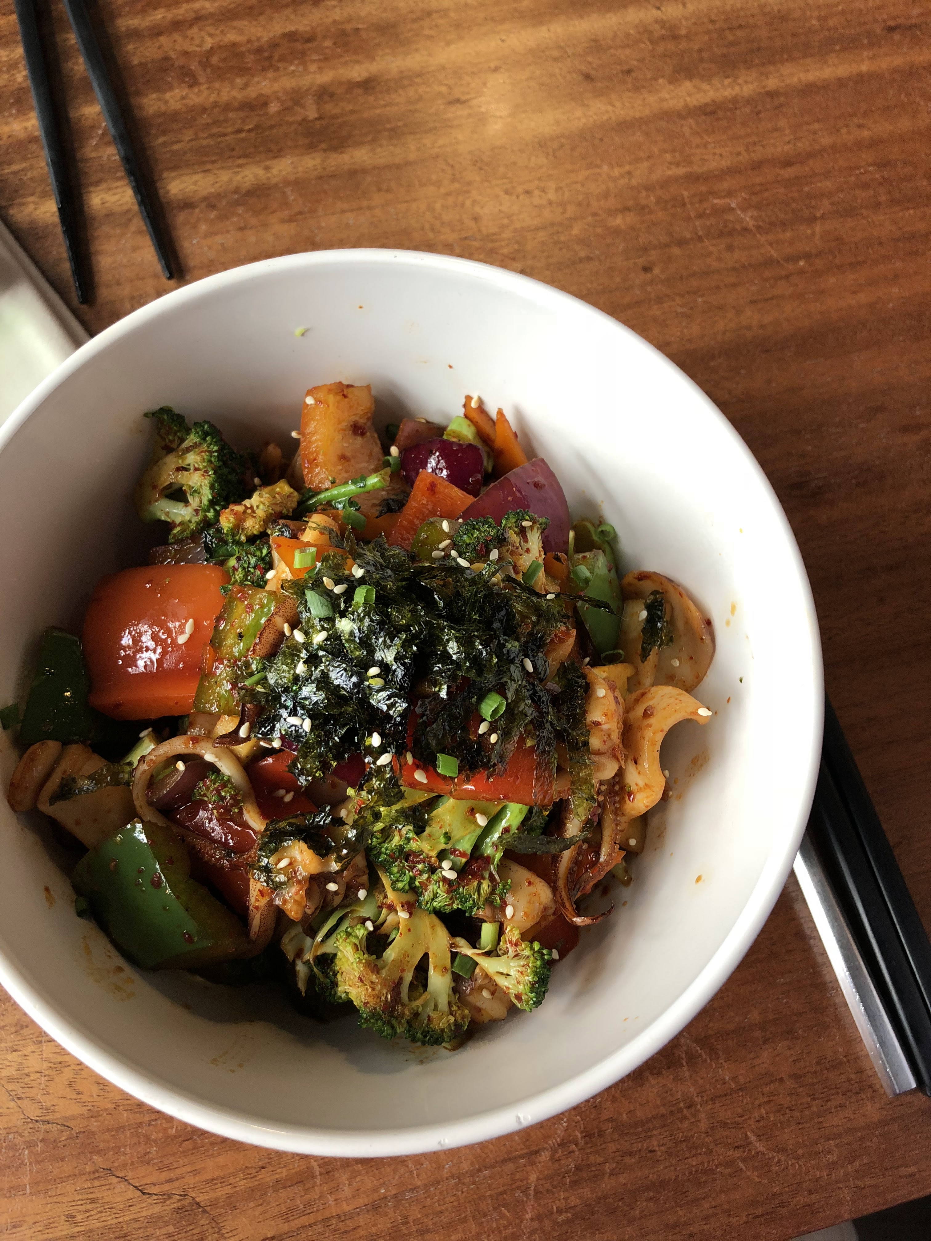 Bouais... D'accord, la cuisine coréenne à la mode, est-ce que ça veut dire que tous les restos coréens méritent qu'on y courent? Bon déjà au niveau de la résa on nous dit venez à 19h mais à 20h30 vous devrez être parties... Super. L'endroit est joli, déco épurée. L'assiette : un bol ( généreux) d'encornets aux légumes sautés loin de me faire sauter au plafond: ça manque tellement de pep's que je demande de la sauce soja. Les copines qui était venues quelques mois auparavant sont déçues, ne retrouvant pas la finesse qu'elles avaient connue la première fois. Pour le dessert, les haricots rouges accompagnés d'une boule de glace vanille saupoudrée de matcha(?) laissent indifférents, tout en collant aux dents. Les copines qui ont pris la poire pochée à la cannelle et au gingembre restent de marbre. Bref un resto loin de m'avoir réconciliée avec la cuisine coréenne.