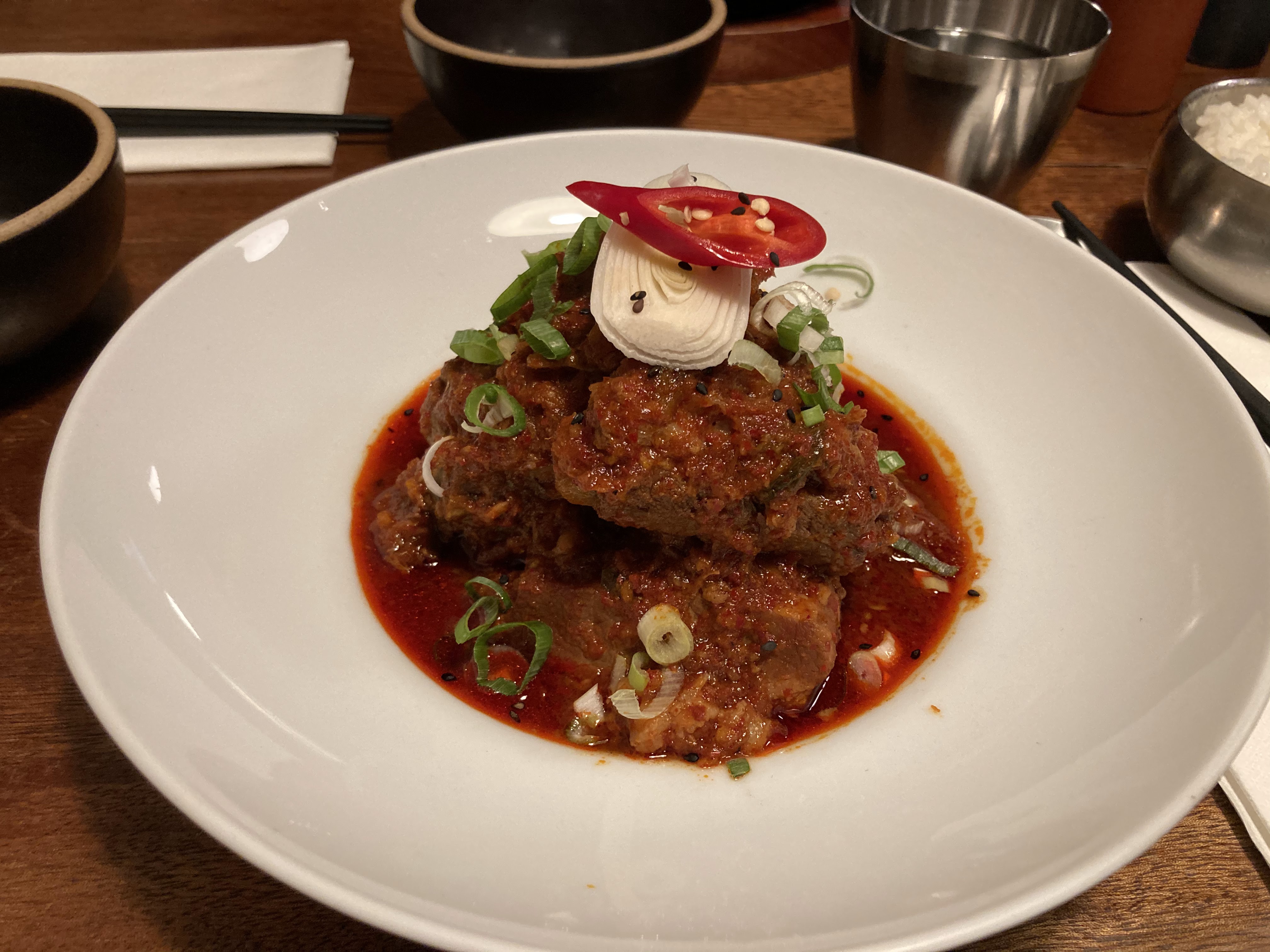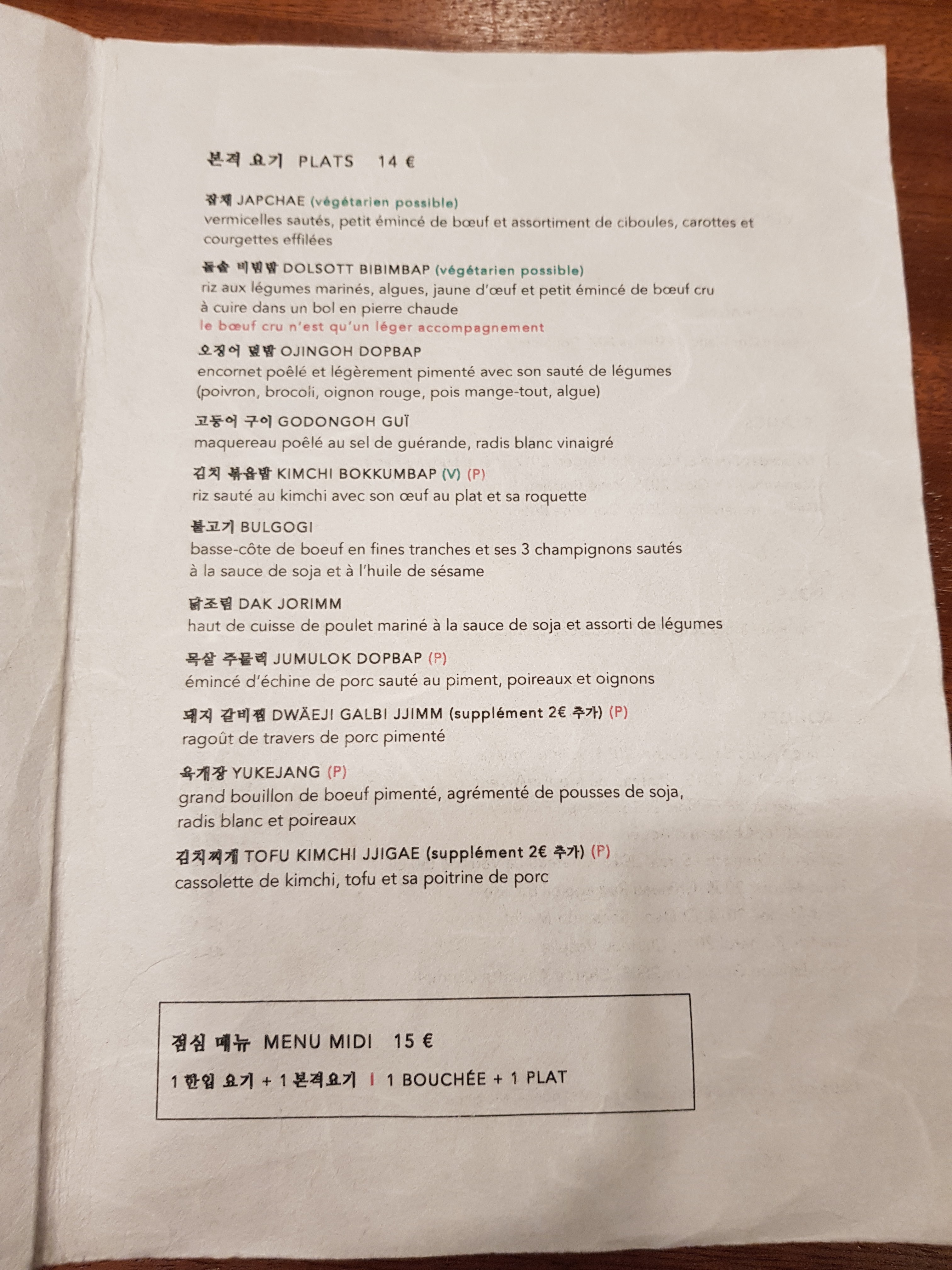 Dans l’ensemble c’est un assez bon restaurant qui propose effectivement des spécialités coréennes qui sortent de ce que l’on peut voir dans les restaurants coréens habituels. Cependant le prix par rapport à la quantité baisse le nombre d’étoile que je lui donne. Je conseillerai le japchae ou le bulgogi en plats car les autres sont très épicés. Par ailleurs je m’attendais à quelques accompagnements comme on peut en voir habituellement avec le bulgogi mais rien, même pas de kimchi. Je pense donc que ce restaurant est assez bien pour une soirée mais je ne pense pas y retourner.