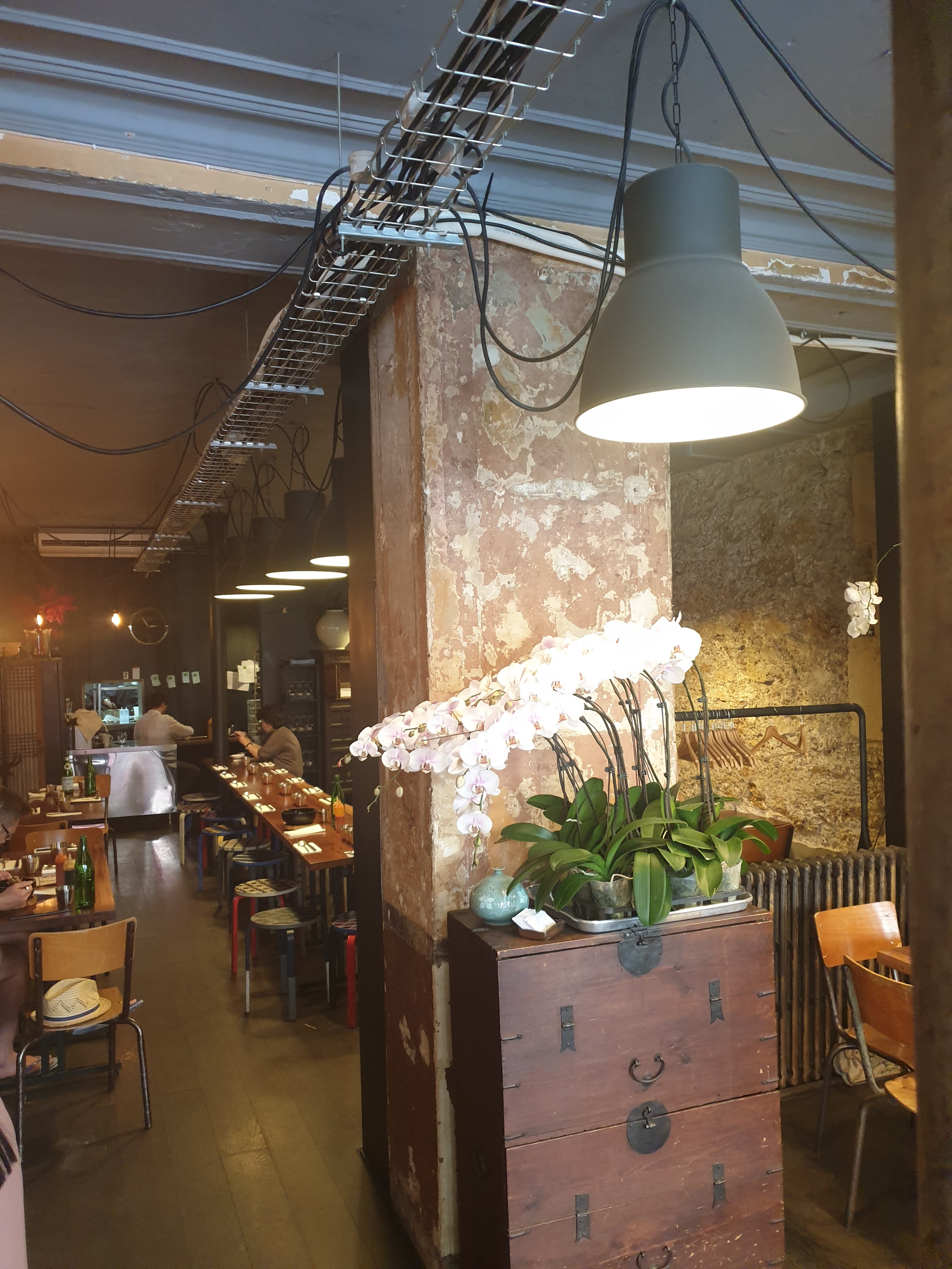 Super chouette restaurant coréen ! Dans mon top 3 de ceux que je préfère à Paris. Ambiance hipsterisante à souhait, jolie déco. La maxi table du milieu pour optimiser le rendement à l’avantage d’être chaleureuse pour les rencontres mais l’assise tabouret en est par contre moins confortable. Les explications concernant les plats sont justes et l’effort de présentation de ceux-ci sont une réussite. La variété des plats permet des choix gargantuesques à des plats d’esthète.