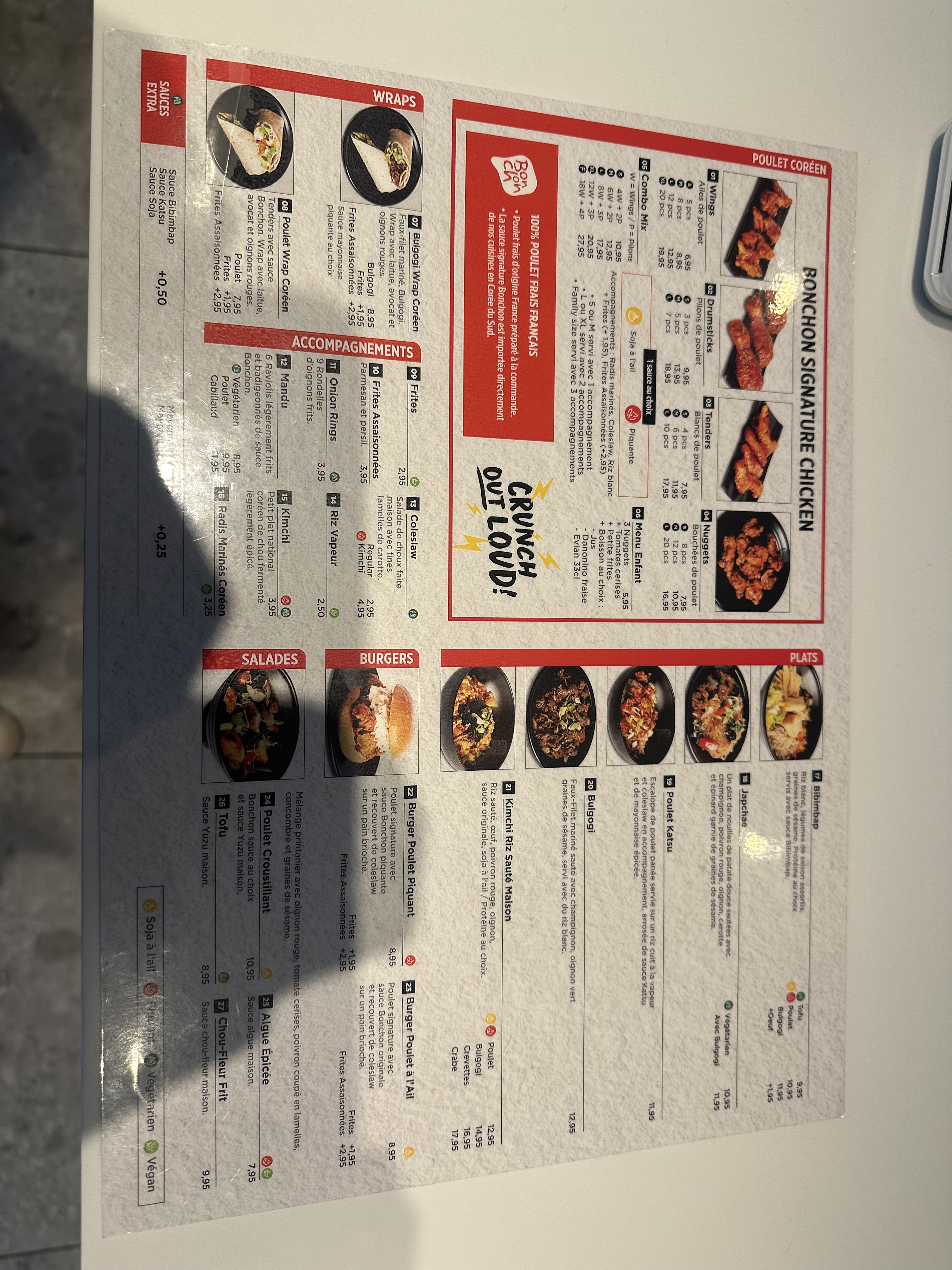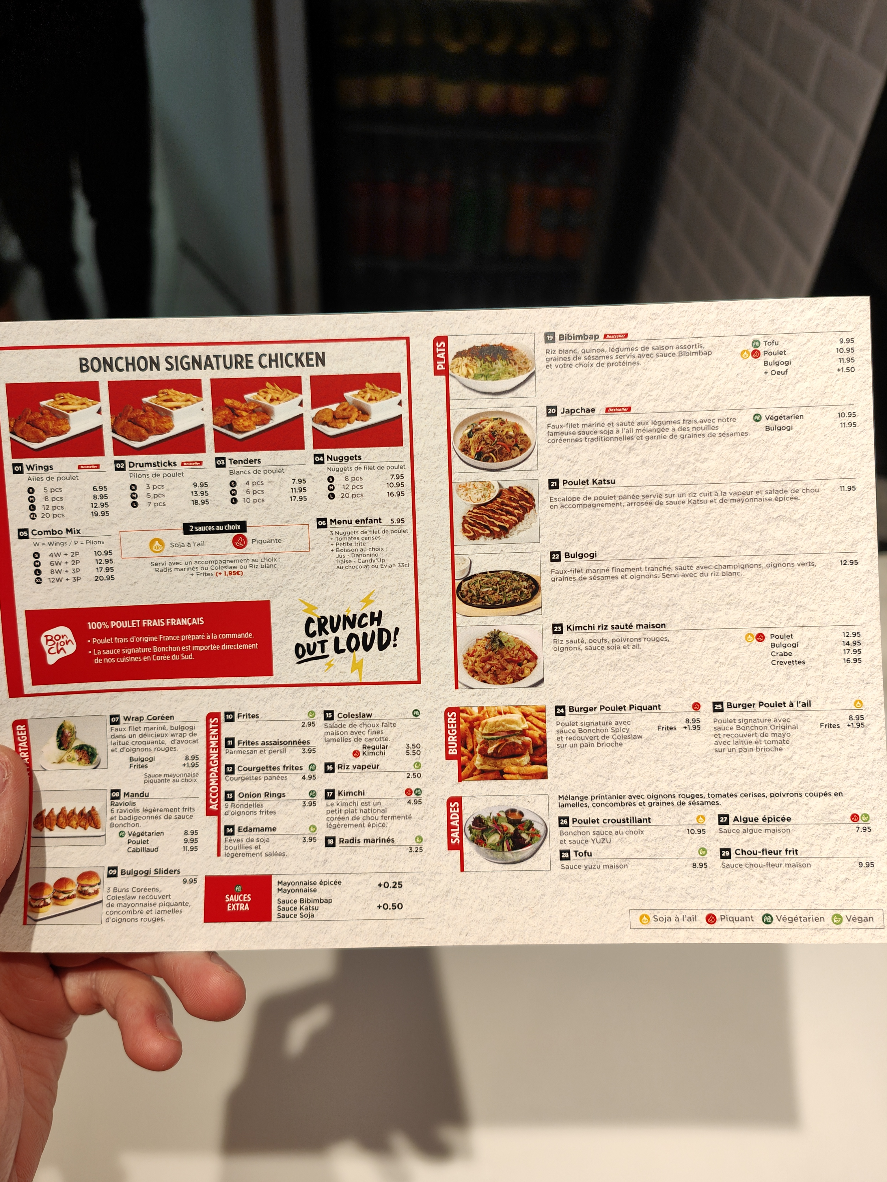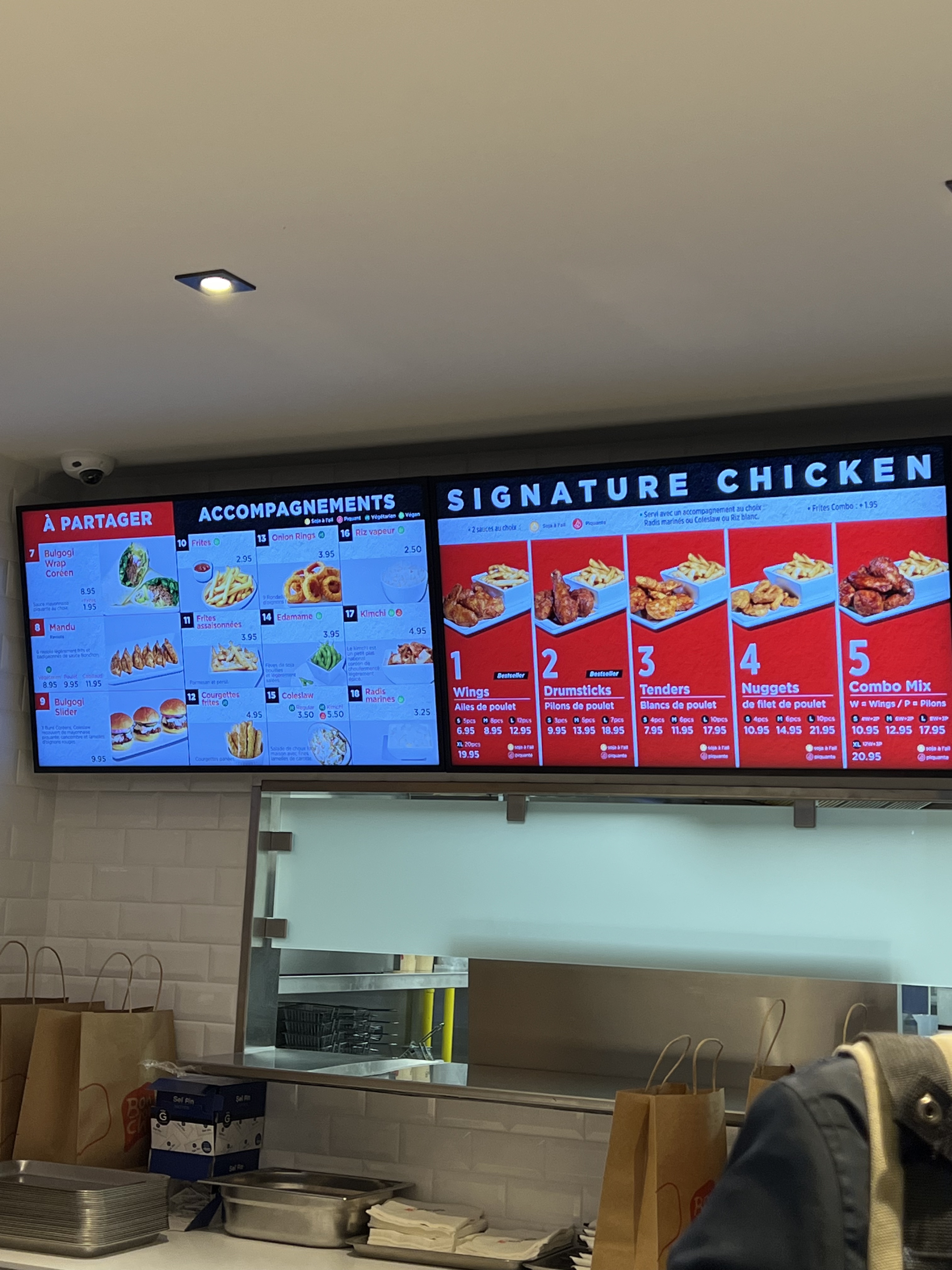 Très moyen. Leur système de menu n’a aucun sens, il faut payer en plus pour avoir une boisson et même ajouter un supplément pour des frites surgelés bas de gamme. Au final, c’est surtout très cher pour ce que c’est. Oui le poulet est bon, certes, mais ca ne rattrape pas mon expérience globale. Les tables sont ridiculement petites et les chaises pas confortables. Franchement j’aurais mieux mangé et pour moins cher dans un vrai resto coréen. En photo : Un menu à presque 20 balles… (Kimchi a 4 euros).