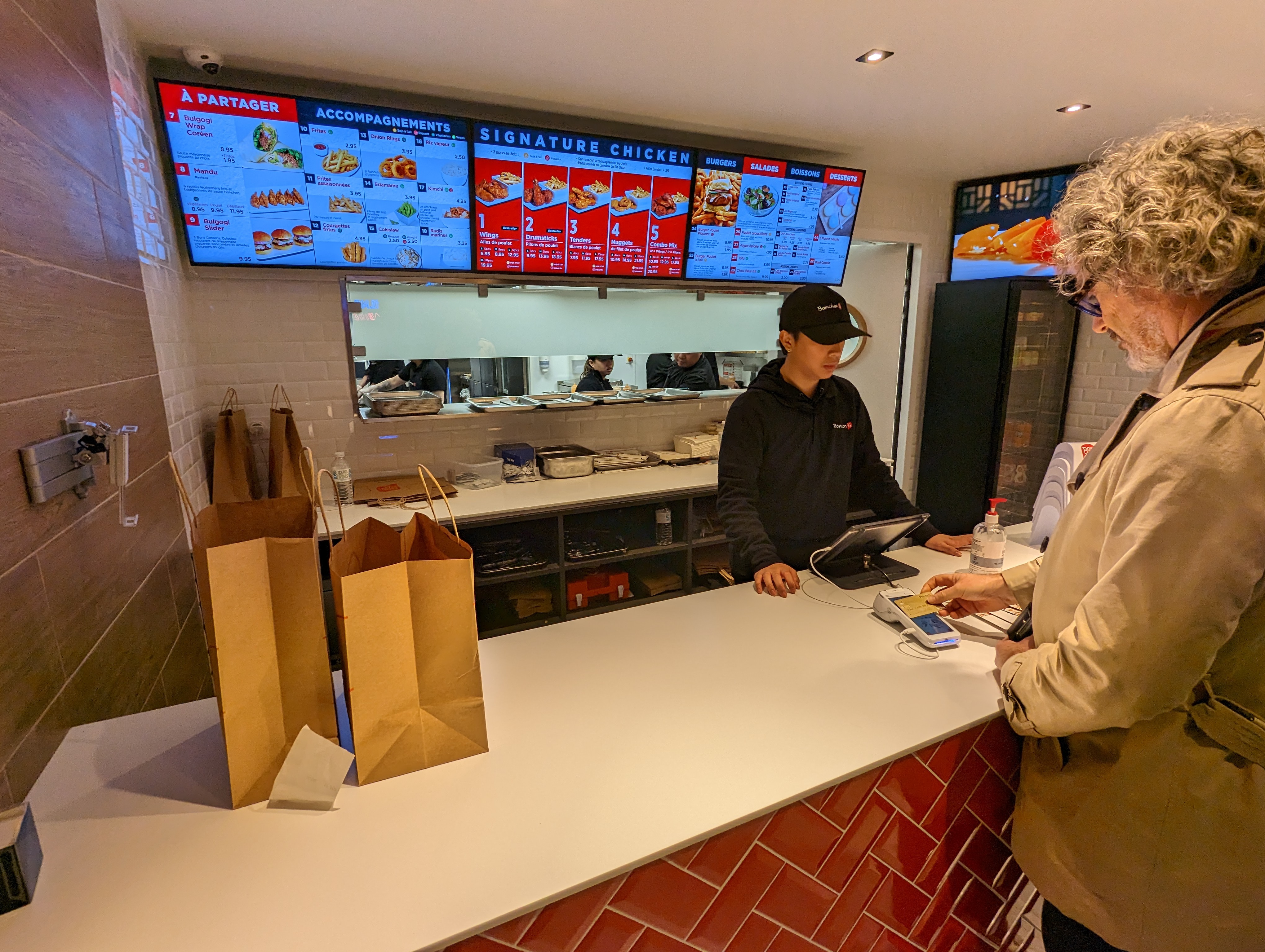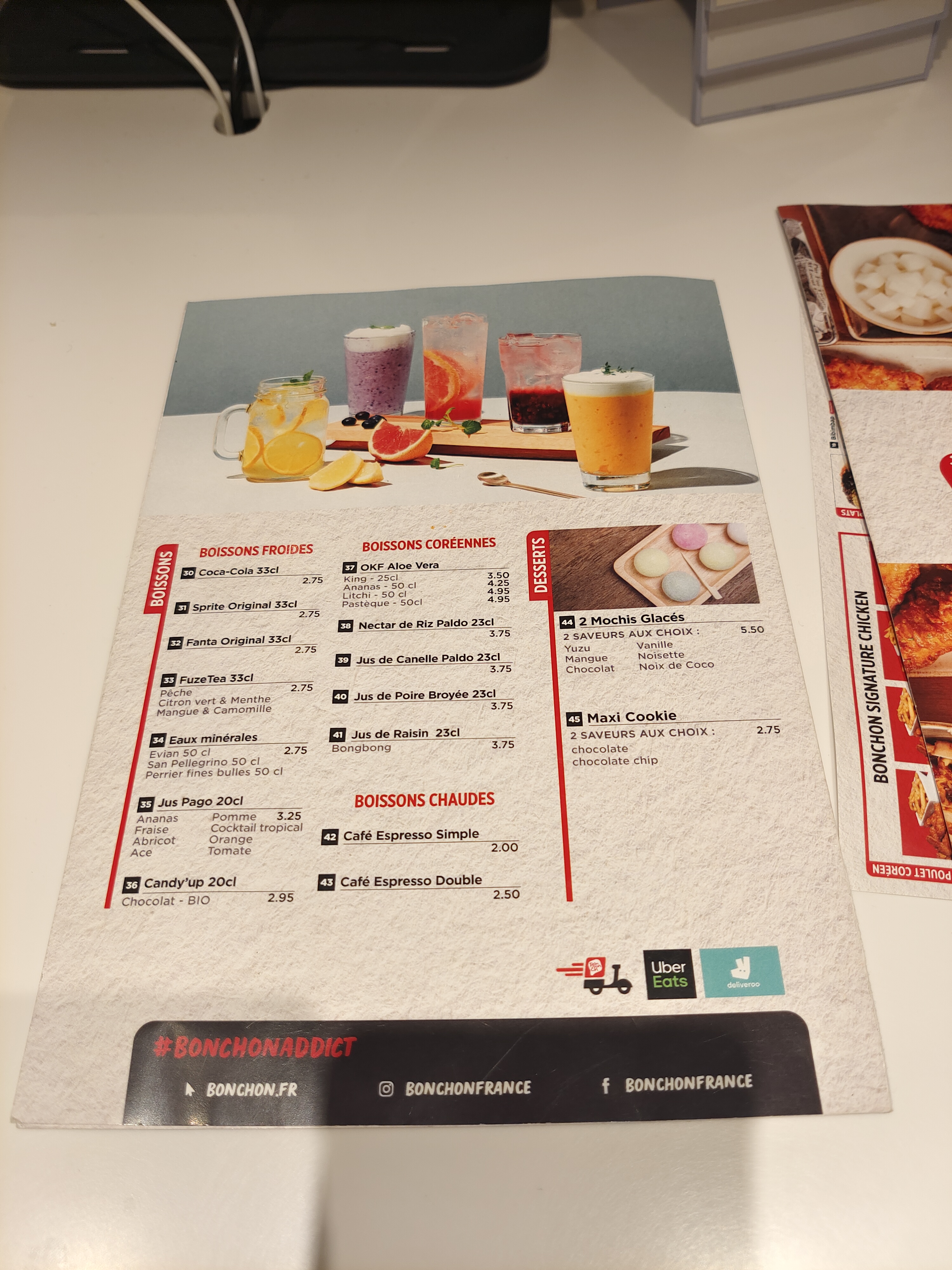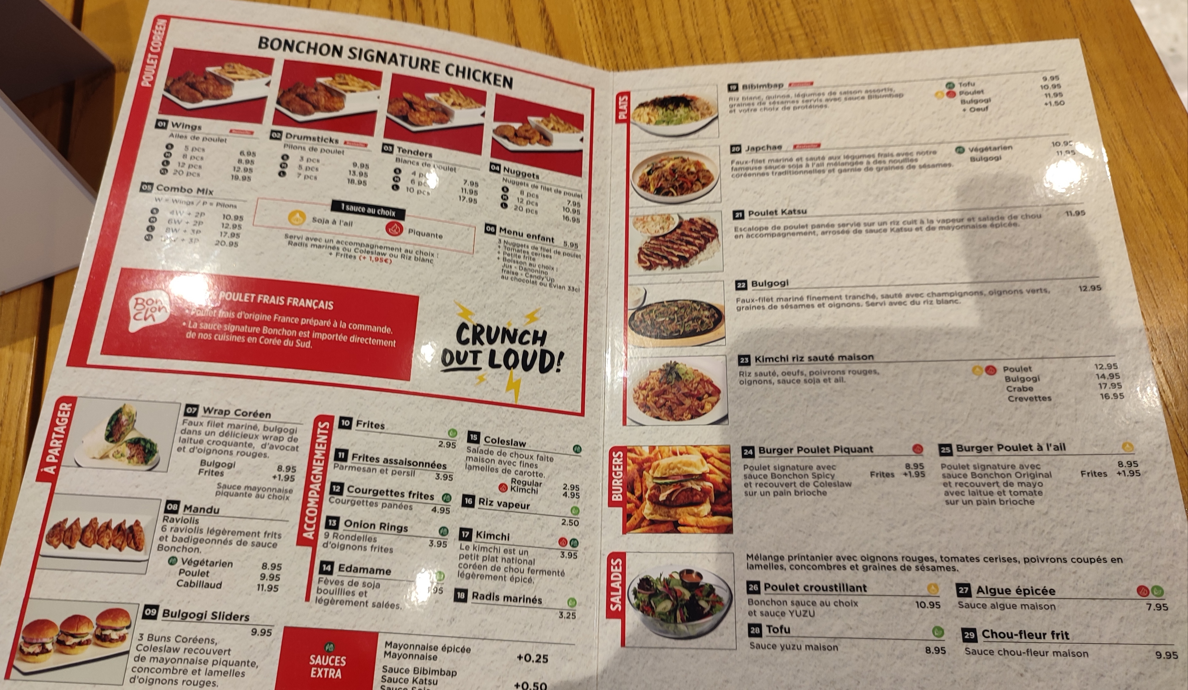 Très moyen. Leur système de menu n’a aucun sens, il faut payer en plus pour avoir une boisson et même ajouter un supplément pour des frites surgelés bas de gamme. Au final, c’est surtout très cher pour ce que c’est. Oui le poulet est bon, certes, mais ca ne rattrape pas mon expérience globale. Les tables sont ridiculement petites et les chaises pas confortables. Franchement j’aurais mieux mangé et pour moins cher dans un vrai resto coréen. En photo : Un menu à presque 20 balles… (Kimchi a 4 euros).