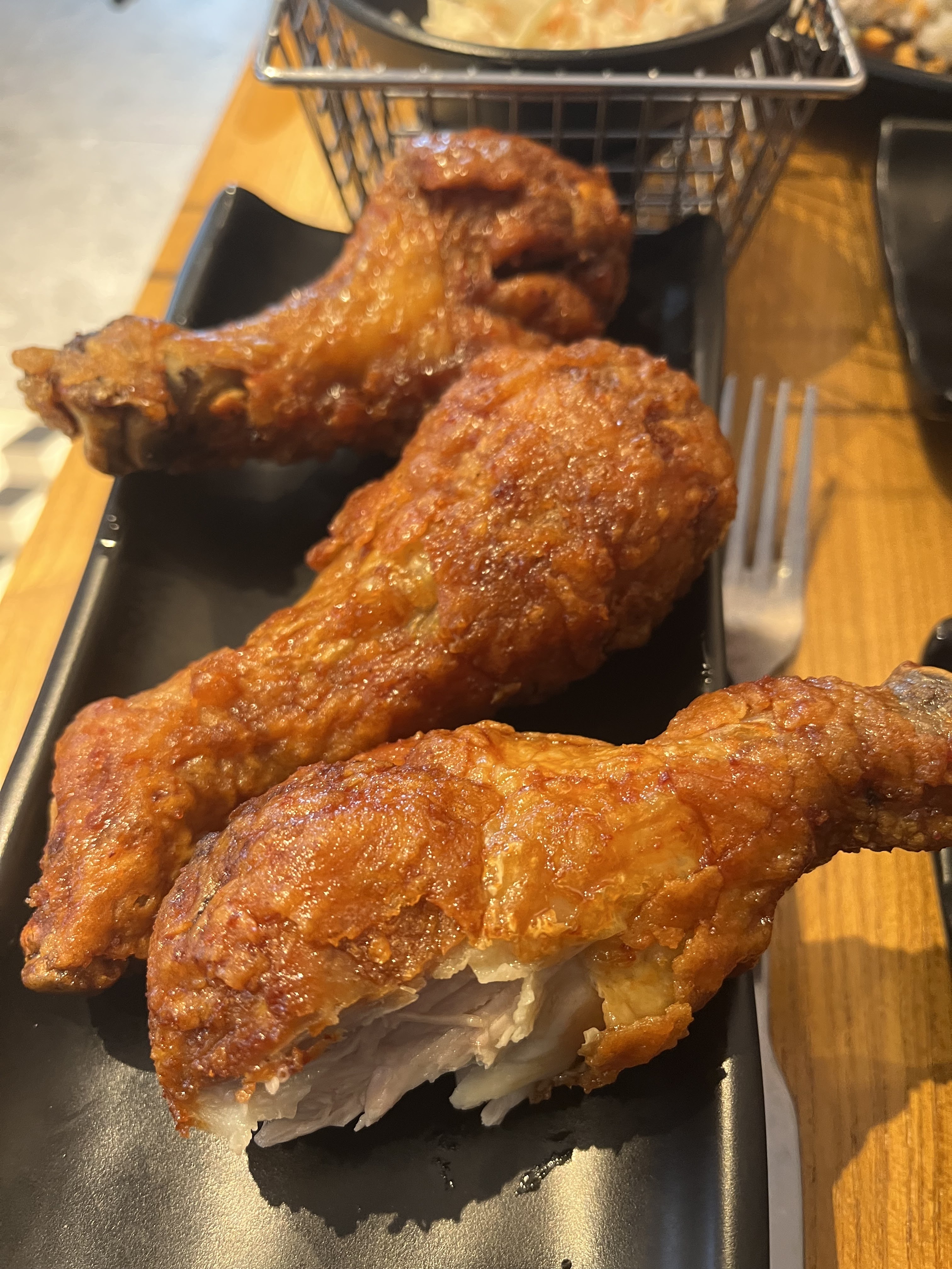 J’ai pris un mix de poulet XXL (suffisant pour 2-3 personnes). Le poulet était tendre à l’intérieur et croustillant à l’extérieur et avait bon goût avec la sauce de soja à l’ail. En revanche, le poulet était mal assaisonné et certains morceaux trop salés et d’autres pas assez. Les accompagnements n’étaient pas terribles : les frites avaient une bonne texture mais un arrière goût et les radis n’étaient pas vinaigrés mais seulement sucrés. Nous avons également commandé du poulet, cette fois-ci avec de la sauce piquante, et on ne sentait QUE le goût du piment, qui n’est pas très subtil et qui couvrait toute la saveur du poulet (je ne parle pas du niveau de piment mais bien de la saveur) Le service était très rapide (5min environ) Globalement, bon potentiel même si certains aspects pourraient être améliorés
