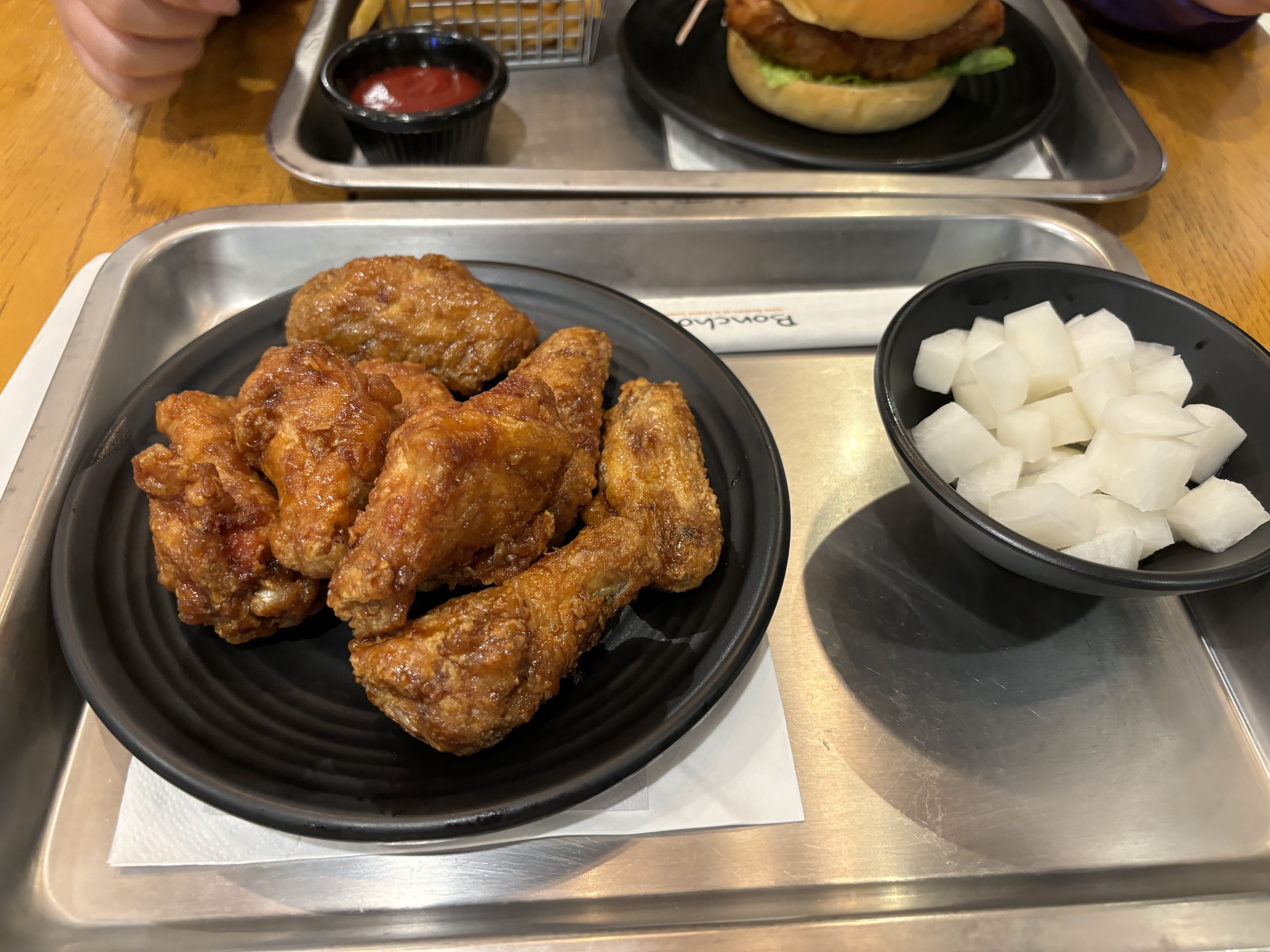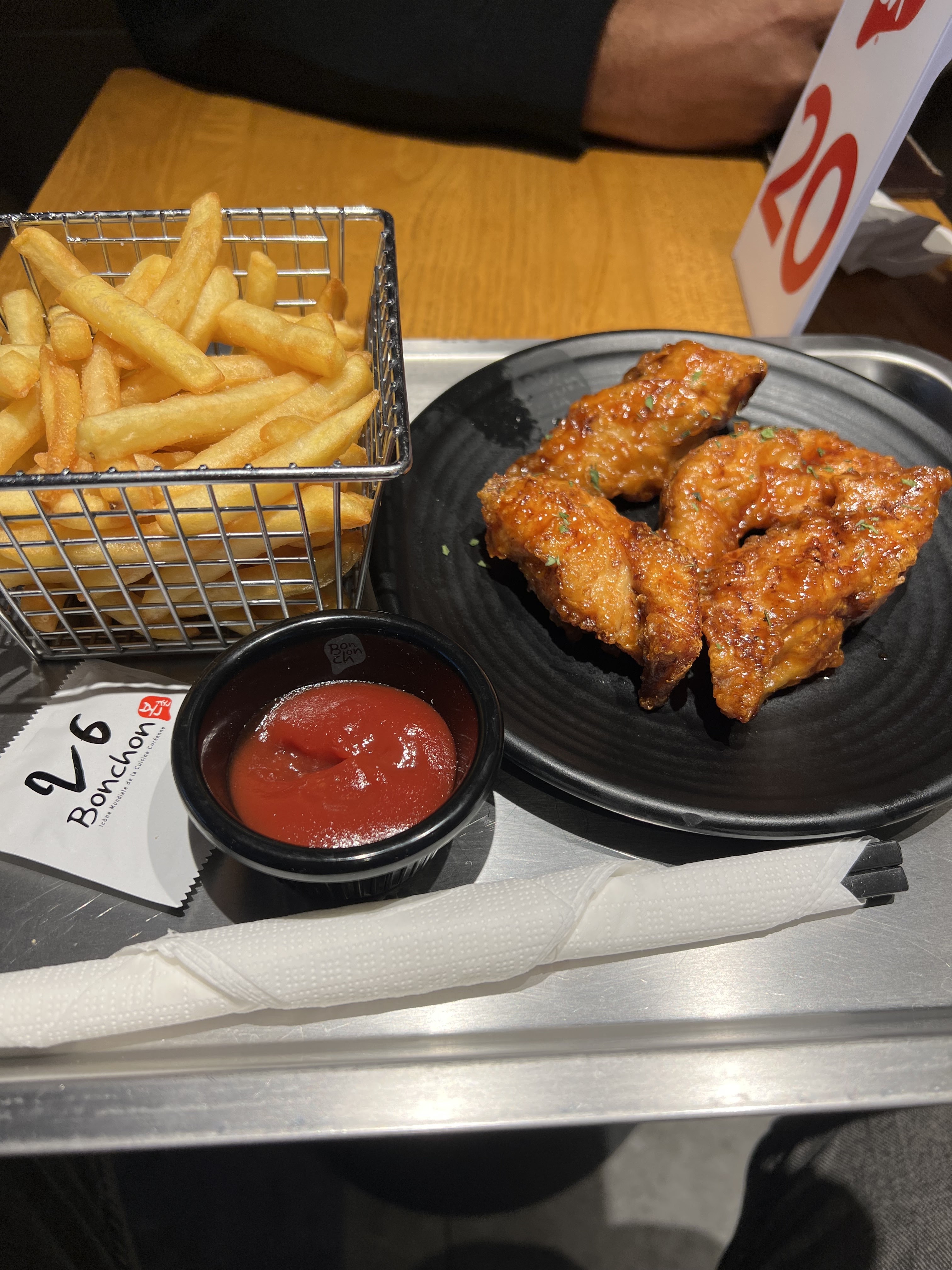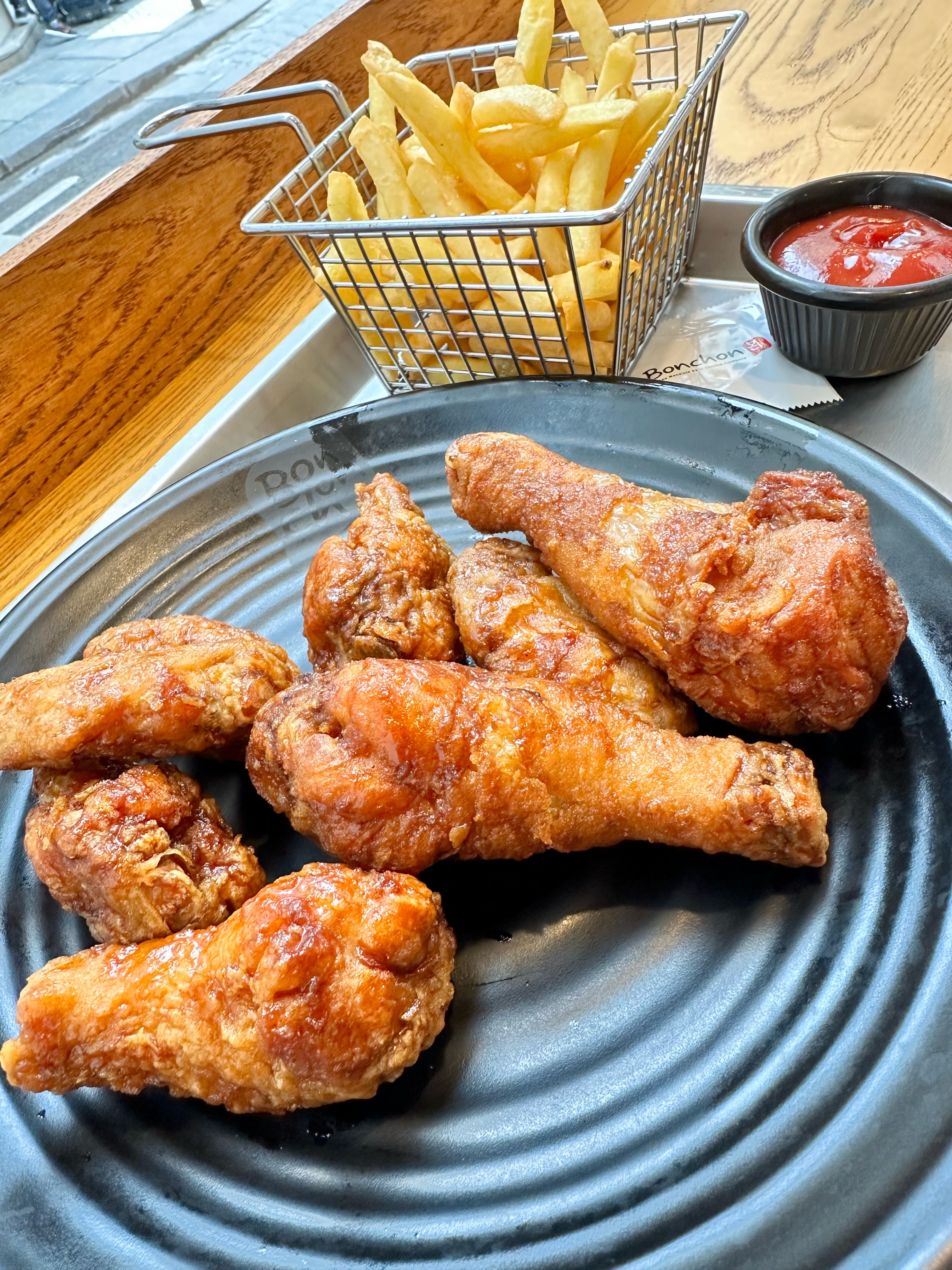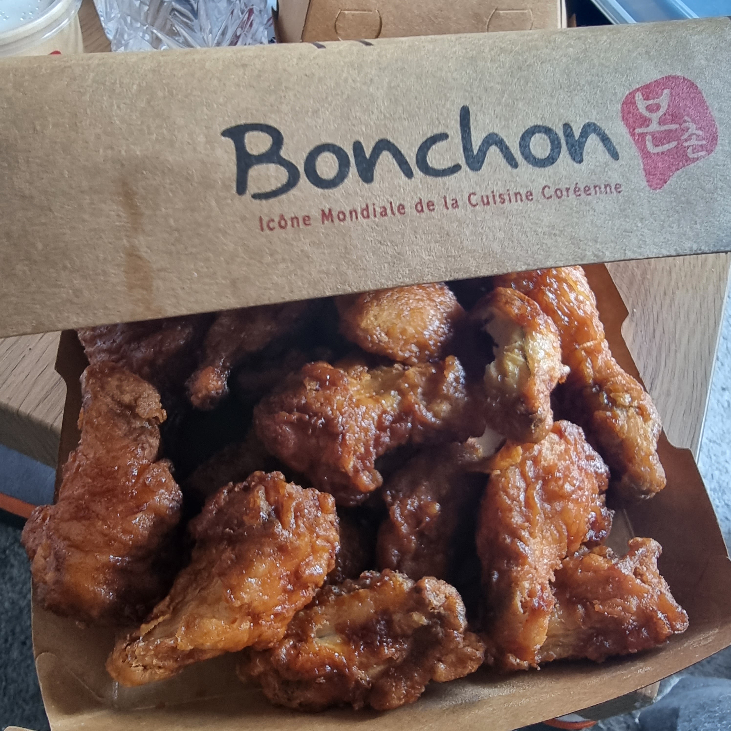 Le Bonchon est un restaurant servant du poulet frit coréen situé à 2 min à pieds du métro Strasbourg Saint-Denis et perpendiculaire au Boulevard Saint-Martin. Le poulet est vraiment croustillant et doux, nous avons l’impression que c’est uniquement la peau qui donne ce côté crispy et non une chapelure. En revanche, dès qu’il reste que de la chaire (elle est quand meme tendre et pas sèche) … le poulet n’a plus de goût. En revanche, vraiment déçu des frites qui ne sont déjà pas comprises dans le menu, j’avais également ajouter un assaisonnement en supplément (qui n’apporte quasiment rien de plus) donc je déconseille fortement. À défaut de pouvoir manger sur place, malgré les quelques places au rez-de-chaussée et à l’étage supérieur … je déconseille de venir manger sur place si le groupe dépasse les 4 personnes. Je recommande quand même car le poulet est préparé d’une façon originale !