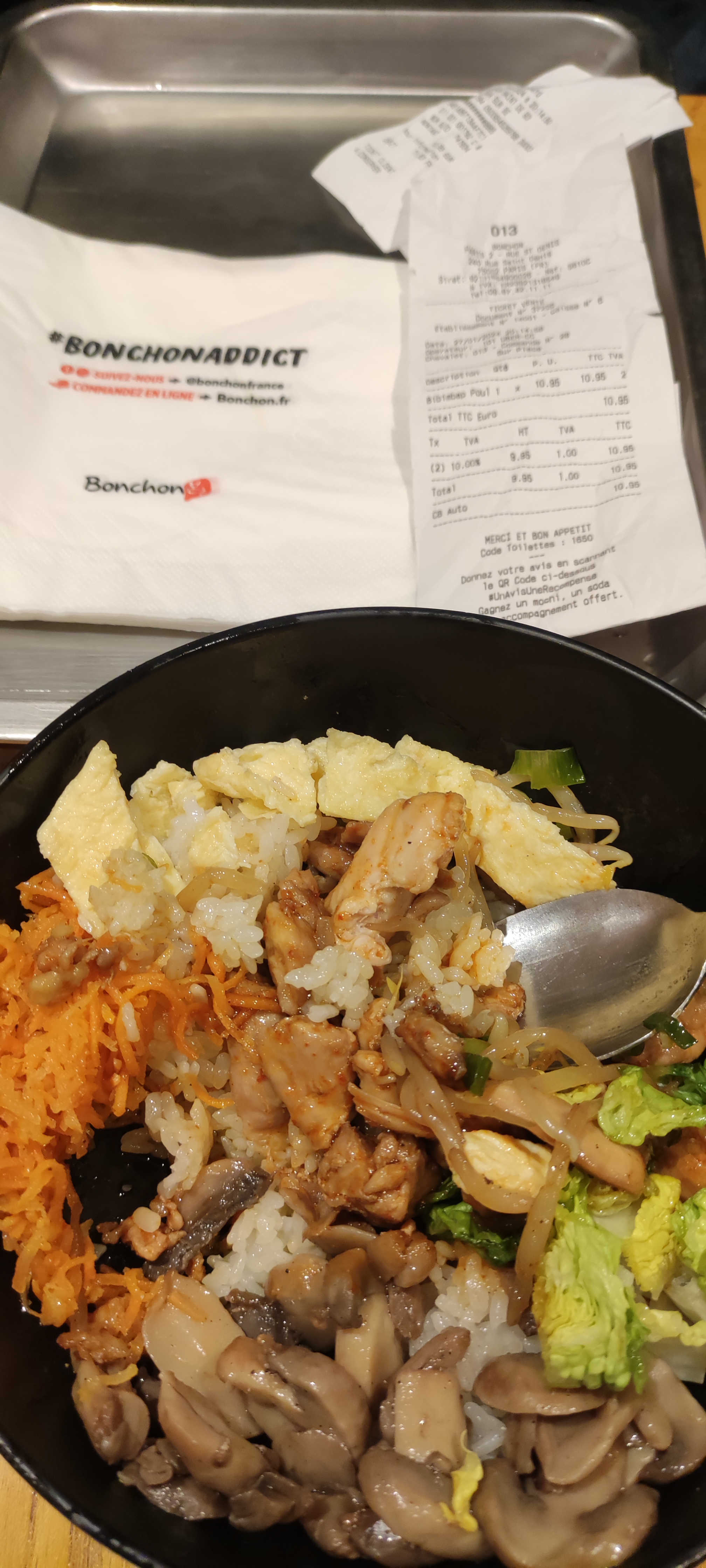 Commande passée rapidement et temps de preparation ok. Impossible d'acheter uniquement des nugget. Oublie de la mayonnaise payée pourtant en supplément. Double portion de riz dns le poulet katsu, c'est etrange. Prix ok pour deux plats complets. Attention, pas de couverts autres que des baguettes.