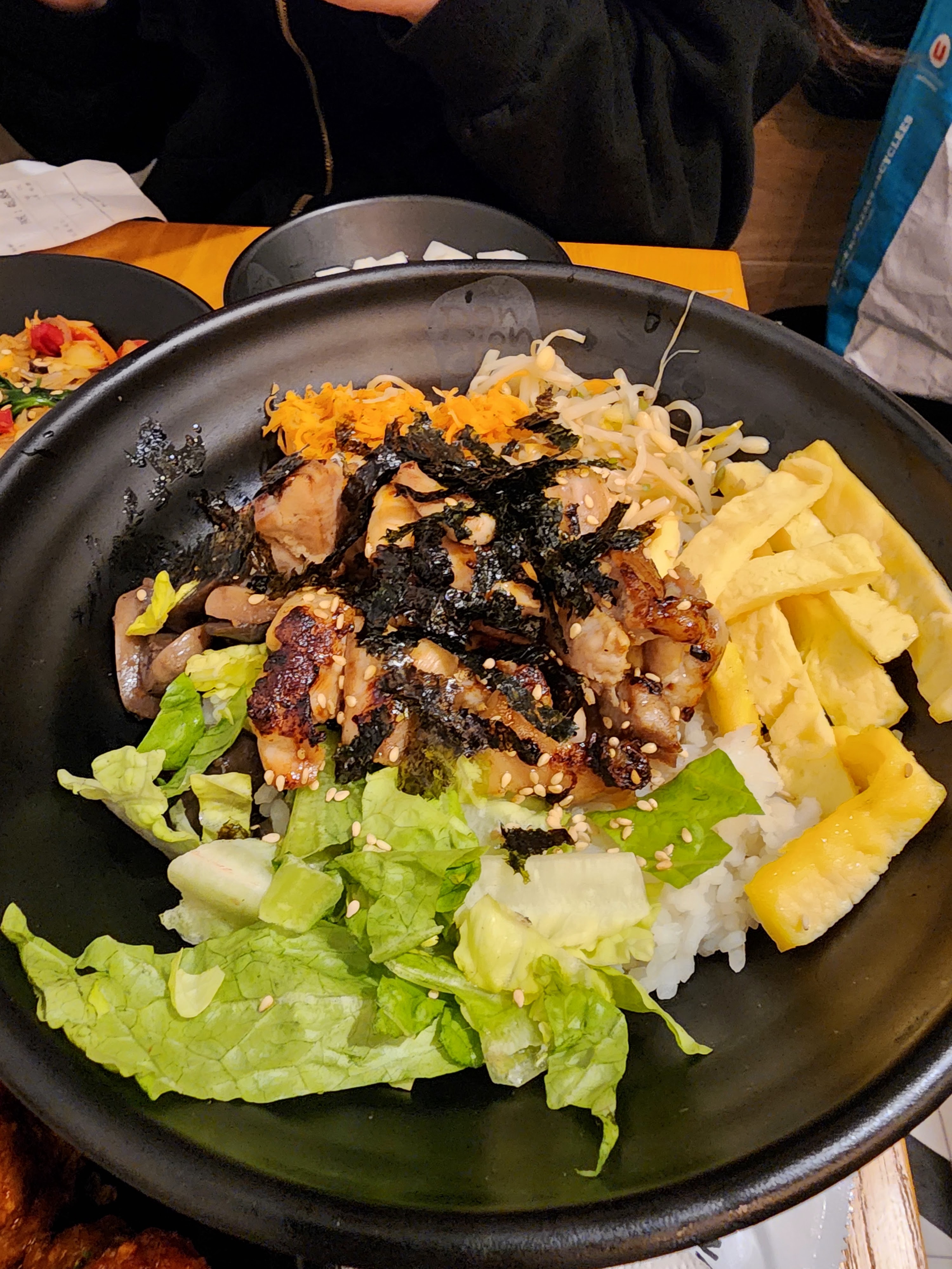 Mon bibimbap était copieux. Dommage qu'il y ait beaucoup trop de riz et peu de légumes et de garniture. Mais le goût était bien présent. Les nuggets de poulet sauce à l'ail sont savoureux. Les boissons ne sont pas comprises et sont un peu élevées (2.5€-3€).