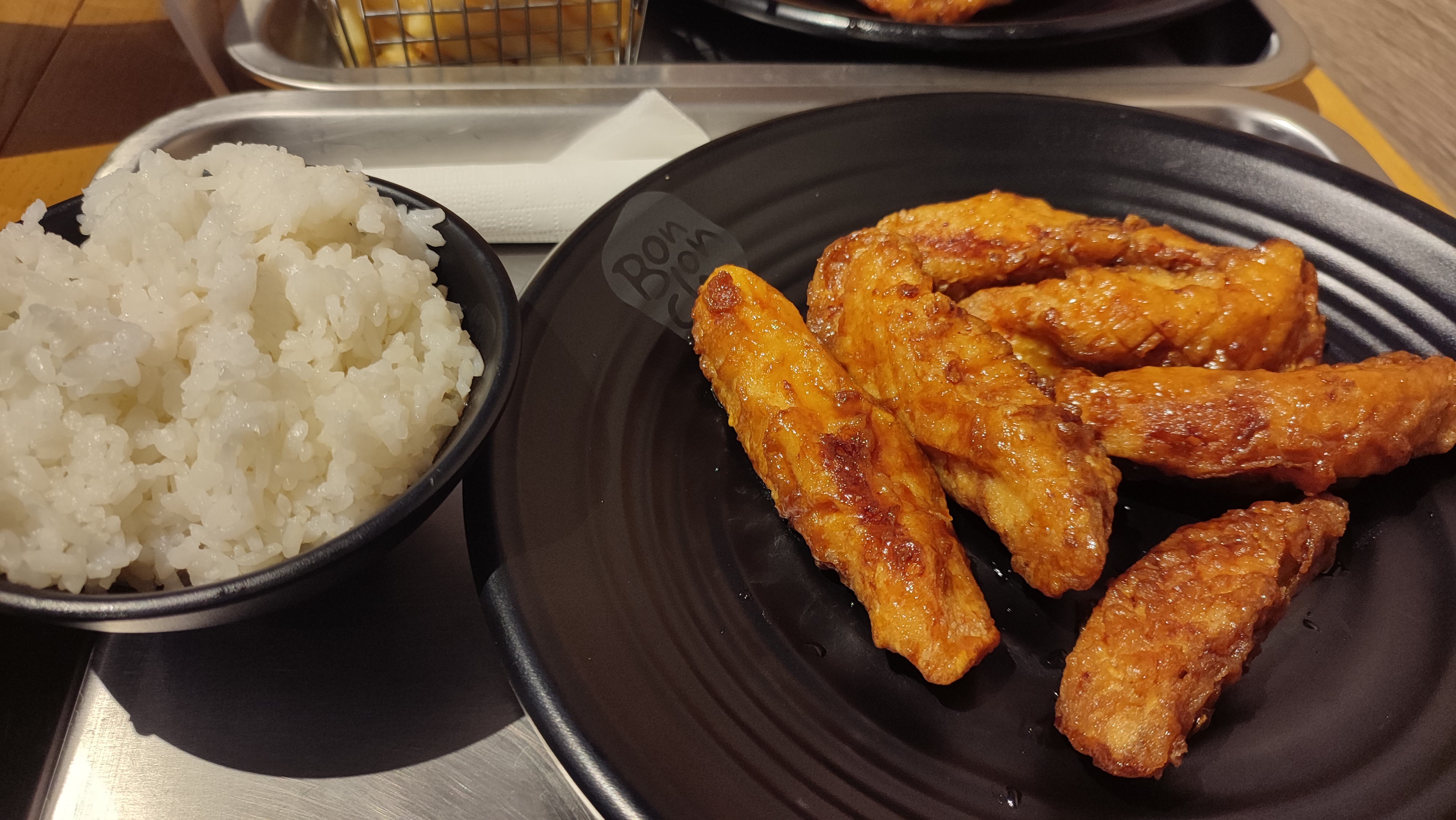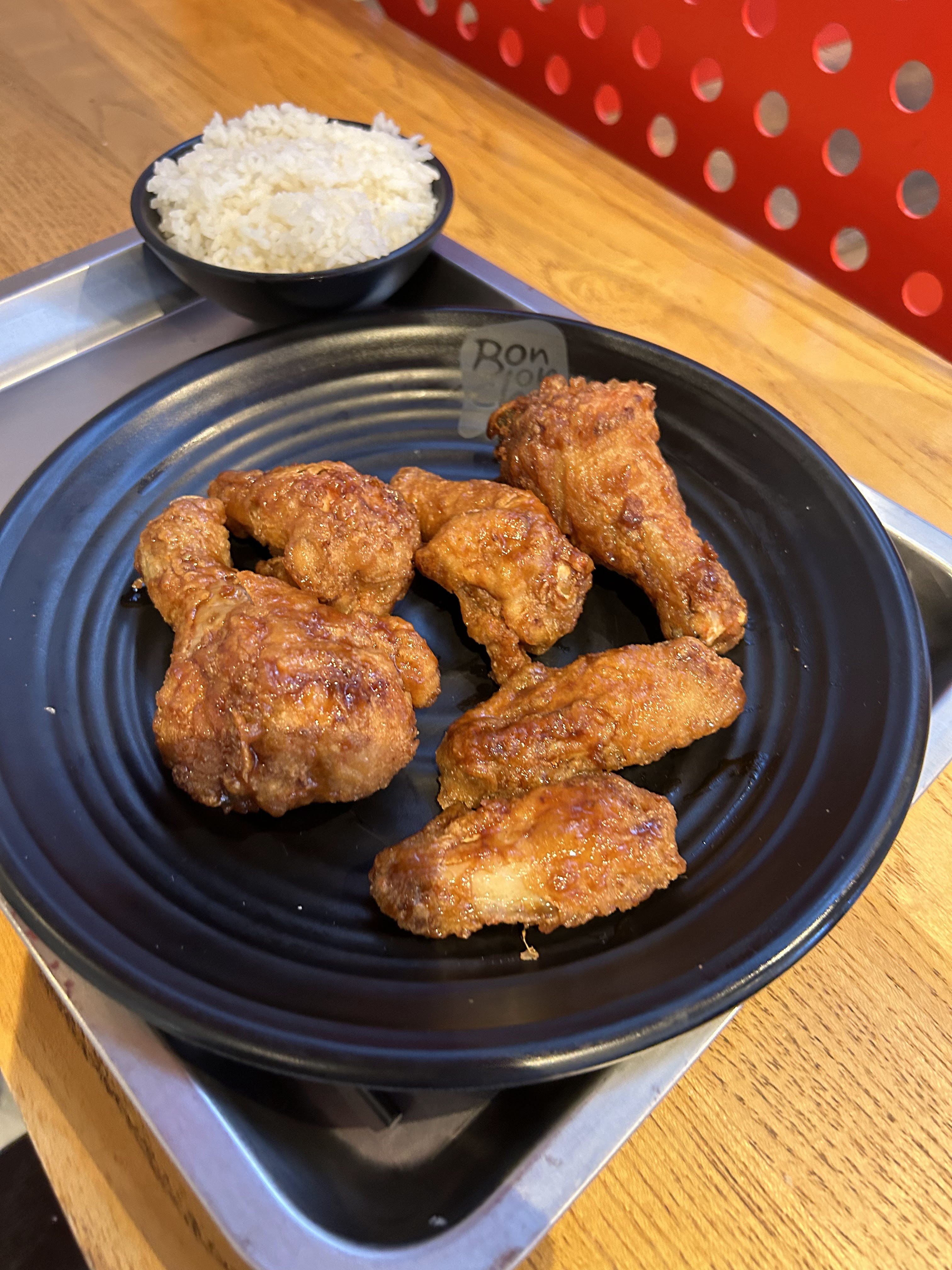 Poulet et wings bien croustillant , bien assaisonné . Prix raisonnable 13€ par personne en moyenne . Malheureusement un certain relâchement sur les accompagnements , précisément le riz blanc inclu dans le menu: le riz était sec et pas assaisonné et il faut payer pour avoir de la simple sauce soja. Une très belle expérience que l’accompagnement ne saura pas ruiné