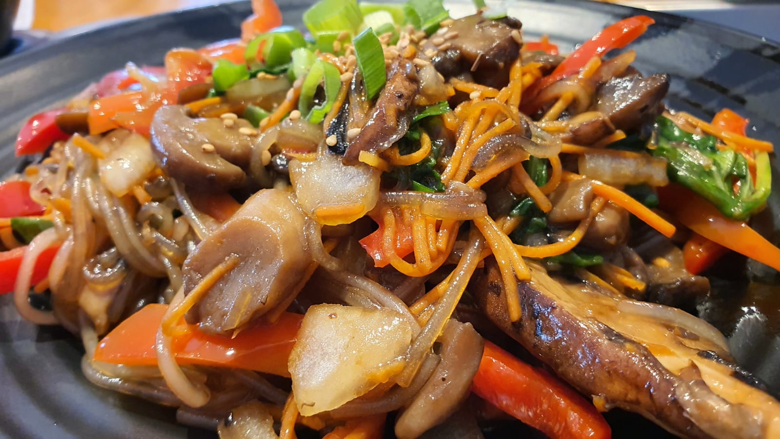 Le poulet n'est pas frit minute, il était tiède. La sauce soja ail est très sucrée. Le japchae était fade et beaucoup trop huileux.