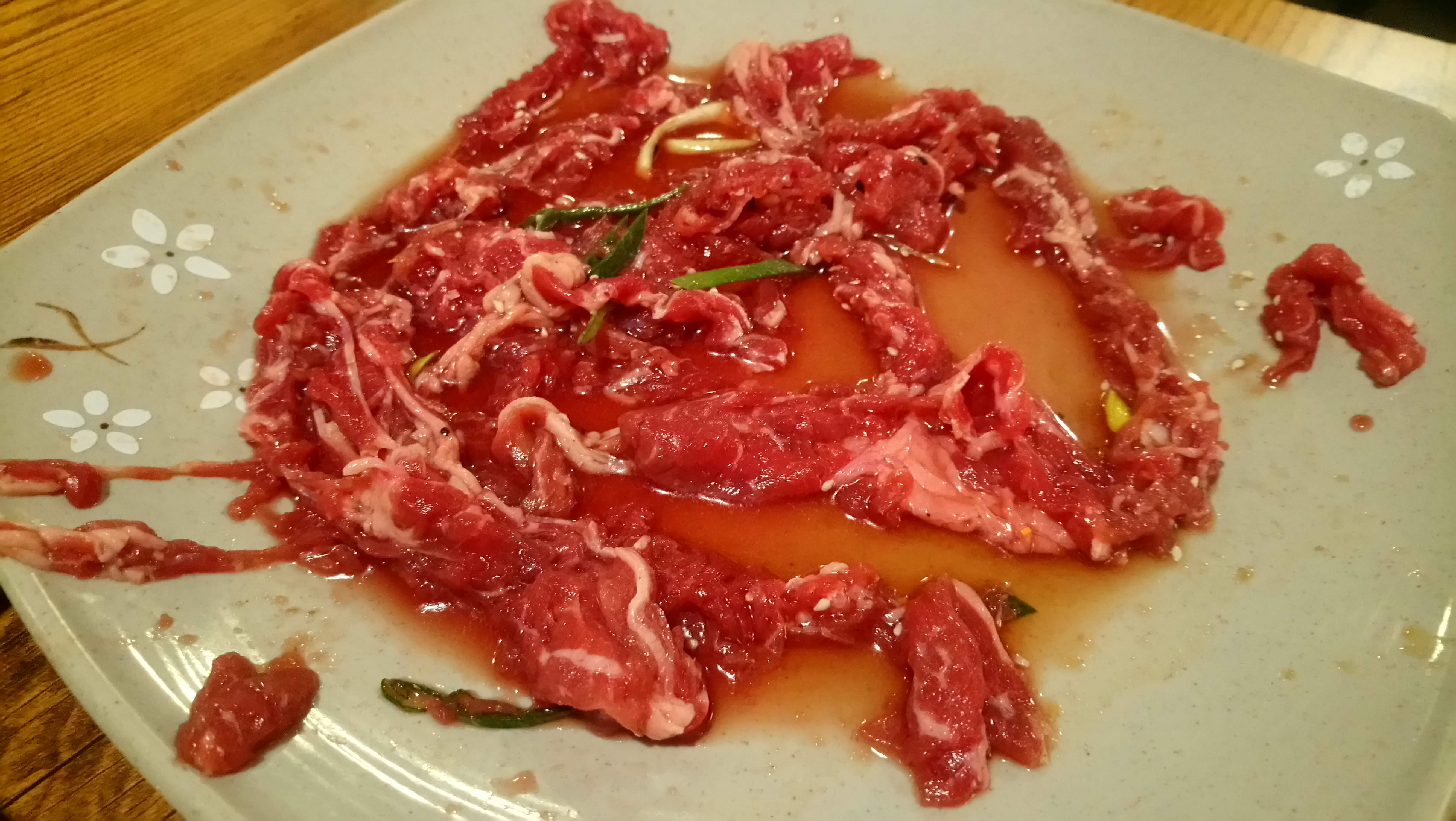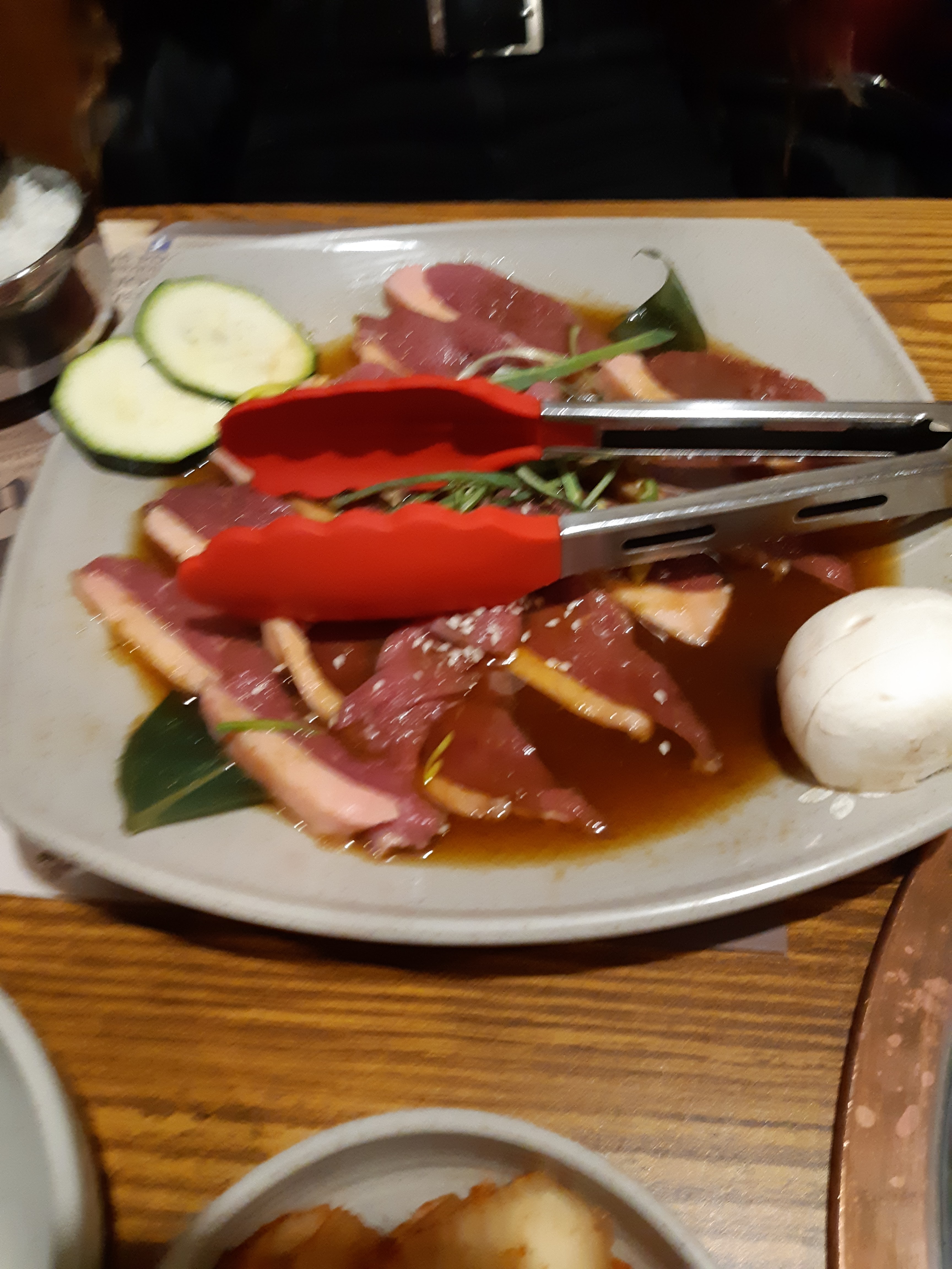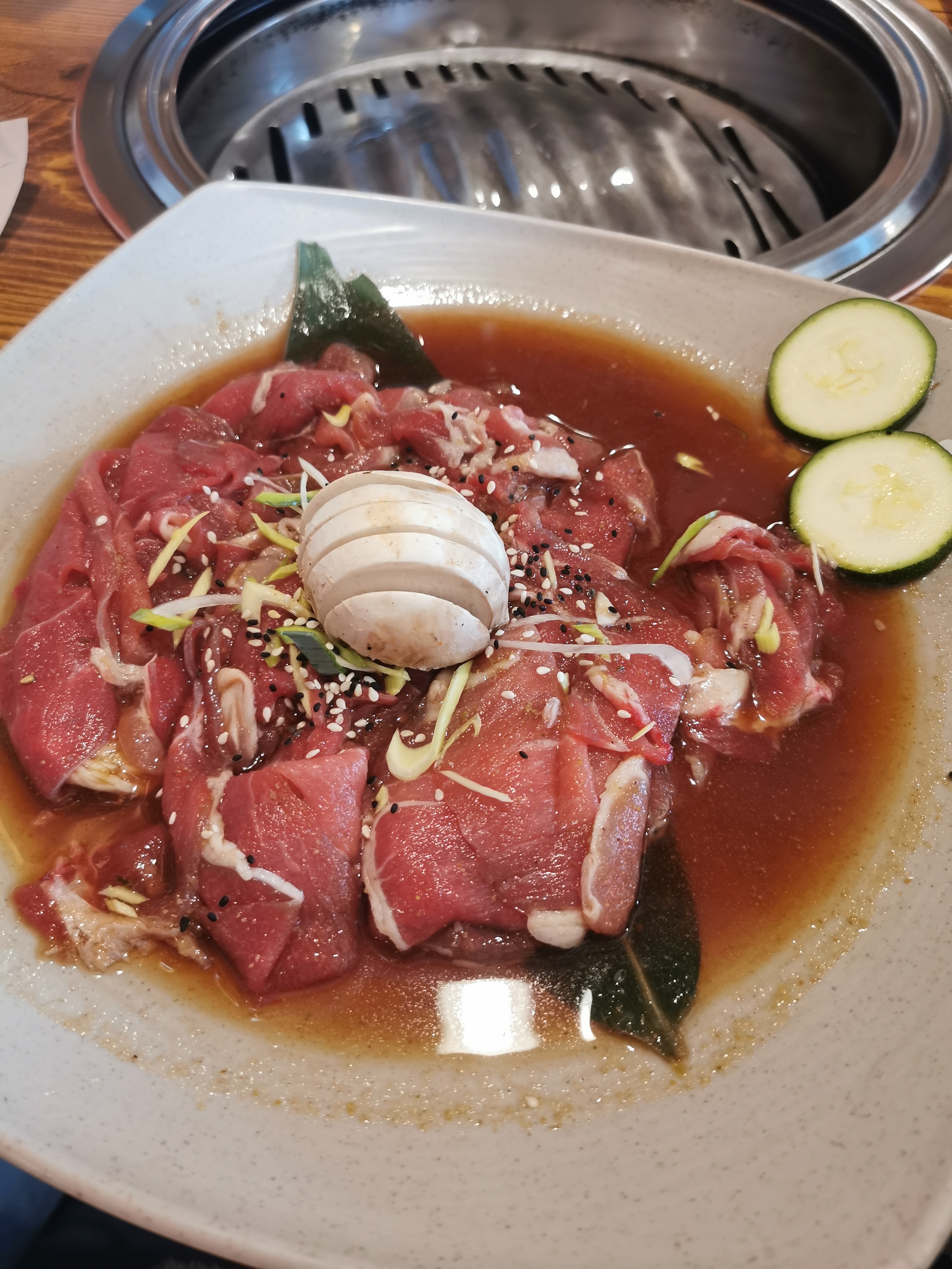 La viande est très parfumée et tendre grâce à la marinade. En revanche, lorsque l'on vient pour la première fois, il n'y a aucune explication donnée... bilan, la plaque de cuisson devient vite carbonisée. Le goût s'en fait ressentir. Très peu de légumes servis
