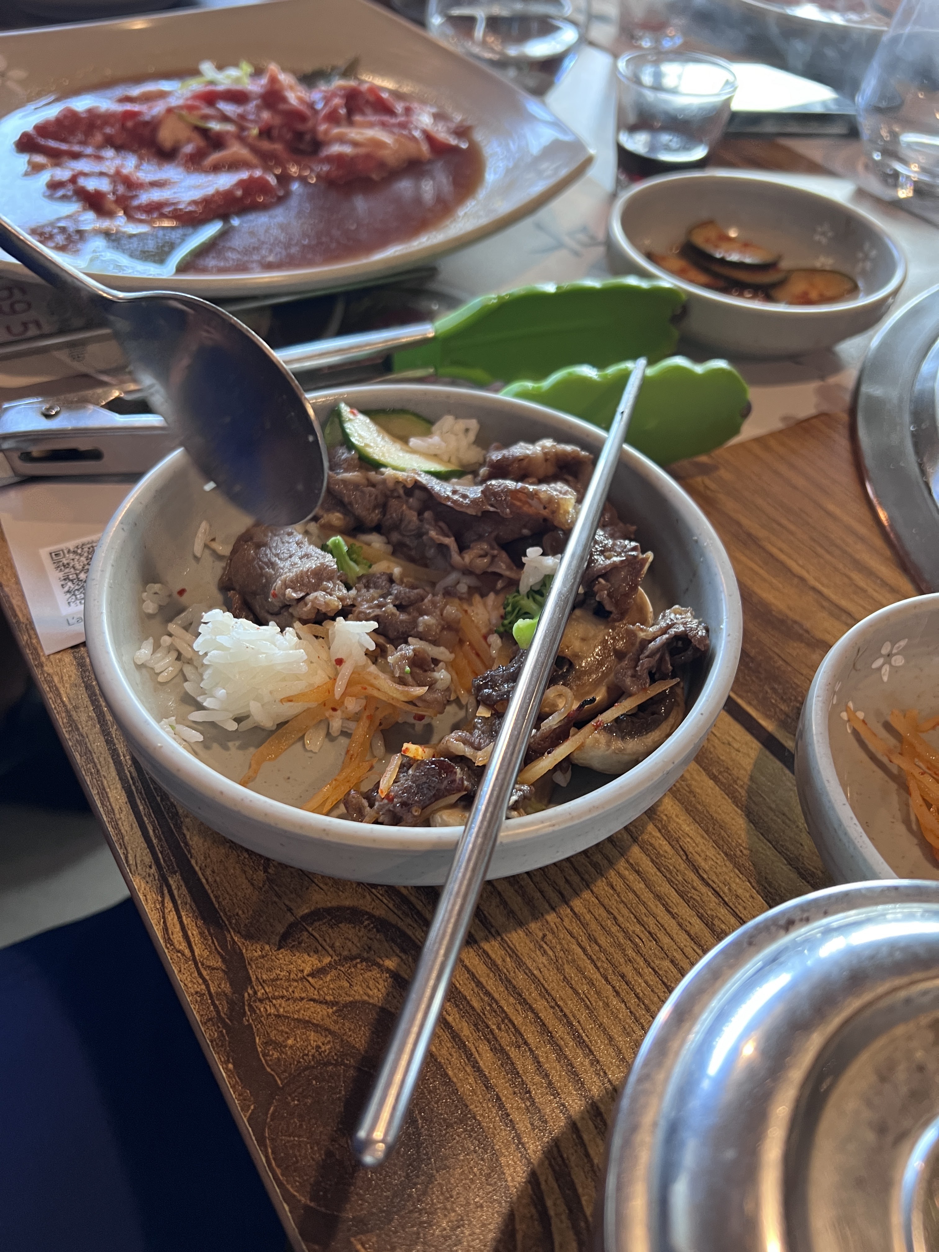 Restaurant atypiques, une cuisine des plus délicieuses, le service était parfait et surtout nous avons pas eu à attendre des heures. Si vous prenez un extra attention à vous ce n'est pas un petit extra... j'ai pris du kimchi avec mon bulgogi car je pensé qu'il n'allait pas y en avoir assez de base... qu'elle erreur ! Le seul bémol du restaurant cest la taille des tables, nous étions 5 et cetait tetris pour manger...