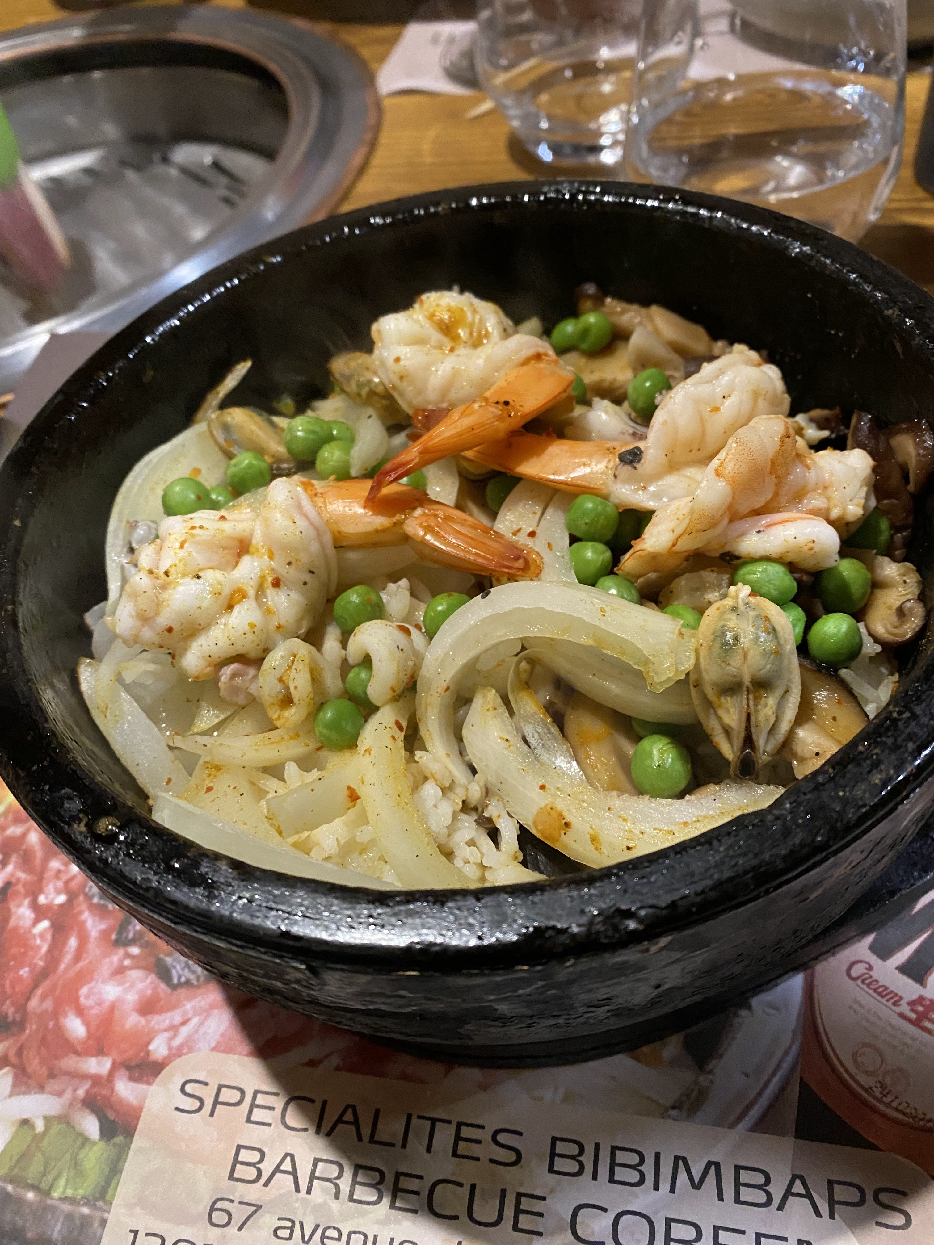 Arrivés à 19h, nous étions parmi les premiers et le service a été ultra-rapide : pour se débarrasser de nous ? Les bibimbaps étaient corrects, mais l'assiette de barbecue de porc à griller de ma fille n'était en fait qu'un tas de gras (dommage, je n'ai pas pensé à prendre de photo). Le responsable nous a dit que c'était normal, que le porc c'était gras, mais a tout de même accepté de nous changer l'assiette pour du poulet. Nous sommes partis sans prendre de dessert, et l'addition dépassait déjà les €80...elle était encore plus assaisonnée que les plats !