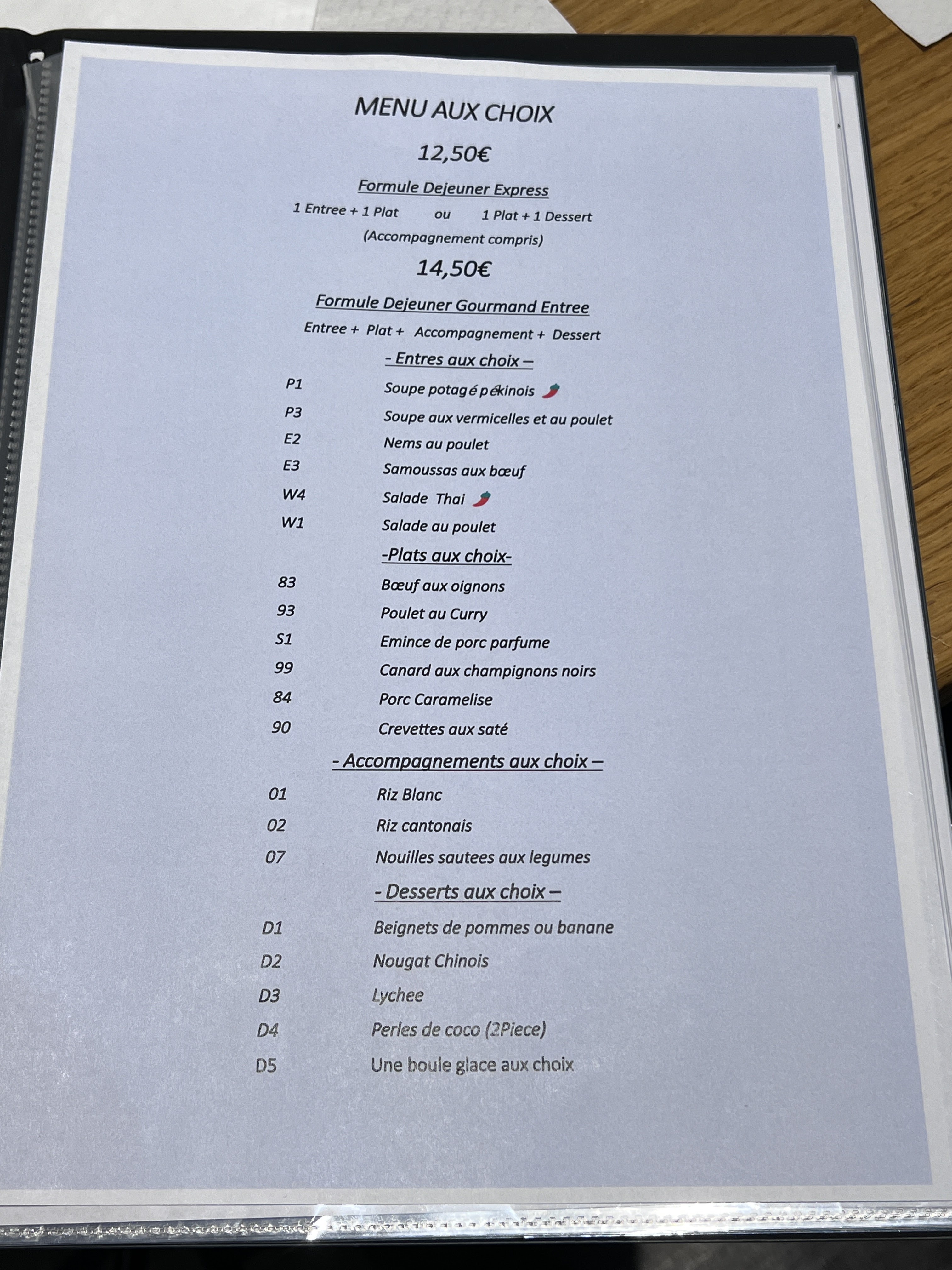 Restaurant Asiatique. La carte propose des plats chinois, vietnamiens, thaïlandais, etc. Exemple une soupe Pho sans coriandre fraîche. La cuisine est bonne mais peut-être un peu trop tournée vers l Europe et la France. Le service est rapide et courtois. Les prix sont intéressants. Les travaux dans la rue gênent l accès mais ce petit restaurant vaut le détour.
