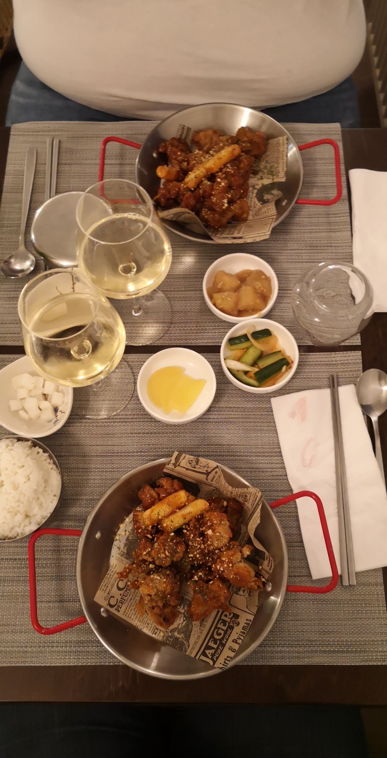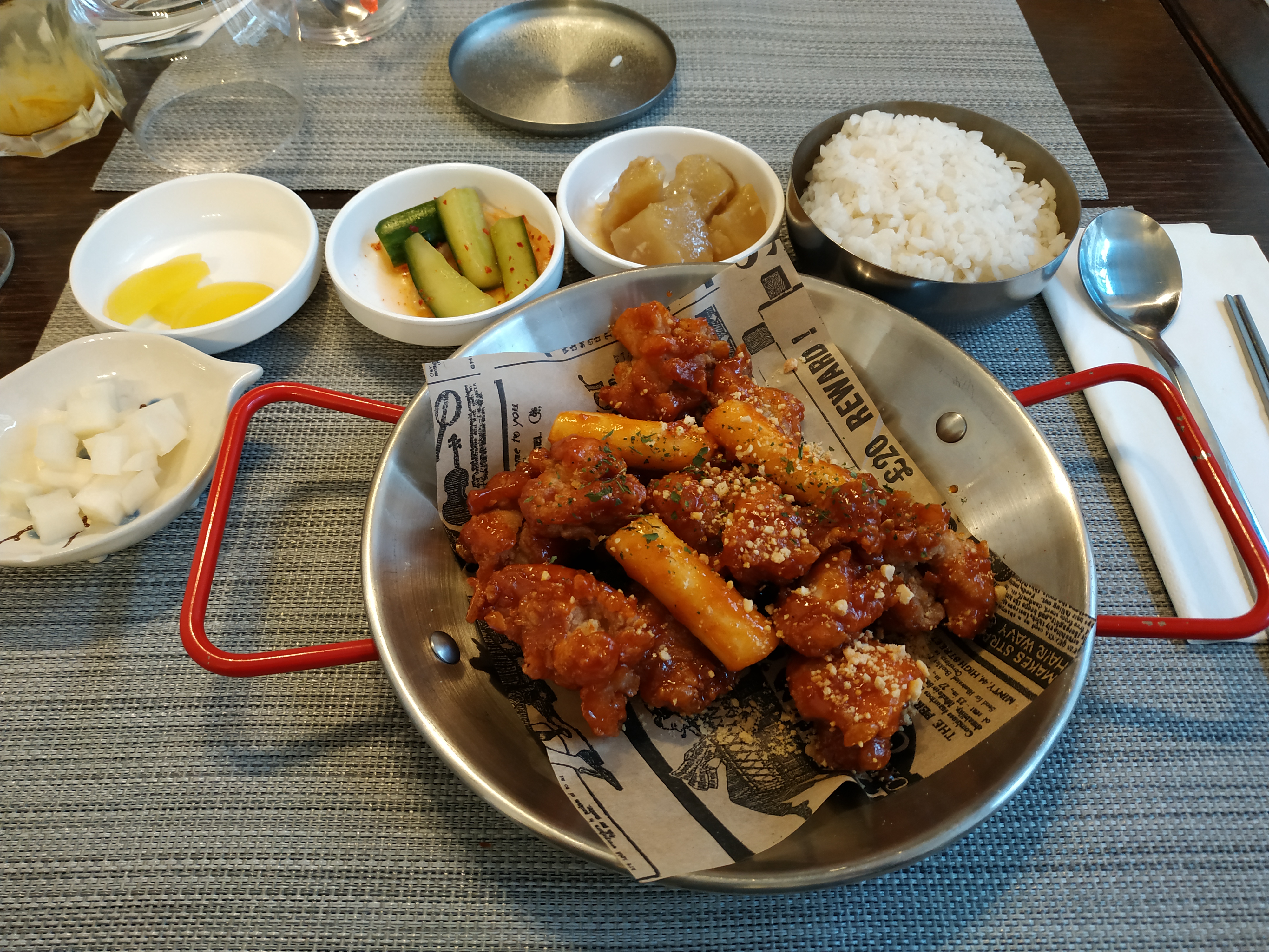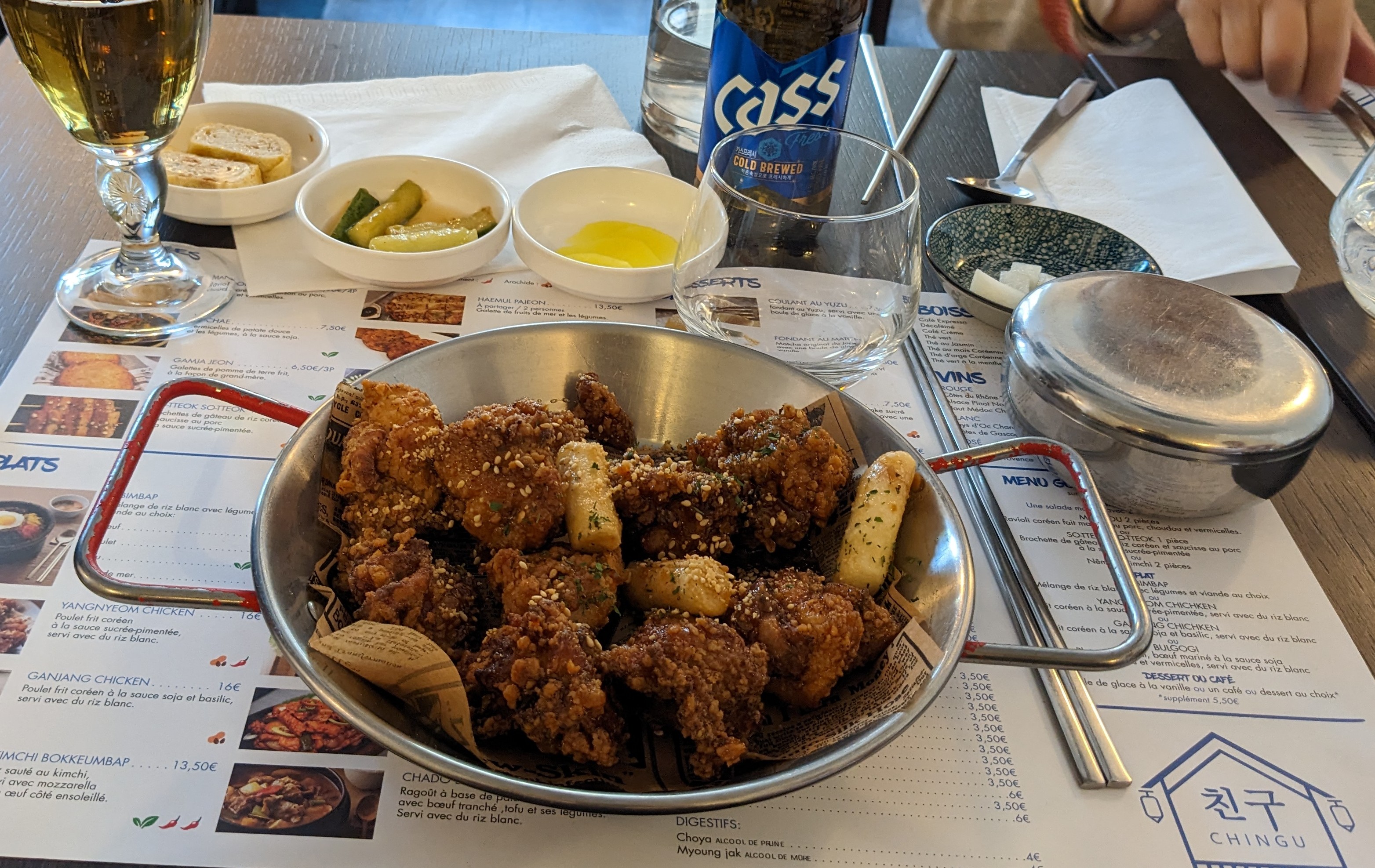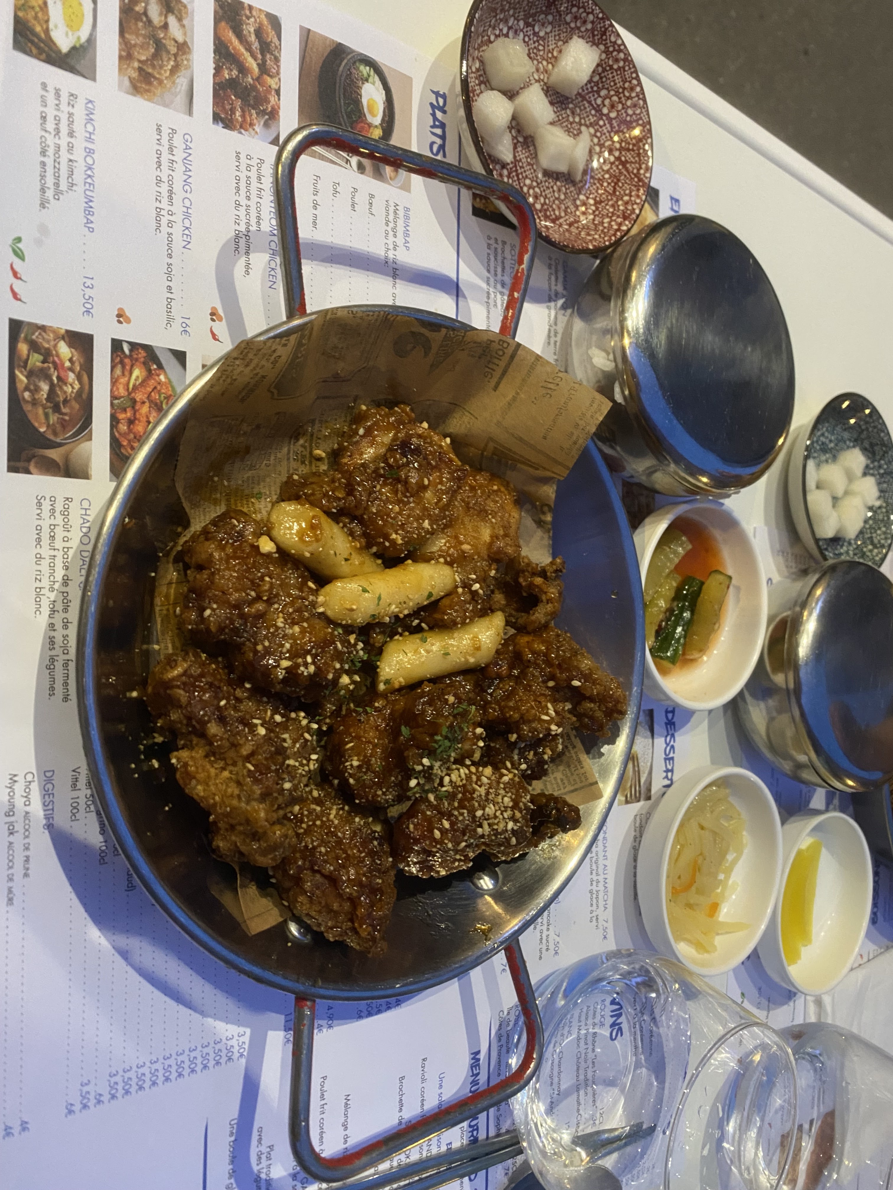 Très bien dans l'ensemble, le menu gourmand à 22.50€ est assez complet et suffisant même pour un bon mangeur. Le Yangnyeom chicken est très bon et servi en quantité raisonnable (avec 2-3 tteokbokki, de l'excellent riz et un assortiment de petits pickles), néanmoins je trouve qu'il n'est pas assez pimenté et légèrement trop sucré. Le Soju à 13€ est à éviter, c'est un mélange d'eau et d'éthanol, signe de mauvaise qualité rien à voir avec le vrai Soju à base de riz.