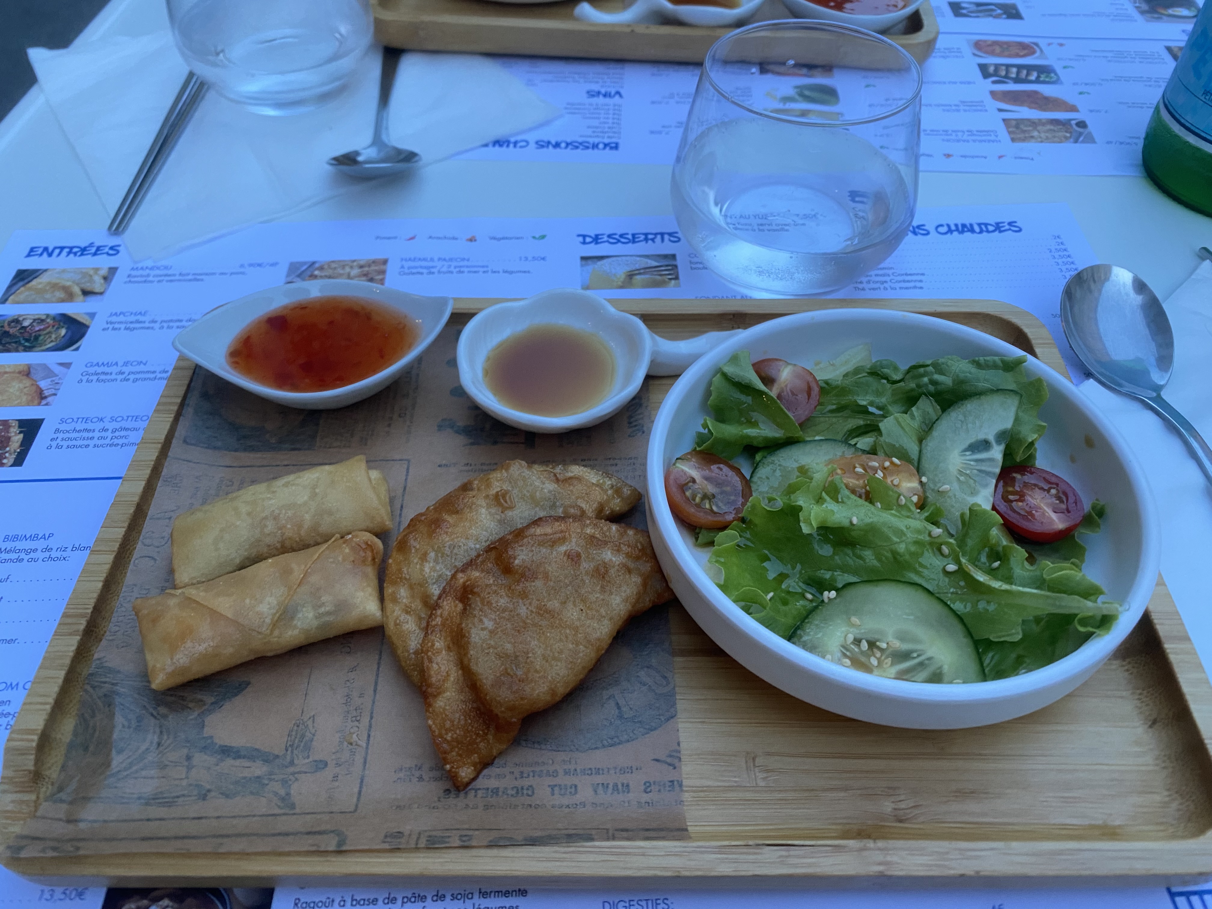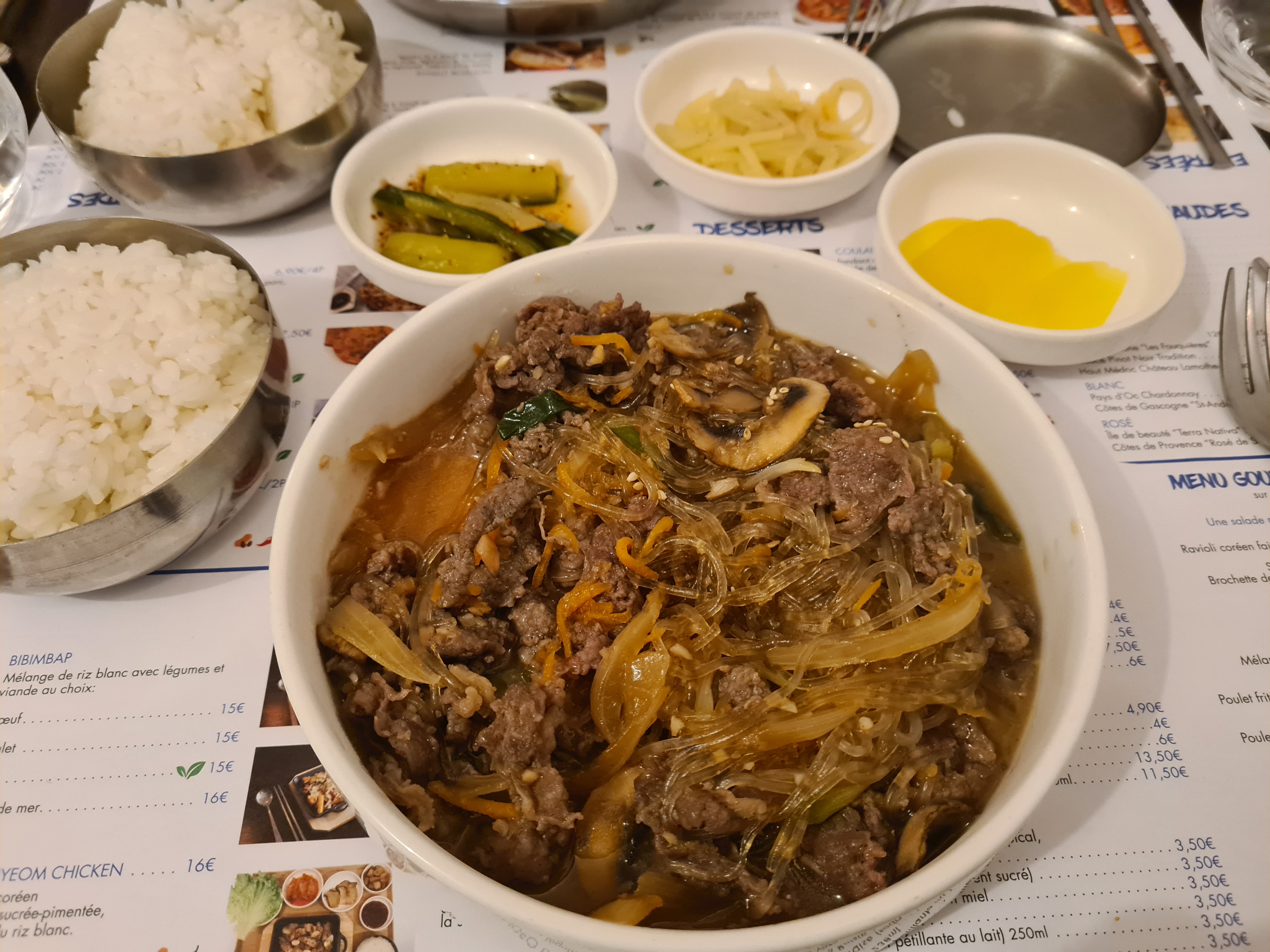 Rue piétonne, des tables suffisamment espacées pour manger tranquillement un samedi midi. La surprise de plats non connus et pourtant je vais régulièrement chez des coréens. Des saveurs variées jamais trop épicées. Ce fut une bonne surprise