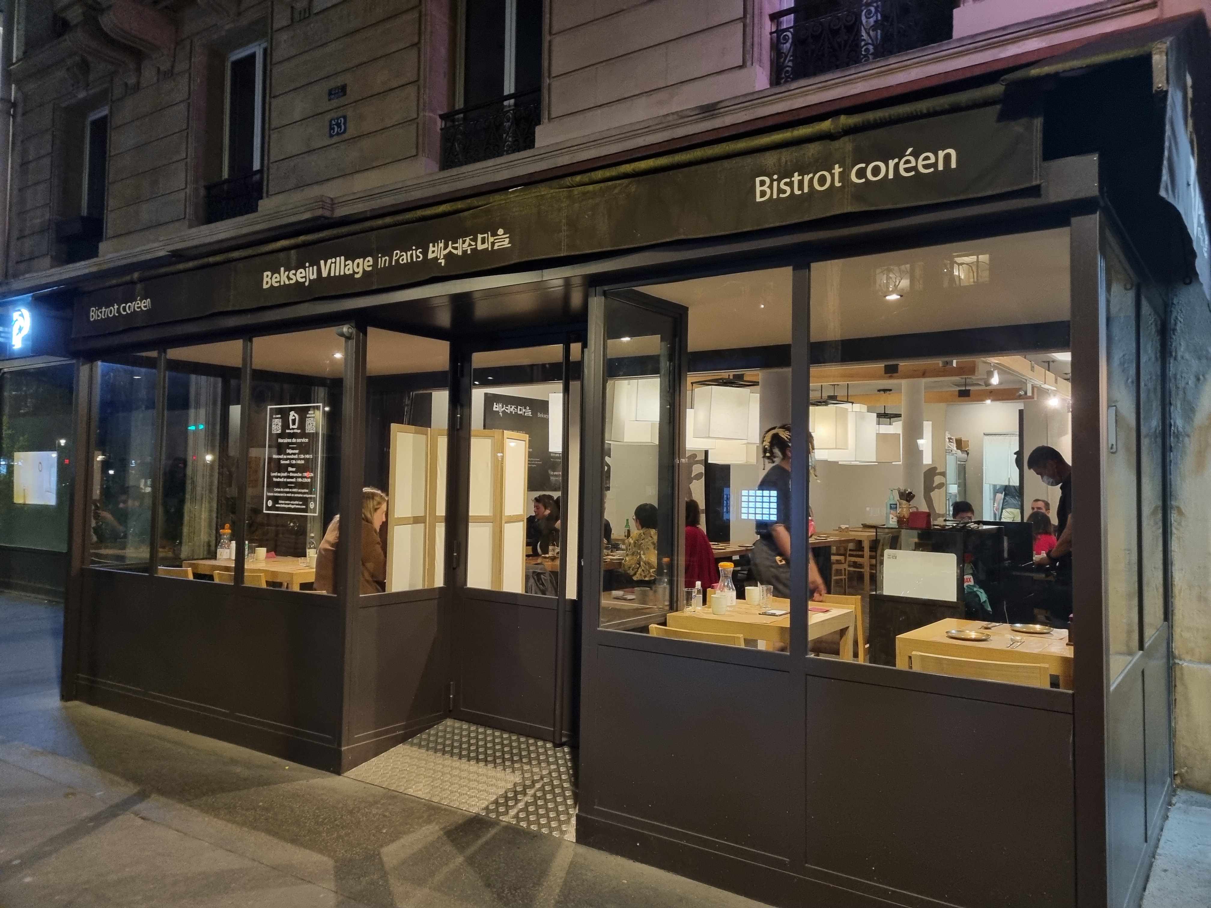 Bekseju Village est un restaurant coréen dans un cadre chic, la decoration du restaurant mélangeant avec succès modernité et tradition. La nourriture est très bonne, même s'il faut y mettre le prix (Compter au moins 25 € par personne hors boisson). Le jarret de porc pimenté est simplement exceptionnel, toutefois il est à réserver aux aficionados de piment uniquement (le serveur vous mettra en garde sur les plats particulièrement épicés, ce qui est appreciable). Pour ma part, je trouve les desserts sont moins convaincants que le reste de la carte. La maison propose également un choix très étendu d'alcool de riz .