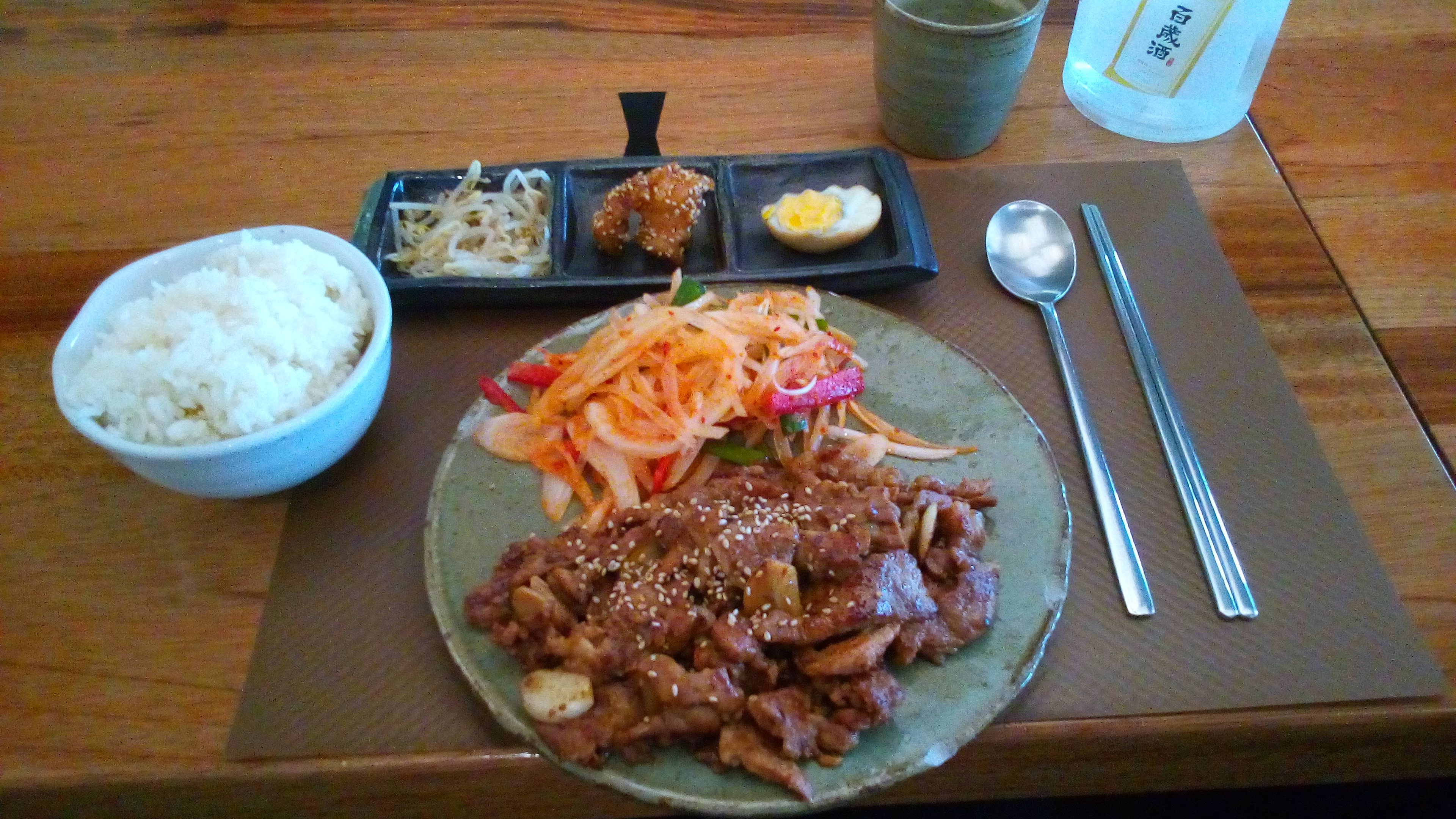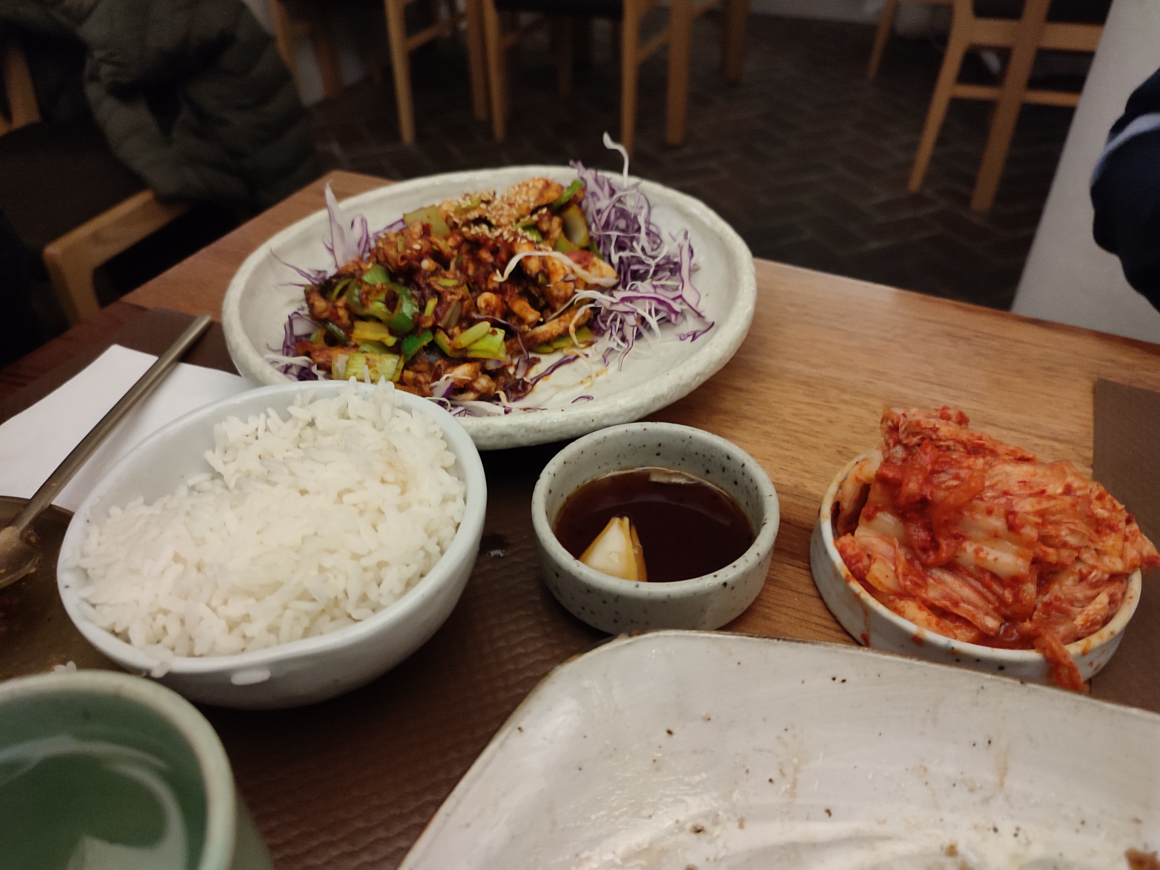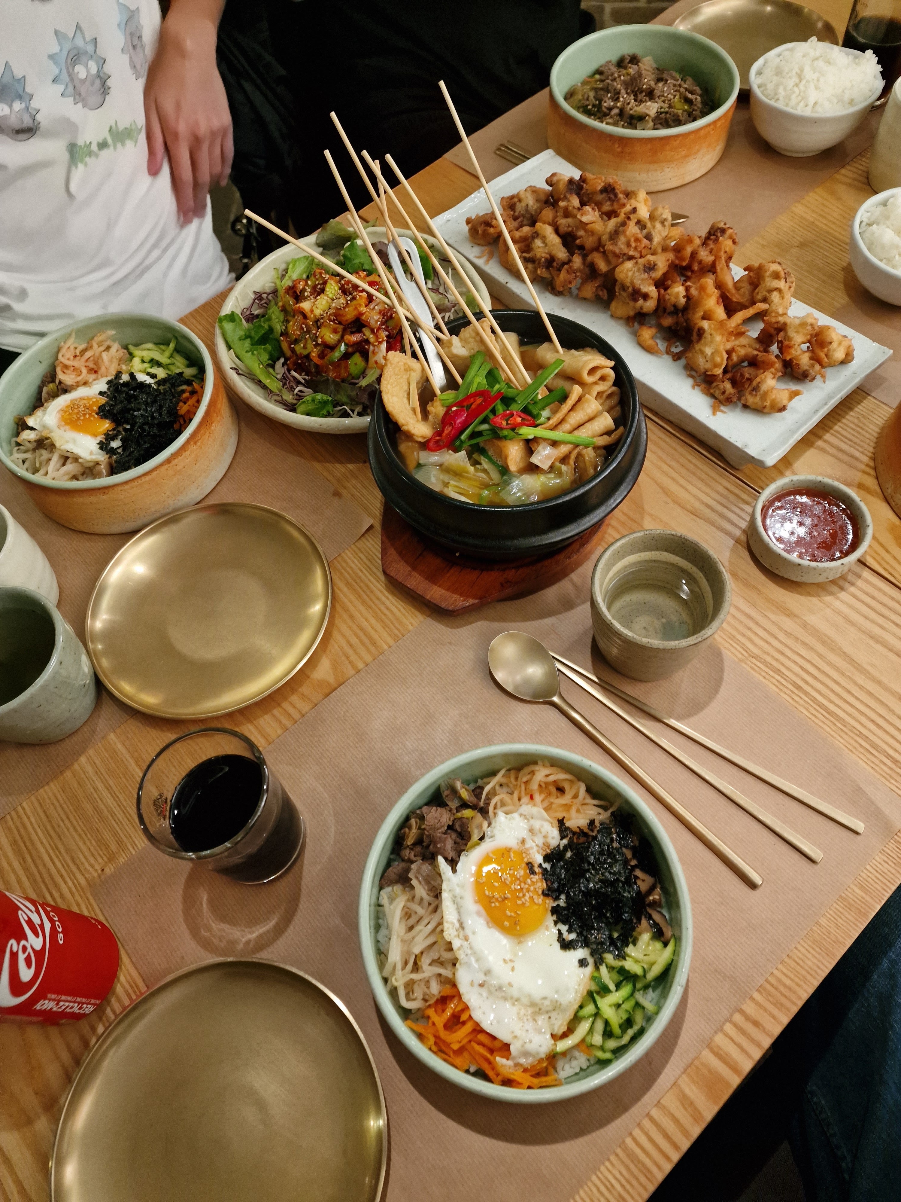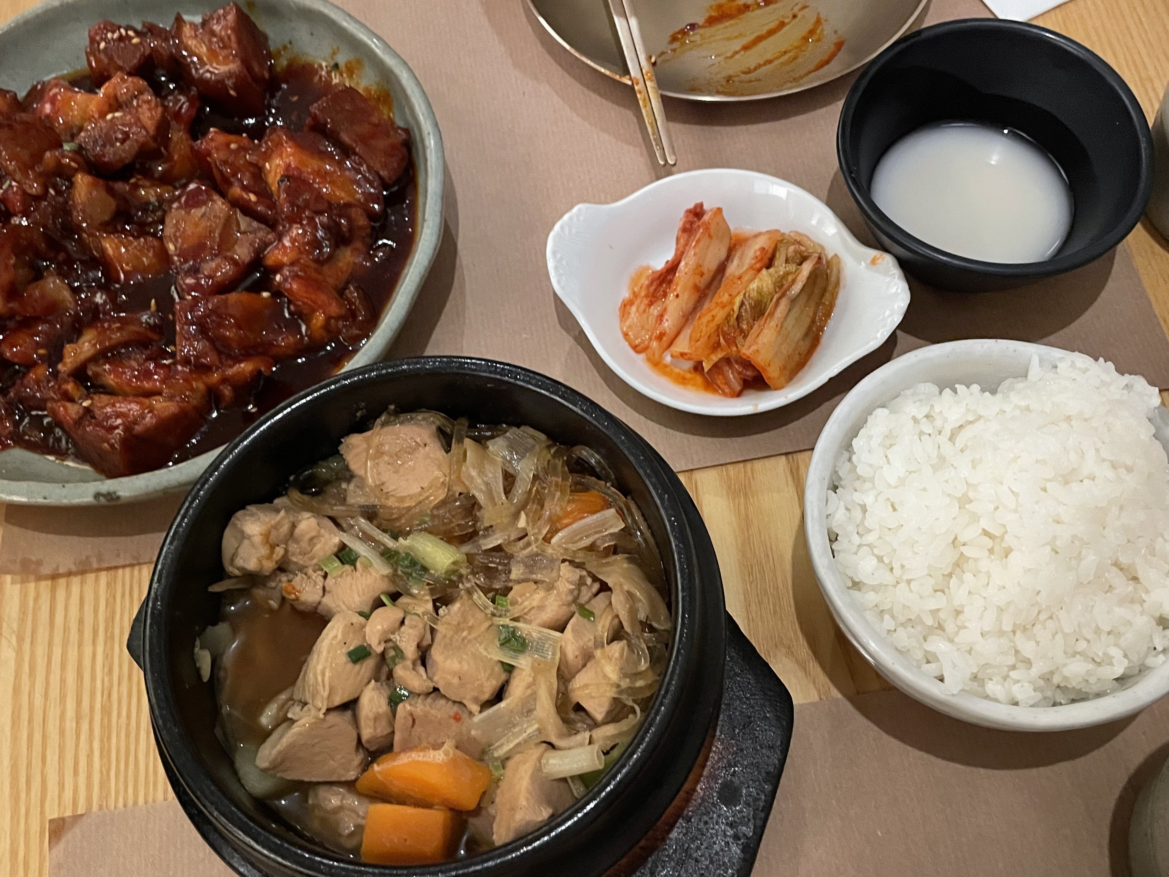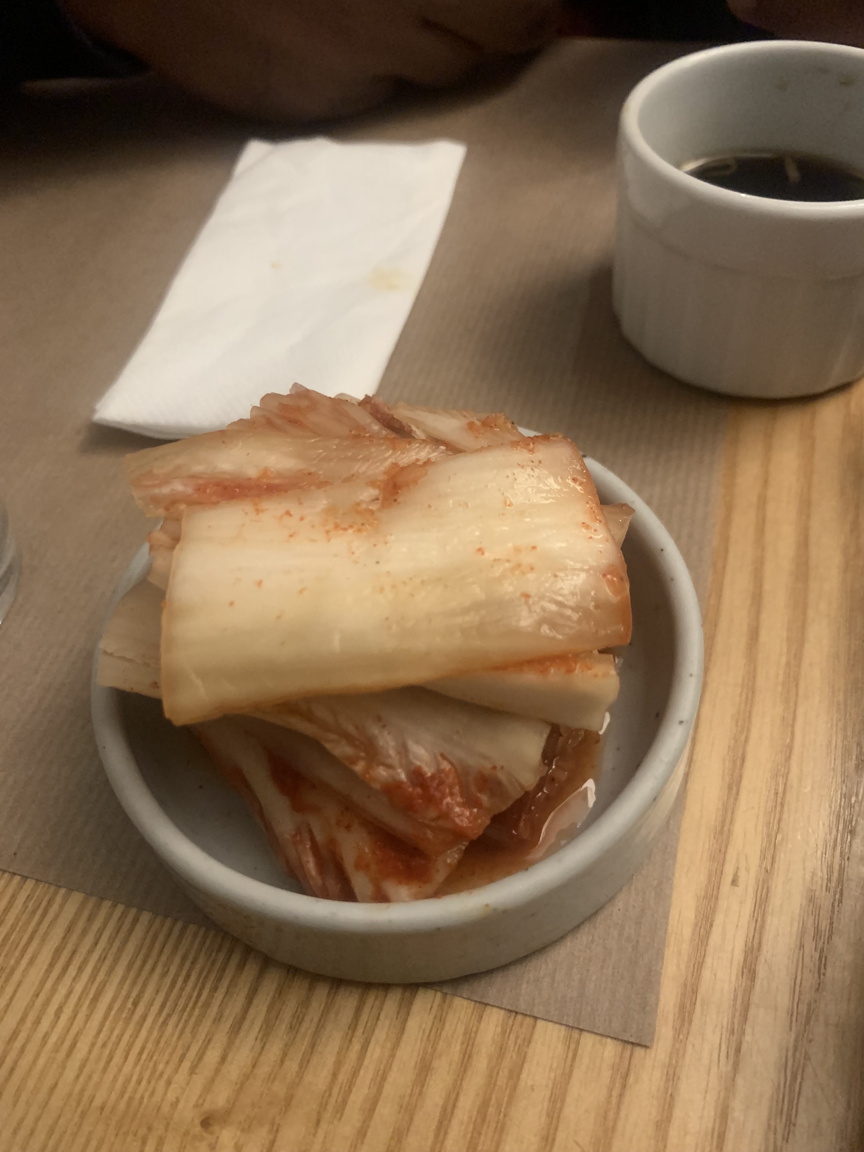 L'ambiance assez sympathique, les serveurs agréables. POURTANT je suis sincèrement déçue parce qu'il n'y avait pas des accompagnants/des petits plats à côté (Banchan) qui sont pour moi essentiels d'une cuisine coréenne. (on m'a expliqué qu'il n'y en a pas pendant le soir et que c'est seulement pour le midi, mais je ne trouve pas ça logique puisque le soir c'est plus cher.) C'était quand même pas mal la qualité de plat, mais ce n'était pas si bon non plus.
