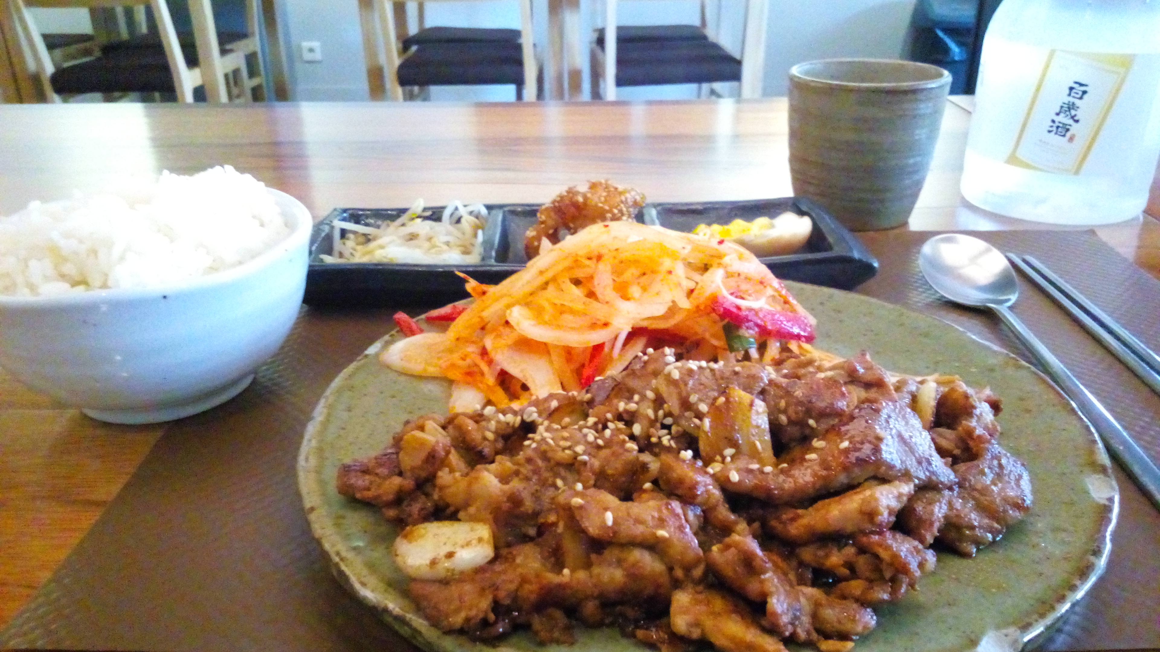 Le restaurant est joli et le service agréable. Ce sont les seuls points positifs car la nourriture n’est vraiment pas à la hauteur. Le kimchi est servi en supplément alors que d’habitude il est compris dans le prix des plats. C’est du kimchi industriel, le petit goût acide ne trompe pas. Le riz est trop cuit, un comble pour un restaurant coréen. Le reste est tristement banal.