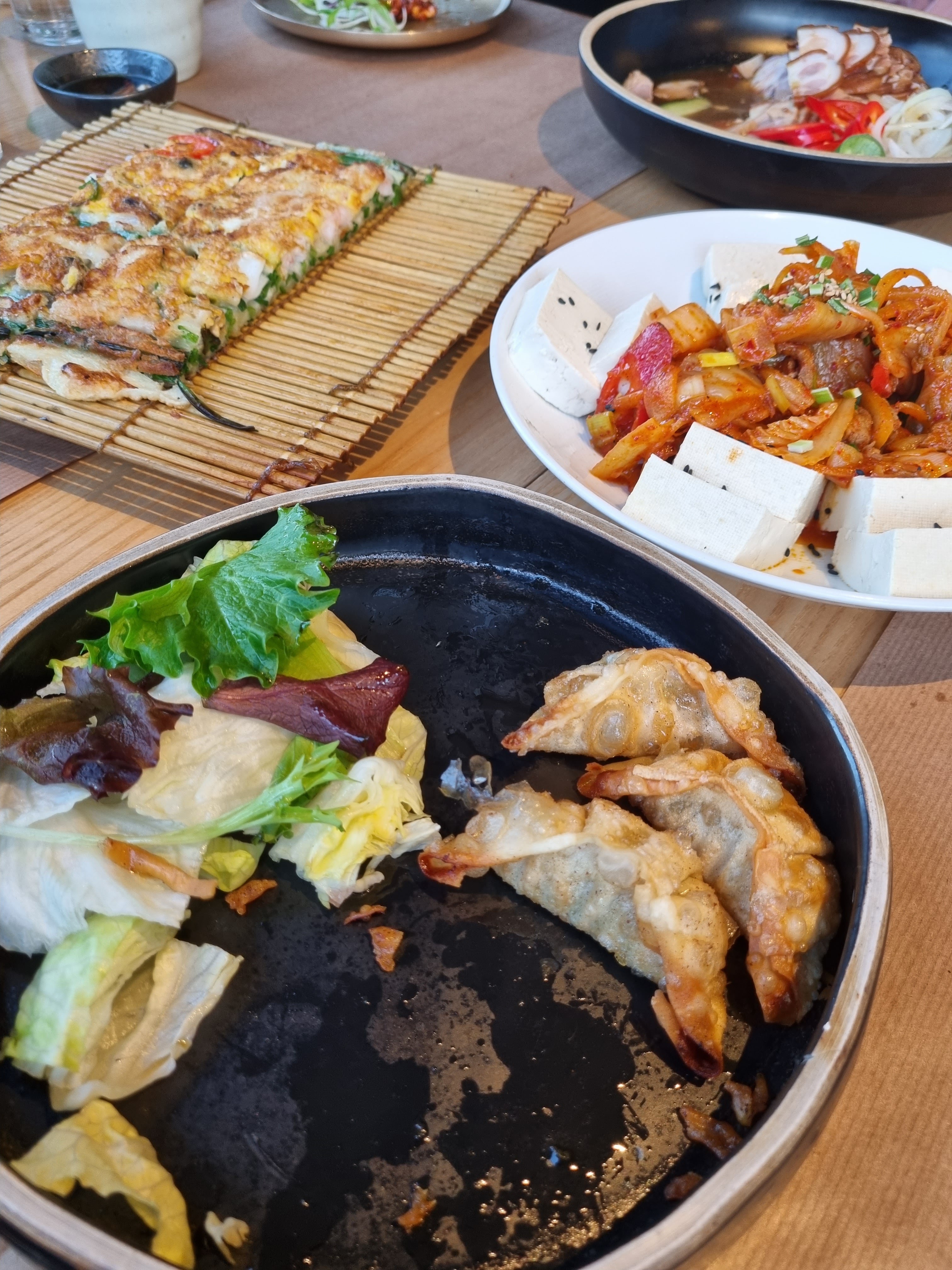 Accueil et endroit sympathique. Cependant les plats manquent d’assaisonnement: ragoût de kimchi très décevant et fade / friture de bulgogi sans intérêt/ poulet frit sans sauce. Déçue aussi par le plat de porc boullie. La crêpe au fruits de mer était ok. De plus, il n’y avait aucun banchan (petits accompagnements) servis avec les plats alors que dans les restaurants coréens normalement il y en a. Mini portion de kimchi à 5€ si on veut un banchan. Très déçue.