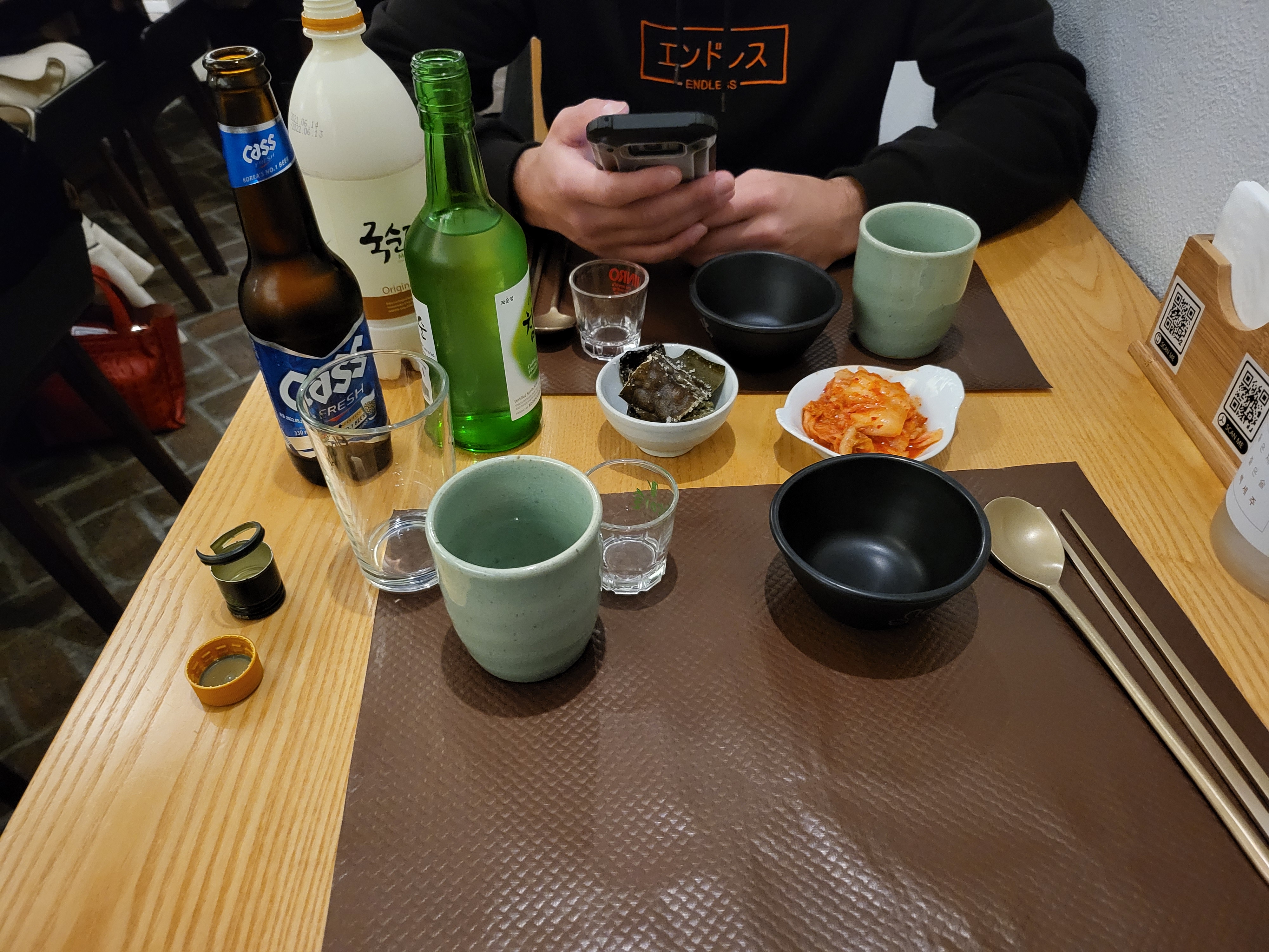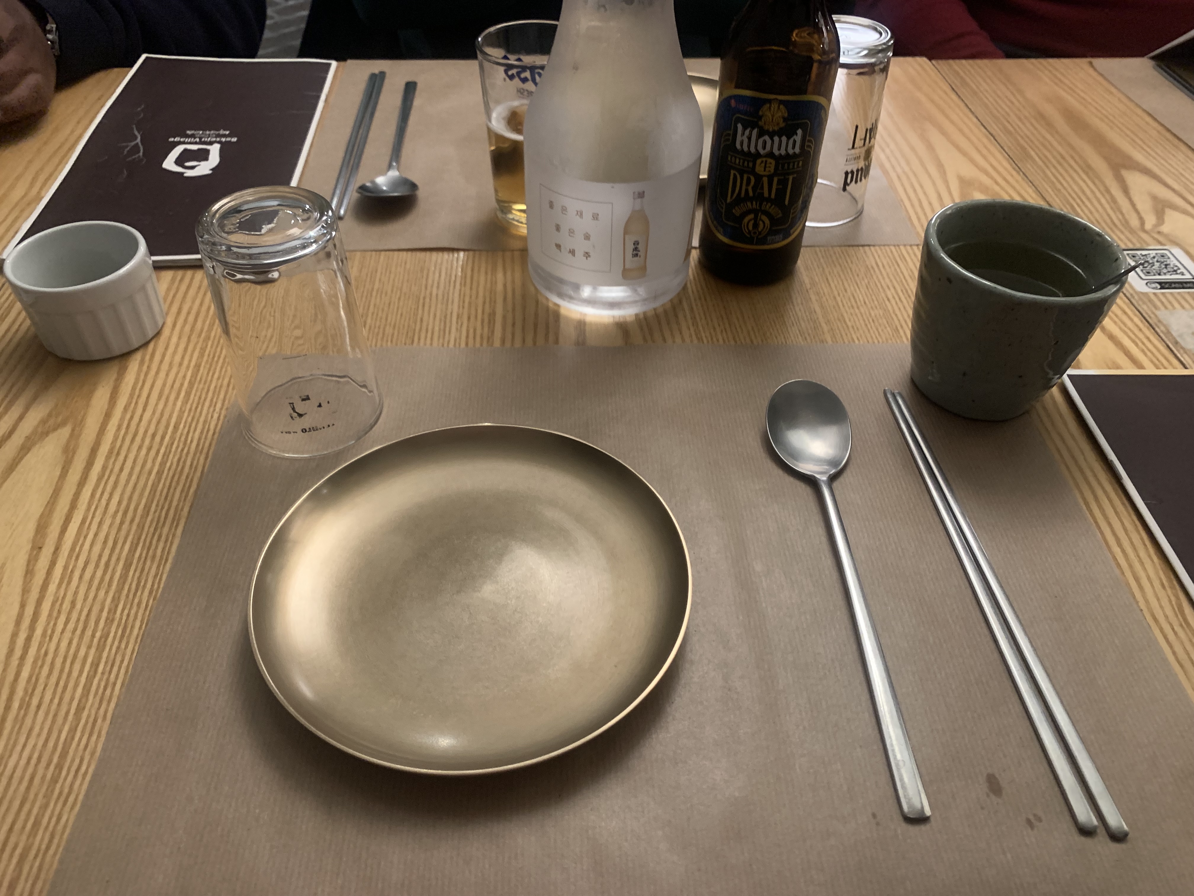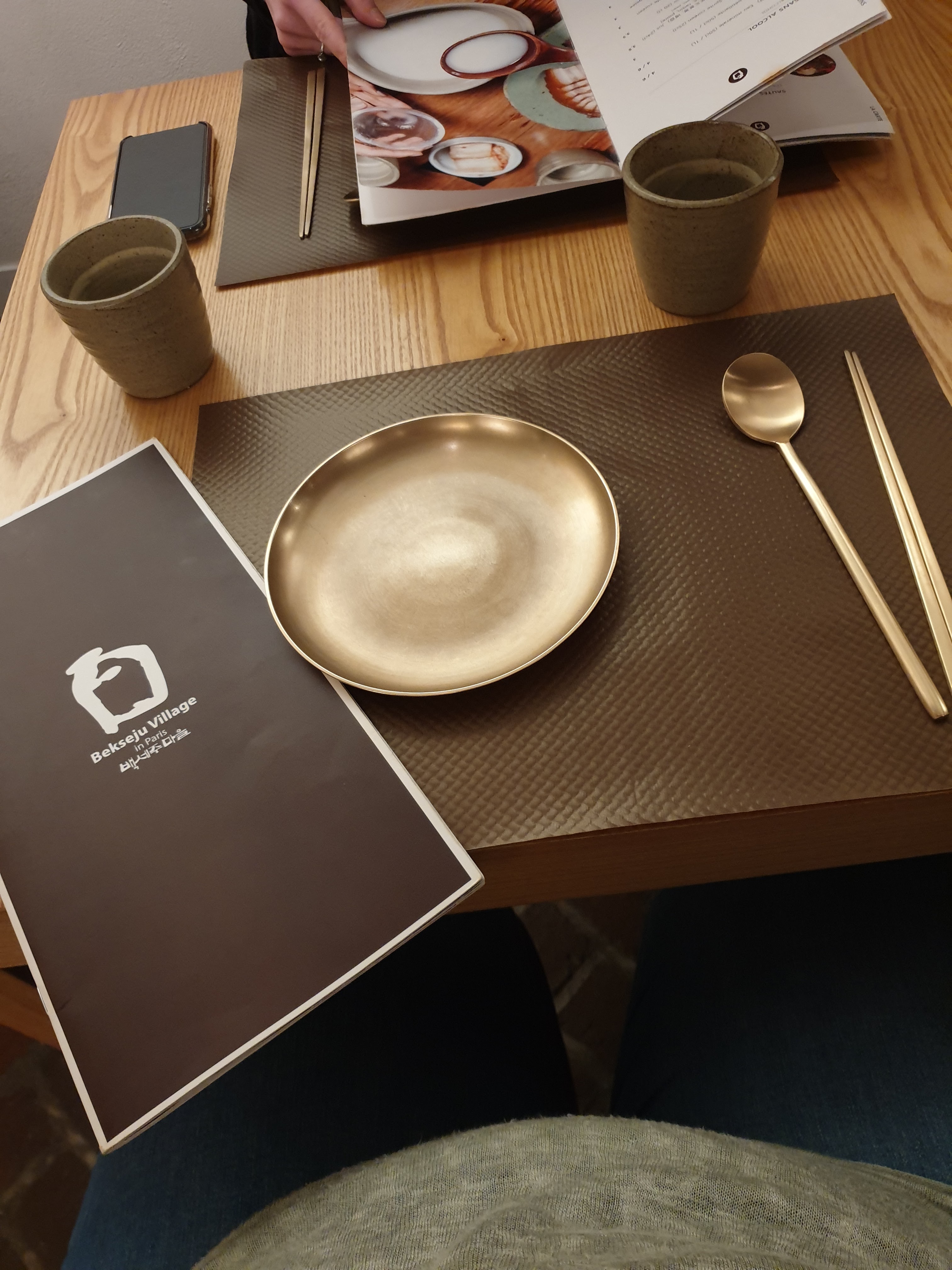 100% South-Korea, les couverts, les assiettes, le mobilier... Et la nourriture y est très bonne et typique du pays. Abordable si on se limite dans le nombre de plats, mais la note peut vite grimper tellement que c'est bon...