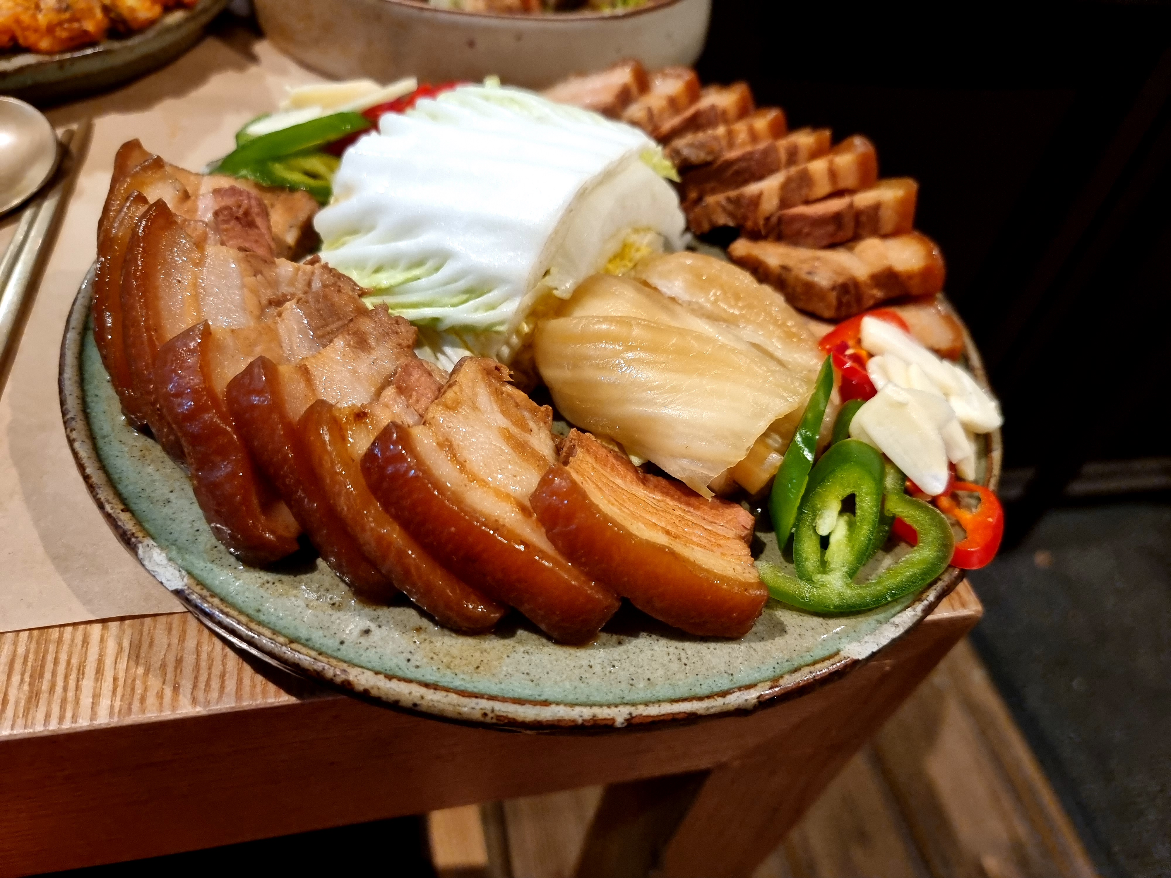 Je suis venu vers 13h, c'est moins affluent. J'ai pris Maekjeok Gui, grillades de porc à la sauce soja (13-15€ menu déjeuner, riz inclus). Il était fait à la commande ( non plat déjà cuit et réchauffé) et il était bon. PS. mes notes concernent seulement à ce plat, plus la décoration en bois très sympa du restaurant.