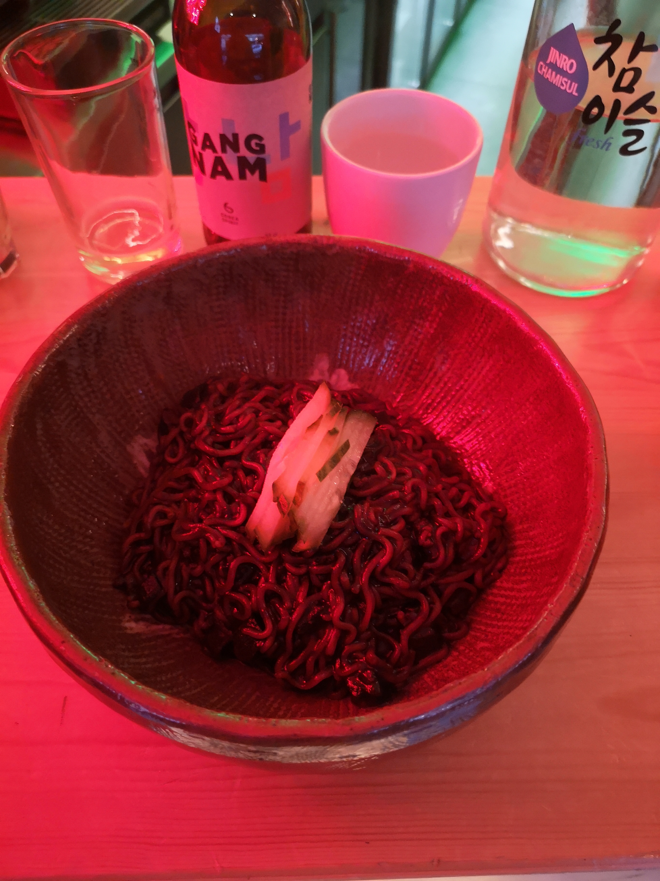 J'ai mangé du jjambbong et du soju ! Je l'ai mangé avec un ami français, et je suppose que c'était une erreur de s'attendre à des nouilles Jjamppong à Jjamppong. J'étais tellement déçu qu'il y ait des nouilles ramen dedans. C'est peut-être pour ça que la soupe était si grasse ! Je ne recommande pas le Jjambbong, mais je recommande d’opter pour le soju ! Le personnel était sympathique et gentil !