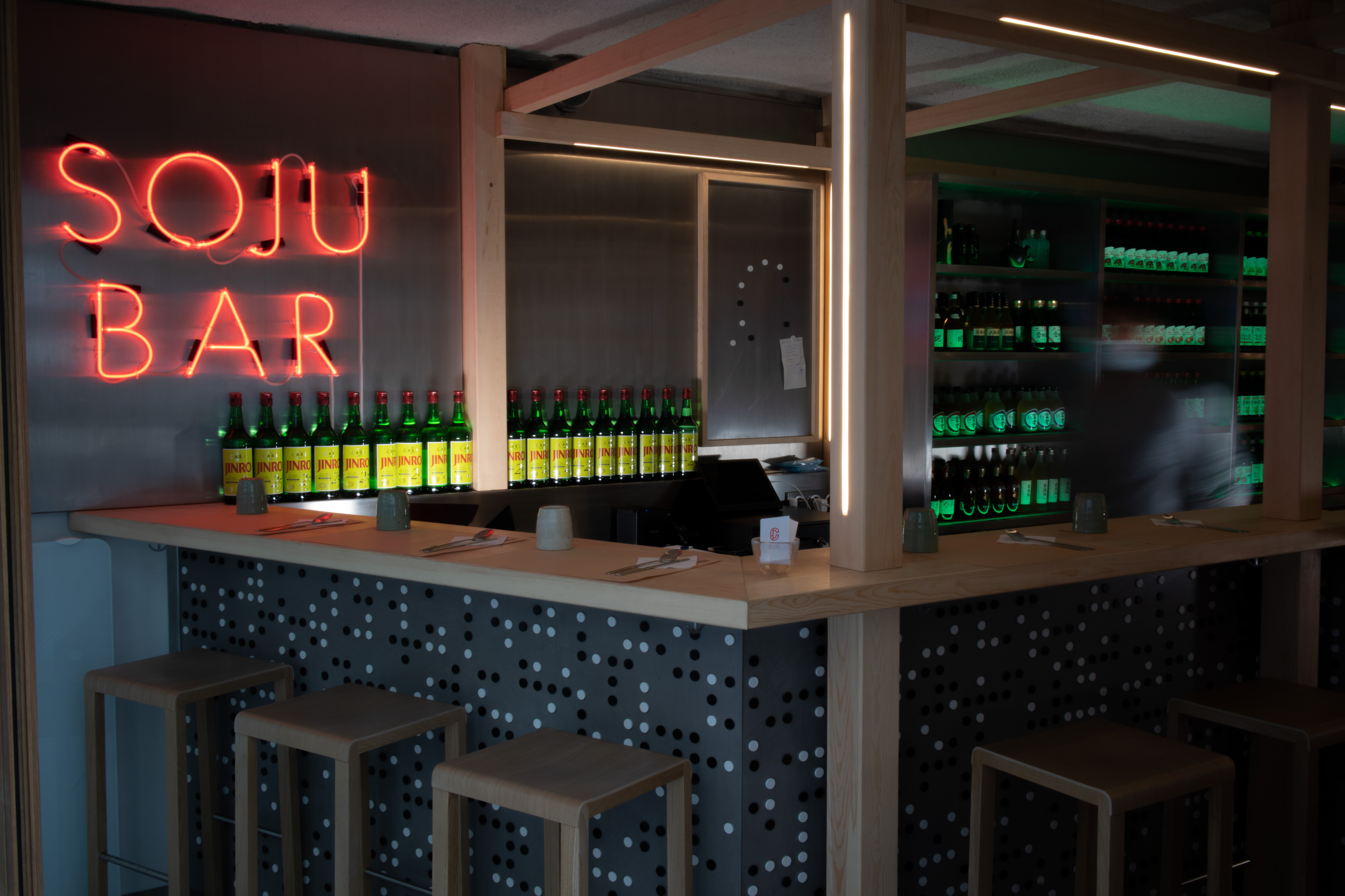 Bar - restaurant sympa avec une bonne sélection de sojus et plats coréens ! Le hobak jeon et le japchae étaient très bon et copieux. Aussi sympa pour un déjeuner rapide un midi qu’une soirée pour boire des verres de soju au bar !
