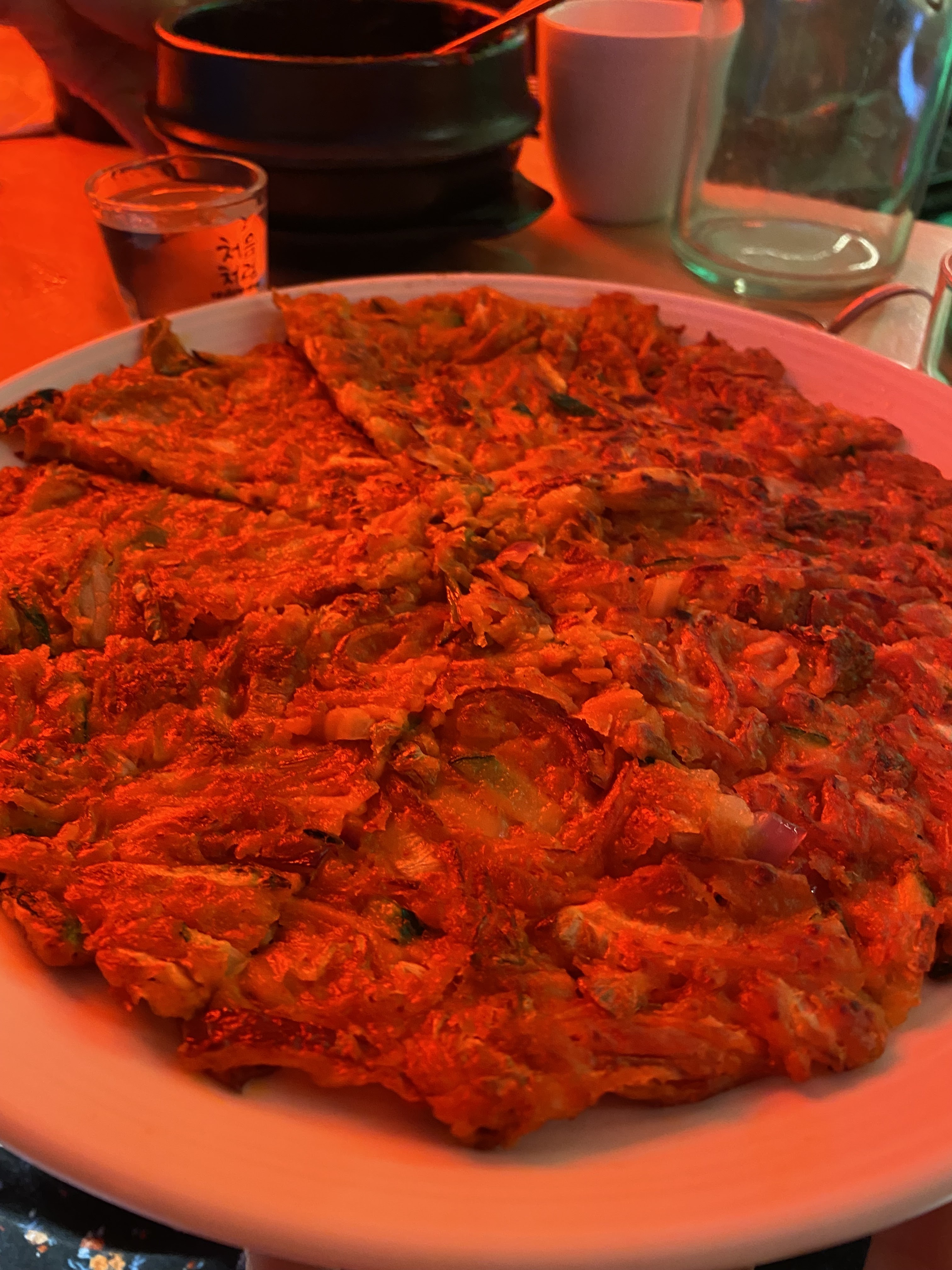 Super endroit coréen. Leurs crêpes au kimchi étaient folles. Nous avons également pris le poulet frit et les gyosas comme entrées qui étaient plutôt bonnes. La poitrine de porc et le bibimbap étaient très bons, mais ce qui m'a le plus étonné, c'est leur Kimchi, vinaigré et épicé comme je les aime. Nous nous sommes saoulés de sojus fruités qui ont agrémenté notre soirée. Nous sommes allés à la fraise, à la prune et au raisin wow !