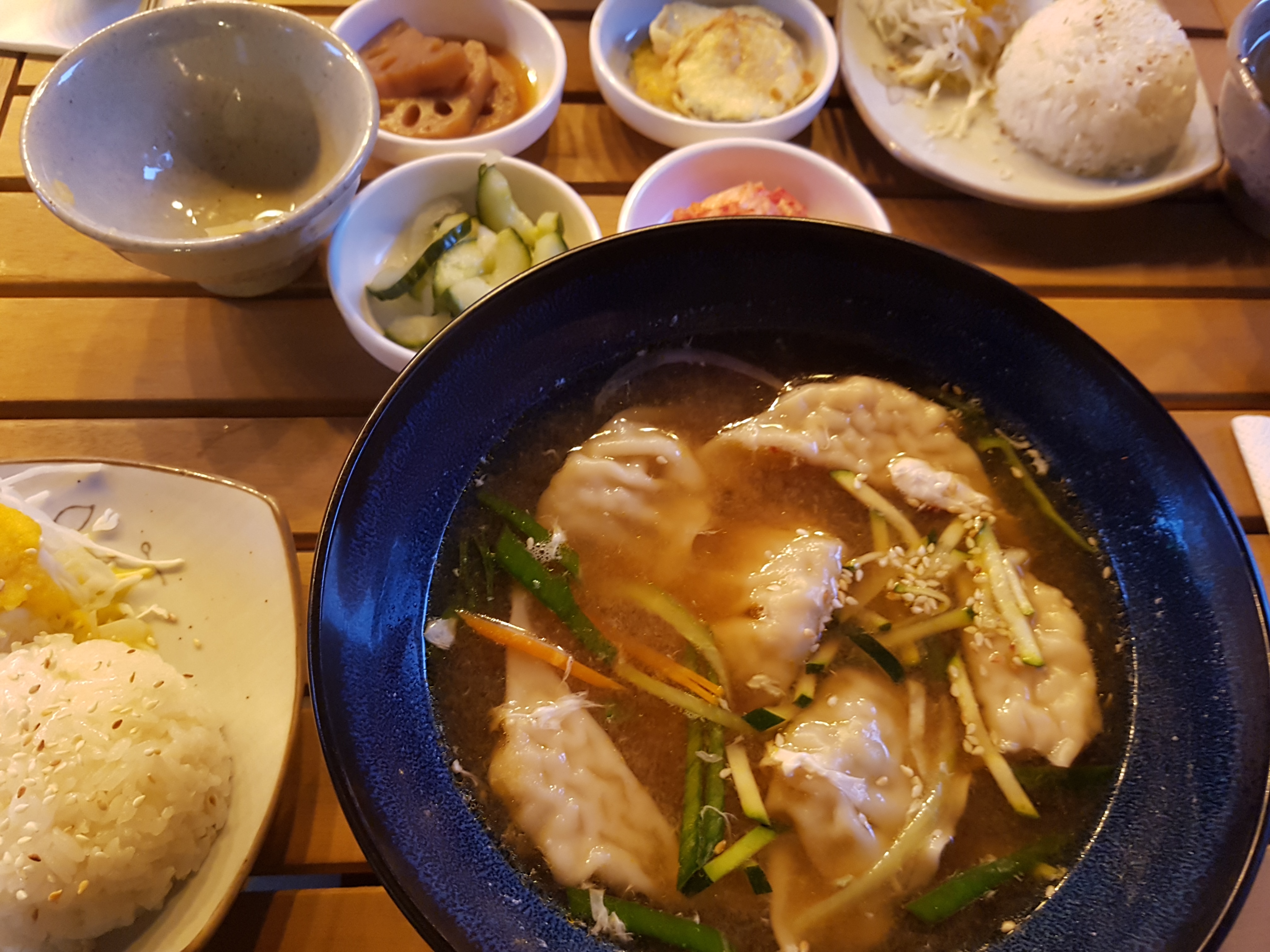 La nourriture est délicieuse (japchae - nouilles de patate douce, bibimbaps pleins de légumes et aux diverses viandes, soupe de raviolis gargantuesque, salade de calamar aux pommes, etc.) et le personnel très sympathique.