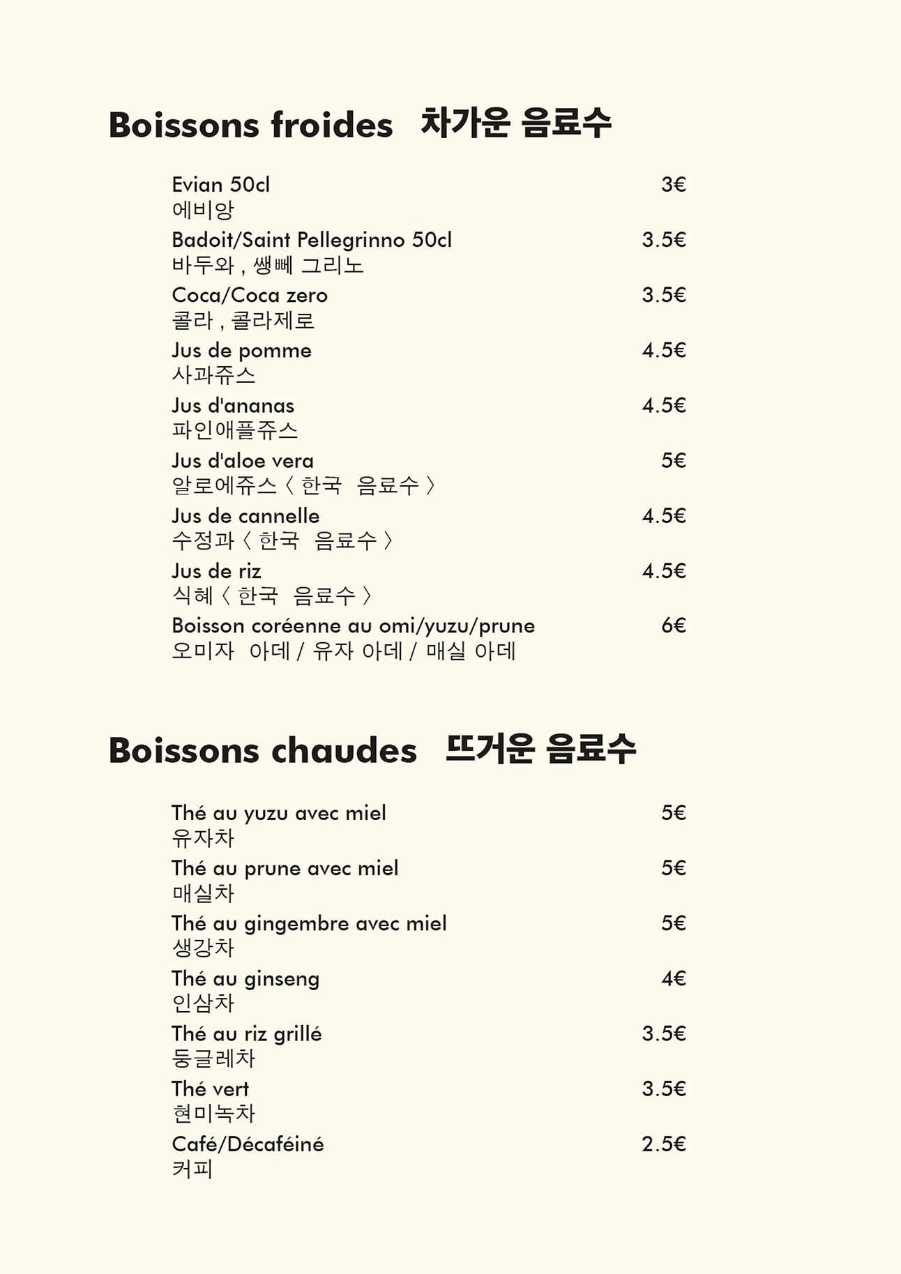 + Personnels très accueillants et gentils + De très bon bibimbap + le poulet à la sauce aigre douce est délicieux + Rapide - l’assiette du bibimbap n’est pas assez chaude