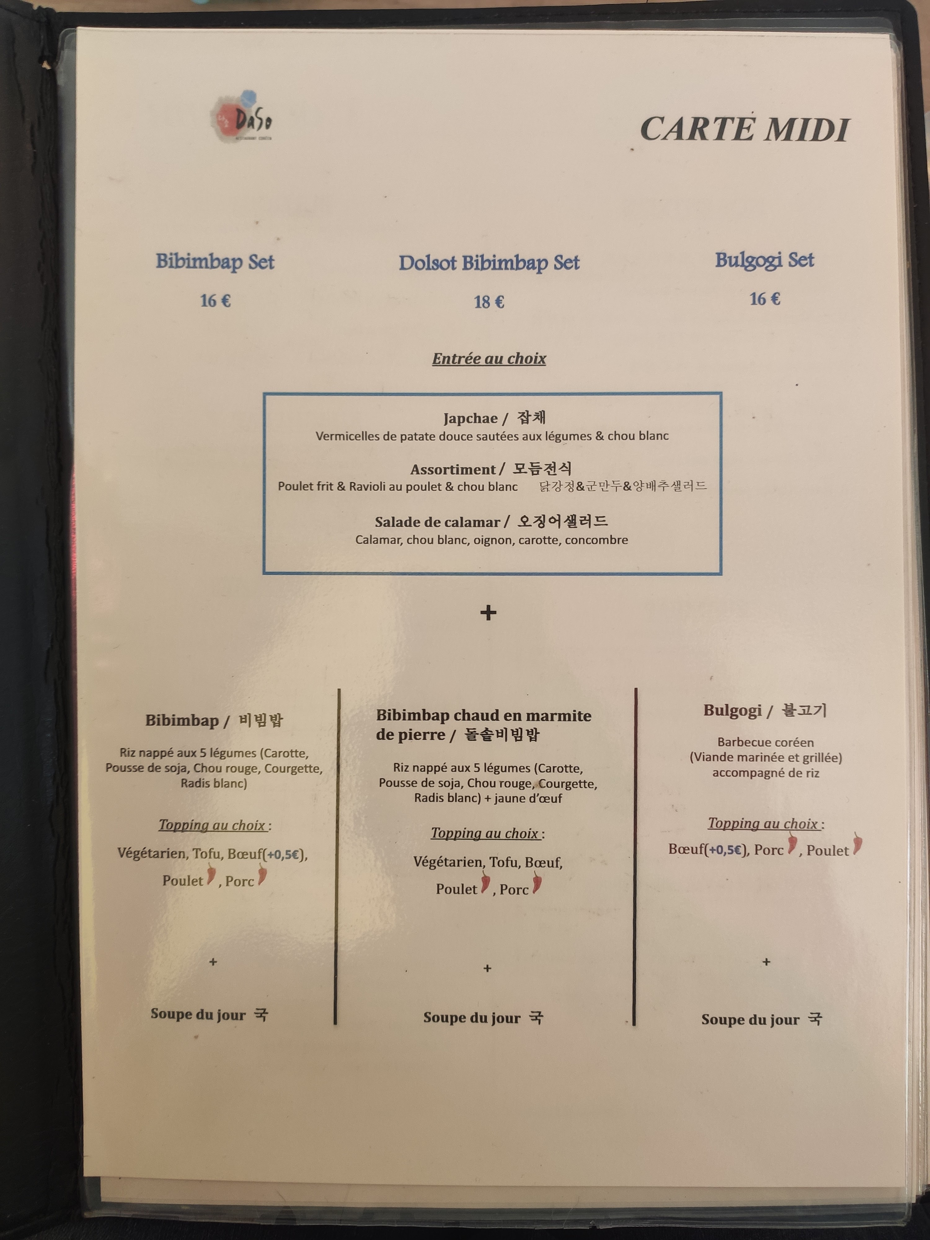 Pour le menu midi, petit portion, j'ai encore faim.D'habitude quand je mange le menu midi au korean ailleurs c'est bien généreux. Riz trop mouillé. Ne donne pas les légumes pour accompagner avec, il faut payer en plus. C'est le premier restaurant qui ne donne pas de légumes avec même si c'est le formule midi (16€) Trop cher pour ce qu'il y a dans l'assiette.
